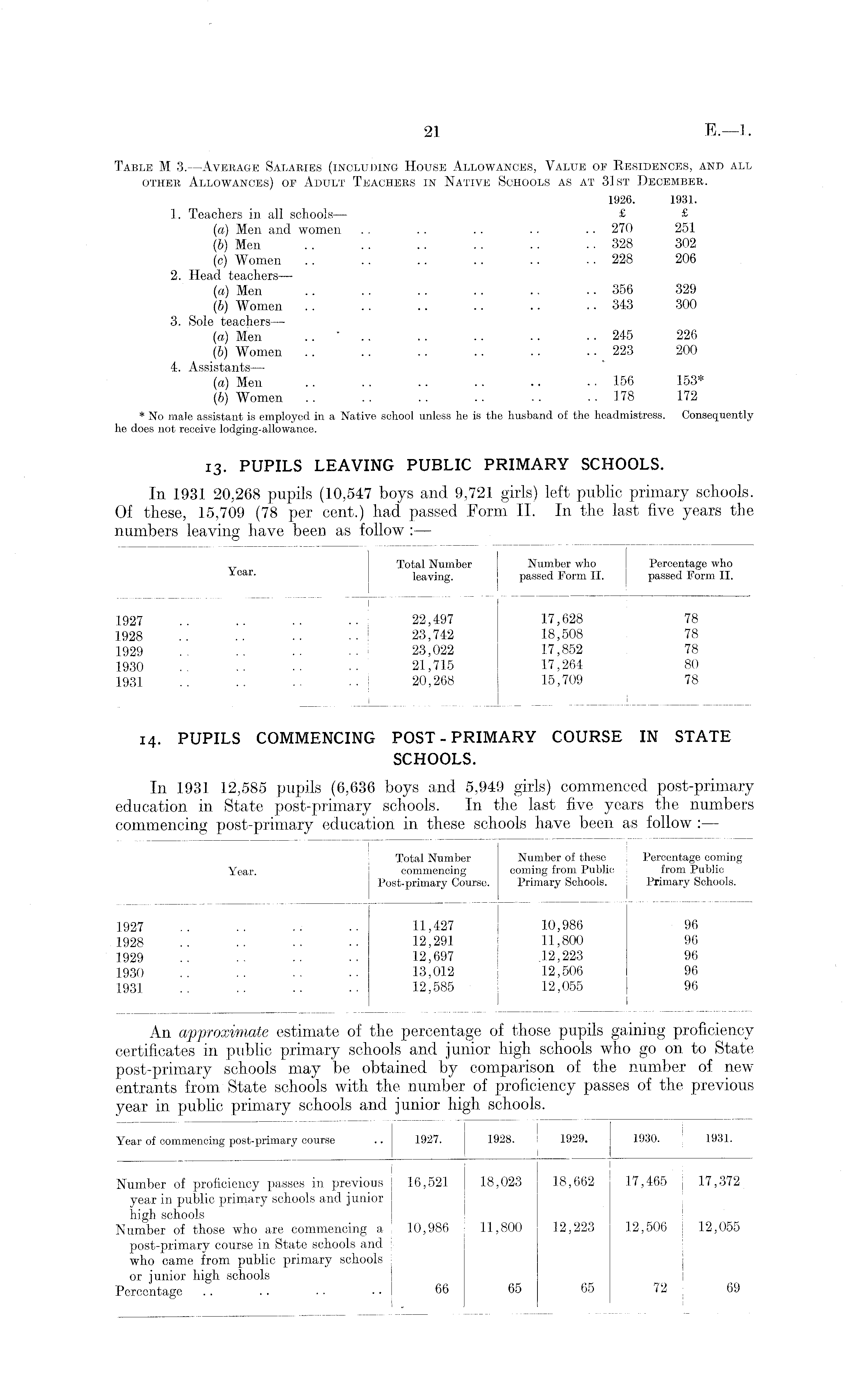 Table M 3.—Average Salaries (including House Allowances, Value op Residences, and all other Allowances) of Adult Teachers in Native Schools as at 31st December. 1926. 1931. 1. Teachers ill all schools— £ £ (a) Men and women .. . . . . .. .. 270 251 (b) Men .. .. .. .. .. .. 328 302 (c) Women . . .. .. .. .. . . 228 206 2. Head teachers — (a) Men .. .. .. .. .. • ■ 356 329 (b) Women .. .. .. .. .. .. 343 300 3. Sole teachers— (а) Men .. ' .. .. .. .. .. 245 226 (б) Women .. .. .. .. .. . • 223 200 4. Assistants— (а) Men .. . . .. .. .. . . 156 153* (б) Women .. .. .. .. ■. ■ • 178 172 *No male assistant is employed in a Native school unless he is the husband of the headmistress. Consequently he does not receive lodging-allowance. 13. PUPILS LEAVING PUBLIC PRIMARY SCHOOLS. In 1931 20,268 pupils (10,547 boys and 9,721 girls) left public primary schools. Of these, 15,709 (78 per cent.) had passed Form 11. In the last five years the numbers leaving have been as follow : —