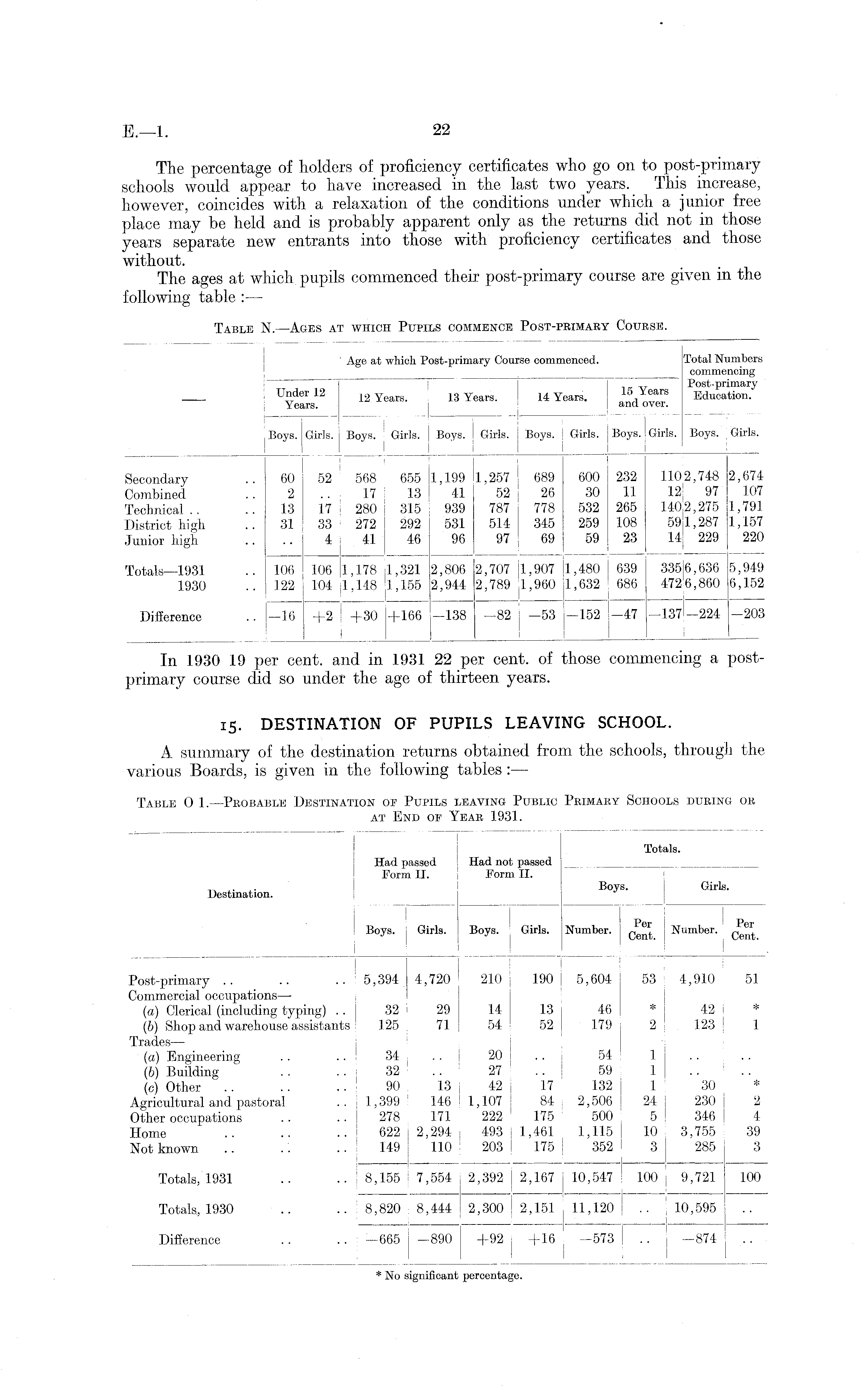 In 1930 19 per cent, and in 1931 22 per cent, of those commencing a postprimary course did so under the age of thirteen years. 15. DESTINATION OF PUPILS LEAVING SCHOOL. A summary of the destination returns obtained from the schools, through the various Boards, is given in the following tables :■ —-