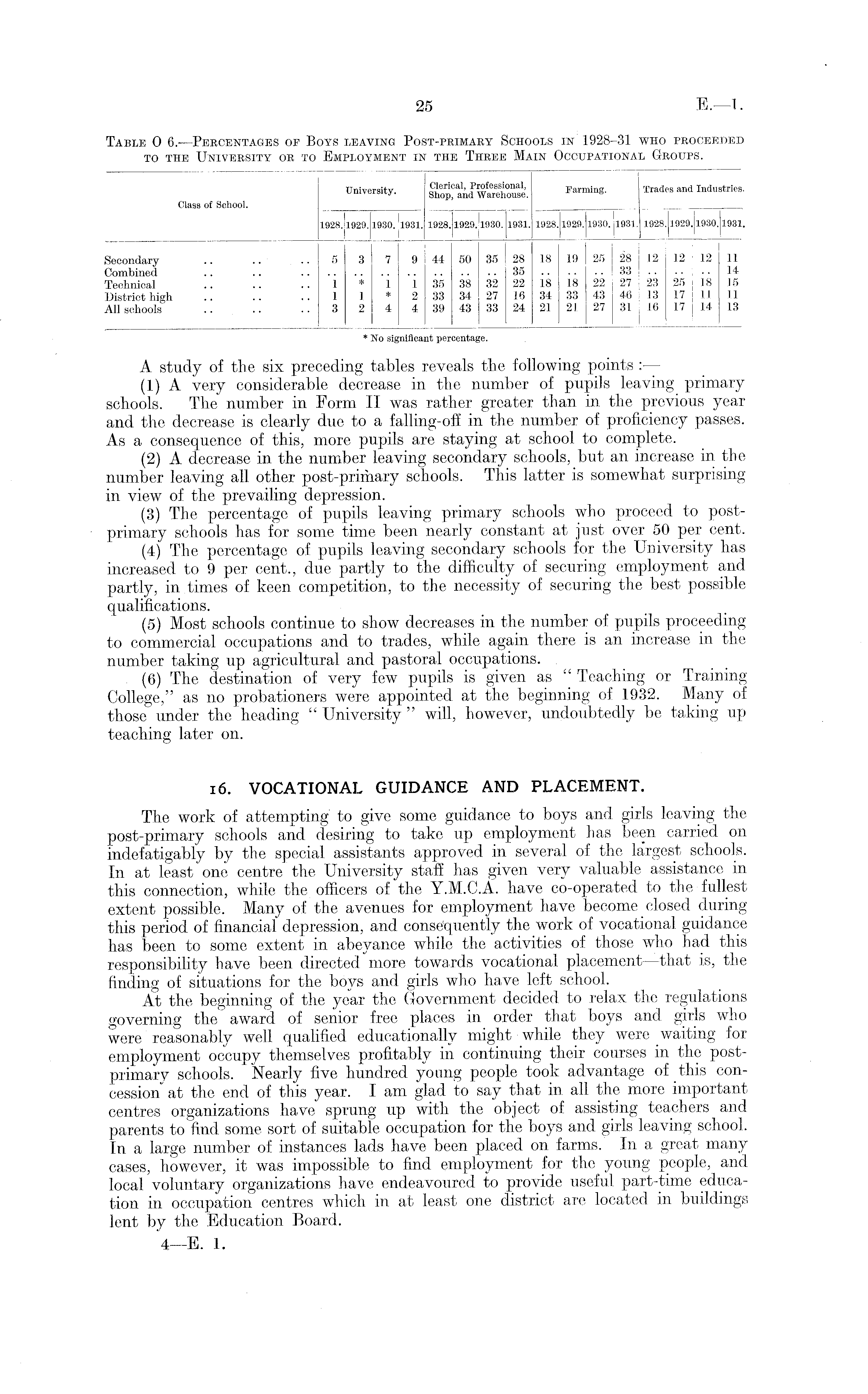 A study of the six preceding tables reveals the following points : — (1) A very considerable decrease in the number of pupils leaving primary schools. The number in Form II was rather greater than in the previous year and the decrease is clearly due to a falling-ofi in the number of proficiency passes. As a consequence of this, more pupils are staying at school to complete. (2) A decrease in the number leaving secondary schools, but an increase in the number leaving all other post-primary schools. This latter is somewhat surprising in view of the prevailing depression. (3) The percentage of pupils leaving primary schools who proceed to postprimary schools has for some time been nearly constant at just over 50 per cent. (4) The percentage of pupils leaving secondary schools for the University has increased to 9 per cent., due partly to the difficulty of securing employment and partly, in times of keen competition, to the necessity of securing the best possible qualifications. (5) Most schools continue to show decreases in the number of pupils proceeding to commercial occupations and to trades, while again there is an increase in the number taking up agricultural and pastoral occupations. (6) The destination of very few pupils is given as " Teaching or Training College," as no probationers were appointed at the beginning of 1932. Many of those under the heading " University " will, however, undoubtedly be taking up teaching later on. 16. VOCATIONAL GUIDANCE AND PLACEMENT. The work of attempting to give some guidance to boys and girls leaving the post-primary schools and desiring to take up employment has been carried on indefatigably by the special assistants approved in several of the la'rgest schools. In at least one centre the University staff has given very valuable assistance in this connection, while the officers of the Y.M.C.A. have co-operated to the fullest extent possible. Many of the avenues for employment have become _ closed during this period of financial depression, and consequently the work of vocational guidance has been to some extent in abeyance while the activities of those who had this responsibility have been directed more towards vocational placement —that is, the finding of situations for the boys and girls who have left school. At the beginning of the year the Government decided to relax the regulations governing the award of senior free places in order that boys and girls who were reasonably well qualified educationally might while they were waiting for employment occupy themselves profitably in continuing their courses in the postprimarv schools. Nearly five hundred young people took advantage of this concession at the end of this year. lam glad to say that in all the more important centres organizations have sprung up with the object of assisting teachers and parents to find some sort of suitable occupation for the boys and girls leaving school, [n. a large number of instances lads have been placed on farms. In a great many cases, however, it was impossible to find employment for the young people, and local voluntary organizations have endeavoured to provide useful part-time education in occupation centres which in at least one district are located in buildings lent by the Education Board. 4—E. 1.