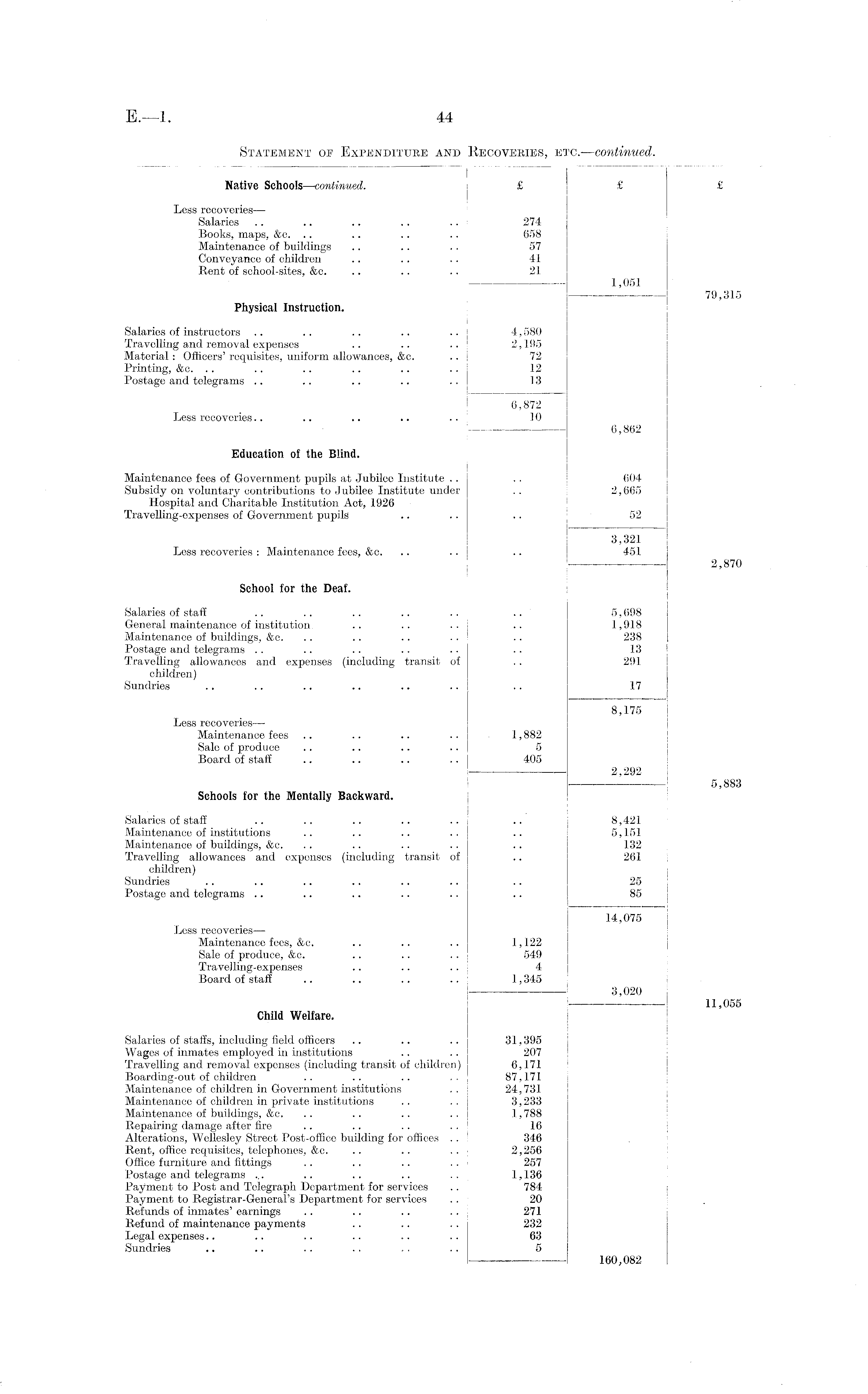 . I Native Schools—continued. I £ £ £ Less recoveries— Salaries .. .. .. .. .. 274 Books, maps, &e. .. .. .. .. 658 Maintenance of buildings .. .. .. 57 Conveyance of children .. .. .. 41 Rent of school-sites, &c. .. .. .. 21 1,051 79,315 Physical Instruction. Salaries of instructors .. .. .. .. .. 4,580 Travelling and removal expenses .. .. .. 2,195 Material: Officers' requisites, uniform allowances, &c. .. 72 Printing, &c. .. .. .. .. .. .. 12 Postage and telegrams .. .. .. .. .. 13 6,872 Less recoveries.. .. .. .. .. 10 6,862 Education of the Blind. Maintenance fees of Government pupils at Jubilee Institute .. , . 604 Subsidy on voluntary contributions to Jubilee Institute under .. 2,665 Hospital and Charitable Institution Act, 1926 Travelling-expenses of Government pupils .. .. .. 52 3,321 Less recoveries: Maintenance fees, &c. .. .. .. 451 2,870 School for the Deaf. Salaries of staff .. .. .. .. . . .. 5,698 General maintenance of institution .. .. .. .. 1,918 Maintenance of buildings, &c. .. .. .. .. .. 238 Postage and telegrams .. .. .. .. .. .. 13 Travelling allowances and expenses (including transit of .. 291 children) Sundries .. .. .. .. .. .. .. 17 8,175 Less recoveries— Maintenance fees .. .. .. ■ • 1,882 Sale of produce .. .. .. .. 5 Board of staff .. .. .. .. 405 — 2,292 5,883 Schools for the Mentally Backward. Salaries of staff .. .. .. .. .. .. 8,421 Maintenance of institutions .. .. .. .. .. 5,151 Maintenance of buildings, &c. .. .. .. .. .. 132 Travelling allowances and expenses (including transit of .. 261 children) Sundries .. .. .. .. .. .. .. 25 Postage and telegrams .. .. .. .. .. .. 85 14,075 Less recoveries— Maintenance fees, &c. .. .. .. 1,122 Sale of produce, &c. .. .. .. 549 Travelling-expenses .. .. .. 4 Board of staff .. .. .. .. 1,345 3,020 11,055 Child Welfare. Salaries of staffs, including field officers .. .. .. 31,395 Wages of inmates employed in institutions .. .. 207 Travelling and removal expenses (including transit of children) 6,171 Boarding-out of children .. .. .. .. 87,171 Maintenance of children in Government institutions .. 24,731 Maintenance of children in private institutions .. . . 3,233 Maintenance of buildings, &c. .. .. .. .. 1,788 Repairing damage after fire .. .. . . . . 16 Alterations, Wellesley Street Post-office building for offices .. 346 Rent, office requisites, telephones, &c. .. .. .. 2,256 Office furniture and fittings .. .. .. .. 257 Postage and telegrams ... .. .. .. .. 1,136 Payment to Post and Telegraph Department for services .. 784 Payment to Registrar-General's Department for services 20 Refunds of inmates' earnings .. .. .. .. 271 Refund of maintenance payments .. .. . . 232 Legal expenses.. .. .. .. .. .. 63 Sundries .. .. .. . . . . .. 5 160,082