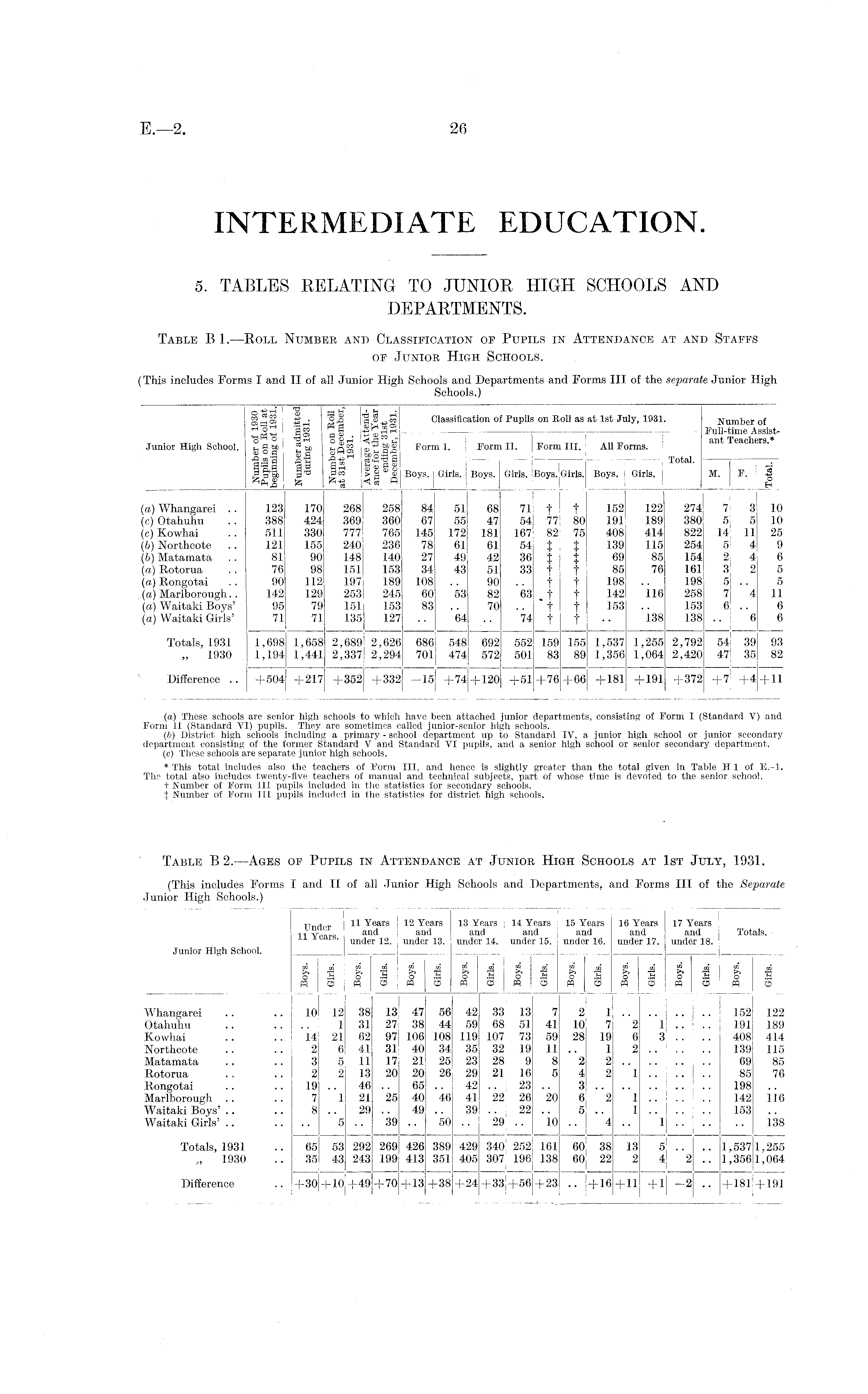 Table B1. —Roll Number and Classification of Pupils in Attendance at and Staffs of Junior High Schools.