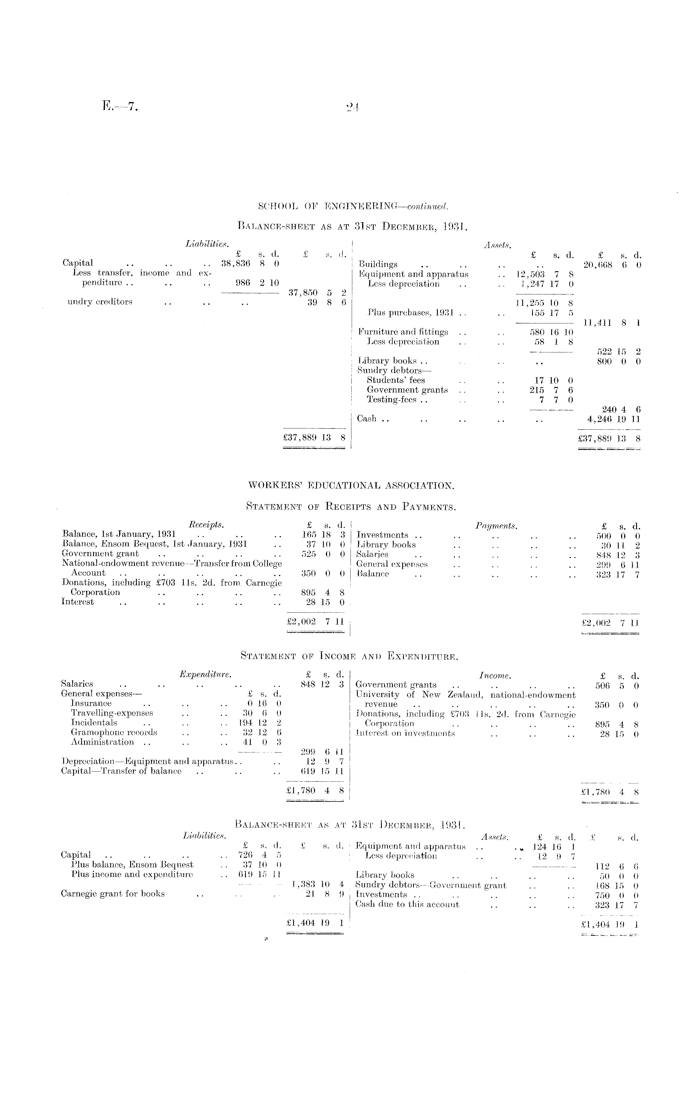 SCHOOL OF ENGlNEERlNG—continued. Balance-sheet as at 31st December, 1931. Liabilities. Assets. £ s. d. £ s. d. £ s. d. £ s. d. Capital .. .. .. 38,836 8 0 Buildings .. .. .. .. 20,668 6 0 Less transfer, income and ex- Equipment and apparatus .. 12,503 7 8 penditure .. .. .. 986 210 Less depreciation .. .. 1,247 17 0 37,850 5 2 undry creditors .. .. .. 39 8 6 11,255 10 8 Plus purchases, 1931 .. .. 155 17 5 — 11,411 8 1 Furniture and fittings .. ~ 580 16 10 Less depreciation .. .. 58 1 8 522 .15 2 Library books .. .. .. .. 800 0 0 Sundry debtors— Students' fees .. .. 17 10 0 Government grants .. .. 215 7 6 Testing-fees .. , . .. 7 7 0 240 4 6 Cash.. .. .. .. .. 4,246 19 11 £37,889 13 8 £37,889 13 8 WORKERS' EDUCATIONAL ASSOCIATION. Statement of Receipts and Payments. Receipts. £ s. d. Payments. £ s. d. Balance, Ist January, 1931 .. .. .. 165 18 3 Investments .. .. .. .. .. 500 0 0 Balance, Ensom Bequest, Ist January, 1931 .. 37 10 0 Library books .. .. .. .. 30 11 2 Government grant .. .. .. .. 525 0 0 Salaries .. .. . . .. .. 848 12 3 National-endowment revenue—Transfer from College General expenses .. .. .. .. 299 6 11 Account .. .. . . .. .. 350 0 0 Balance .. .. .. .. .. 323 17 7 Donations, including £703 lis. 2d. from Carnegie Corporation .. .. .. .. 895 4 8 Interest .. .. .. .. .. 28 15 0 £2,002 7 11 £2,002 7 11 Statement of Income and Expenditure. Expenditure. £ s. d. Income. £ s. d. Salaries .. .. .. .. .. 848 12 3 Government grants .. .. .. .. 506 5 0 General expenses — £ s. d. University of New Zealand, national-endowment Insurance .. .. .. 016 0 revenue .. .. .. .. .. 350 0 0 Travelling-expenses ... .. 30 6 0 Donations, including £703 lis. 2d. from Carnegie Incidentals . . .. .. 194 12 2 Corporation . . .. .. .. 895 4 8 Gramophone records .. .. 32 12 6 Interest on investments .. .. .. 28 15 0 Administration .. .. .. 41 0 3 299 6 11 Depreciation—Equipment and apparatus.. .. 12 9 7 Capital—Transfer of balance .. .. .. 619 15 1.1 £1,780 4 8 £1,780 4 8 Balance-sheet as at 31st December, 1931. Liabilities. Assets. £ s. d. £ s. d. £ s. d. £ s. d. Equipment and apparatus .. . „ 124 16 1 Capital .. .. .. .. 726 4 5 Less depreciation .. . . 12 9 7 Plus balance, Ensom Bequest .. 37 10 0 112 6 6 Plus income and expenditure .. 619 15 11 Library books .. .. .. .. 50 0 0 — 1,383 10 4 Sundry debtors —Government grant .. .. 168 15 0 Carnegie grant for books .. . . 21 8 9 Investments .. .. .. .. .. 750 0 0 Cash due to this account .. .. .. 323 17 7 £1,404 19 1 £1,404 19 1 •— _ "