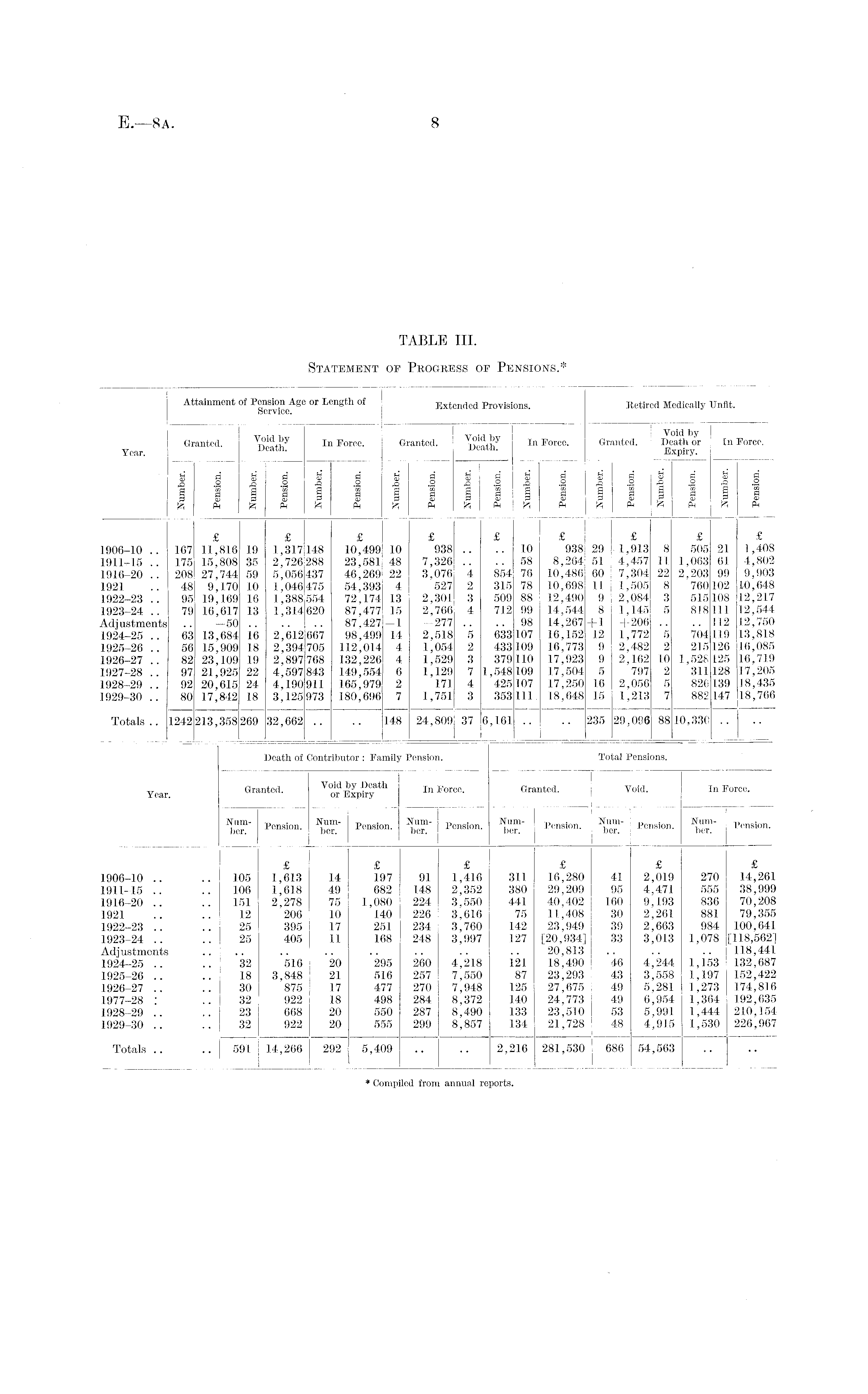 Attainment of or Length of Extended Provisions. Retired Medically Unfit. , v , Void by Granted. V^,£ y In Force. Granted. In Force. Granted. Death or In Force. Year. Death. L)eatn - Expiry. §3 a fe P §3 P §3* P S3 a & 9 & 9 S3 a .S3 a ,o .2 Ja .2 & .2 rO .2 !a .2 2 .2 rO .2 -2 -2 -2 -2 S § S g g 3 Sggagaga|a|a a s a & ,p <u a © a o> a u ft Ah ft Ah & Ah & Ah ft Ah ft Ah ft . Ah 3 Ah ft An £ £ £ £ £ £ £ ££ 1906-10 .. 167 11,816 19 1,317148 10,499 10 938 .. .. 10 938 29 1,913 8 505 21 1,408 1911-15 .. 175 15,808 35 2,726 288 23,581 48 7,326 .. .. 58 8,264 51 4,457 11 1,063 61 4,802 1916-20 .. 208 27,744 59 5,056437 46,269 22 3,076 4 854 76 10,486 60 7,304 22 2,203 99 9,903 1921 .. 48 9,170 10 1,046475 54,393 4 527 2 315 78 10,698 11 1,505 8 760102 10,648 1922-23 .. 95 19,169 16 1,388554 72,174 13 2,301 3 509 88 12,490 9 2,084 3 515108 12,217 1923-24 .. 79 16,617 13 1,314620 87,477 15 2,766 4 712 99 14,544 8 1,145 5 818111 12,544 Adjustments .. -50 87,427 -1 -277 .. ..98 14,267 +] +206 112 12,750 1924-25 .. 63 13,684 16 2,612 667 98,499 14 2,518 5 633107 16,152 12 1,772 5 704119 13,818 1925-26 .. 56 15,909 18 2,394 705 112,014 4 1,054 2 433 109 16,773 9 2,482 2 215126 16,085 1926-27 .. 82 23,109 19 2,897 768 132,226 4 1,529 3 379110 17,923 9 2,162 10 1,528 125 16,719 1927-28 .. 97 21,925 22 4,597843 149,554 6 1,129 7 1,548109 17,504 5 797 2 311 128 17,205 1928-29 .. 92 20,615 24 4,190911 165,979 2 171 4 425 107 17,250 16 2,056 5 826 139 18,435 1929-30 .. 80 17,842 18 3,125973 180,696 7 1,751 3 353 111 18,648 15 1,213 7 882 147 18,766 Totals.. 1242 213,358 269 32,662 .. .. 148 24,809 37 6,161 235 29,096 88 10,330 .. ! - ' Death of Contributor : Family Pension. Total Pensions. Year Granted. Y or Expiry^ 11 In F ° rCe ' Granted. Void. In Force. Pension. Pension. Pension. Pension. Pension. Pension. £ £ £ £ £ £ 1906-10 .. .. 105 1,613 14 197 91 1,416 311 16,280 41 2,019 270 14,261 1911-15 .. .. 106 1,618 49 682 148 2,352 380 29,209 95 4,471 555 38,999 1916-20 .. .. - 151 2,278 75 1,080 224 3,550 441 40,402 160 9,193 836 70,208 1921 .. .. 12 206 10 140 226 3,616 75 11,408 30 2,261 881 79,355 1922-23 .. .. 25 395 17- 251 234 3,760 142 23,949 39 2,663 984 100,641 1923-24 .. .. 25 405 11 168 248 3,997 127 [20,934] 33 3,013 .1,078 [118,562] Adjustments .. .. .. .. .. .. .. .. 20,813 .. .. .. 118,441 1924-25 .. .. 32 516 20 295 260 4,218 121 18,490 46 4,244 1,153 132,687 1925-26 .. .. 18 3,848 21 516 257 7,550 87 23,293 43 3,558 1,197 152,422 1926-27 .. .. 30 875 17 477 270 7,948 125 27,675 49 5,281 1,273 174,816 1977-28 : ..32 922 18 498 284 8,372 140 24,773 49 6,954 1,364 192,635 1928-29 .. .. 23 668 20 550 287 8,490 133 23,510 53 5,991 1,444 210,154 1929-30 .. .. 32 922 20 555 299 8,857 134 21,728 48 4,915 1,530 226,967 Totals.. .. 591 14,266 292 i 5,409 .. .. 2,216 281,530 686 54,563 * Compiled from annual reports.