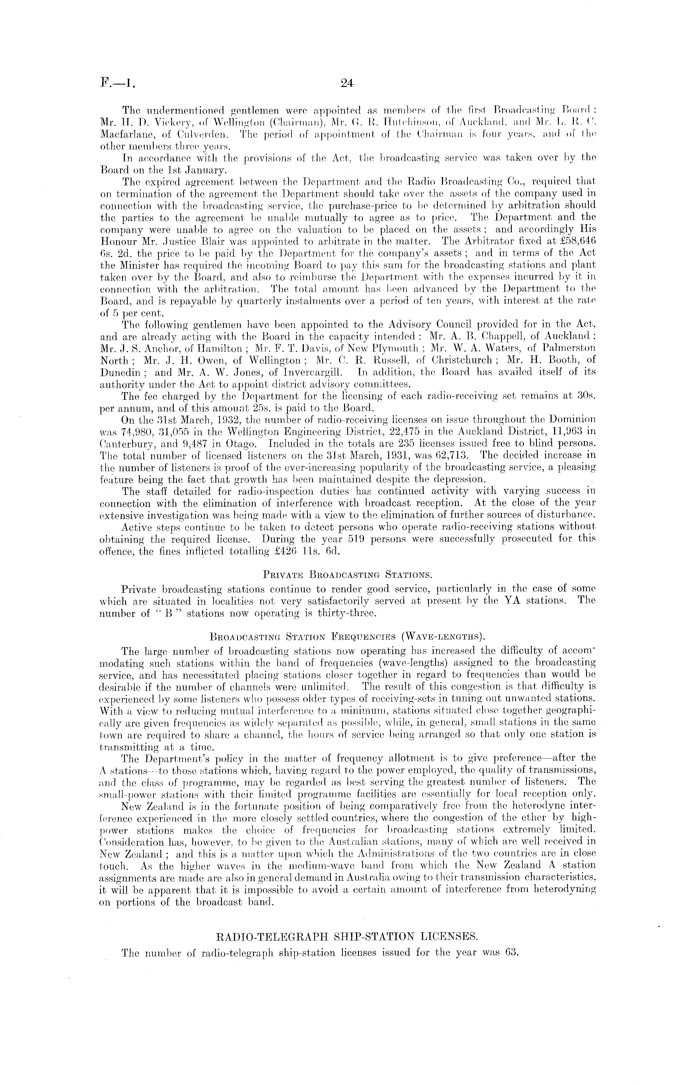 The undermentioned gentlemen were appointed as members of the first Broadcasting Board : Mr. H. D. Vickery, of Wellington (Chairman), Mr. G. R. Hutchinson, of Auckland, and Mr. L. R. C. Macfarlane, of Culvorden. The period of appointment of the Chairman is four years, and of the other members three years. In accordance with the provisions of the Act, the broadcasting service was taken over by the Board on the Ist January. The expired agreement between the Department and the Radio Broadcasting Co., required that on termination of the agreement the Department should take over the assets of the company used in connection with the broadcasting service, the purchase-price to be determined by arbitration should the parties to the agreement be unable mutually to agree as to price. The Department and the company were unable to agree on the valuation to be placed on the assets ; and accordingly His Honour Mr. Justice Blair was appointed to arbitrate in the matter. The Arbitrator fixed at £58,646 6s. 2d. the price to be paid by the Department for the company's assets ; and in terms of the Act the Minister has required the incoming Board to pay this sum for the broadcasting stations and plant taken over by the Board, and also to reimburse the Department with the expenses incurred by it in connection with the arbitration. The total amount has been advanced by the Department to the Board, and is repayable by quarterly instalments over a period of ten years, with interest at the rate of 5 per cent. The following gentlemen have been appointed to the Advisory Council provided for in the Act, and are already acting with the Board in the capacity intended : Mr. A. B. Chappell, of Auckland ; Mr. J. S. Anchor, of Hamilton ; Mr. F. T. Davis, of New Plymouth ; Mr. W. A. Waters, of Palmerston North; Mr. J. H. Owen, of Wellington ; Mr. C. R. Russell, of Christchurch ; Mr. H. Booth, of Dunedin ; and Mr. A. W. Jones, of Invercargill. In addition, the Board has availed itself of its authority under the Act to appoint district advisory committees. The fee charged by the Department for the licensing of each radio-receiving set remains at 30s. per annum, and of this amount 255. is paid to the Board. On the 31st March, 1932, the number of radio-receiving licenses on issue throughout the Dominion was 74,980, 31,055 in the Wellington Engineering District, 22,475 in the Auckland District, 11,963 in Canterbury, and 9,487 in Otago. Included in the totals are 235 licenses issued free to blind persons. The total number of licensed listeners on the 31st March, 1931, was 62,713. The decided increase in the number of listeners is proof of the ever-increasing popularity of the broadcasting service, a pleasing feature being the fact that growth has been maintained despite the depression. The staff detailed for radio-inspection duties has continued activity with varying success in connection with the elimination of interference with broadcast reception. At the close of the year extensive investigation was being made with a view to the elimination of further sources of disturbance. Active steps continue to be taken to detect persons who operate radio-receiving stations without obtaining the required license. During the year 519 persons were successfully prosecuted for this offence, the fines inflicted totalling £426 lis. 6d. Private Broadcasting Stations. Private broadcasting stations continue to render good service, particularly in the case of some which are situated in localities not very satisfactorily served at present by the YA stations. The number of " B " stations now operating is thirty-three. Broadcasting Station Frequencies (Wave-lengths). The large number of broadcasting stations now operating has increased the difficulty of acconr modating such stations within the band of frequencies (wave-lengths) assigned to the broadcasting service, and has necessitated placing stations closer together in regard to frequencies than would be desirable if the number of channels were unlimited. The result of this congestion is that difficulty is experienced by some listeners who possess older types of receiving-sets in tuning out unwanted stations. With a view to reducing mutual interference to a minimum, stations situated close together geographically are given frequencies as widely separated as possible, while, in general, small stations in the same town are required to share a channel, the hours of service being arranged so that only one station is transmitting at a time. The Department's policy in the matter of frequency allotment is to give preference—after the A stations —to those stations which, having regard to the power employed, the quality of transmissions, and the class of programme, may be regarded as best serving the greatest number of listeners. The small-power stations with their limited programme facilities are essentially for local reception only. New Zealand is in the fortunate position of being comparatively free from the heterodyne interference experienced in the more closely settled countries, where the congestion of the ether by highpower stations makes the choice of frequencies for broadcasting stations extremely limited. Consideration has, however, to be given to the Australian stations, many of which are well received in New Zealand ; and this is a matter upon which the Administrations of the two countries are in close touch. As the higher waves in. the medium-wave band from which the New Zealand A station assignments are made are also in general demand in Australia owing to their transmission characteristics, it will be apparent that it is impossible to avoid a certain amount of interference from heterodyning on portions of the broadcast band. RADIO-TELEGRAPH SHIP-STATION LICENSES. The number of radio-telegraph ship-station licenses issued for the year was 63.