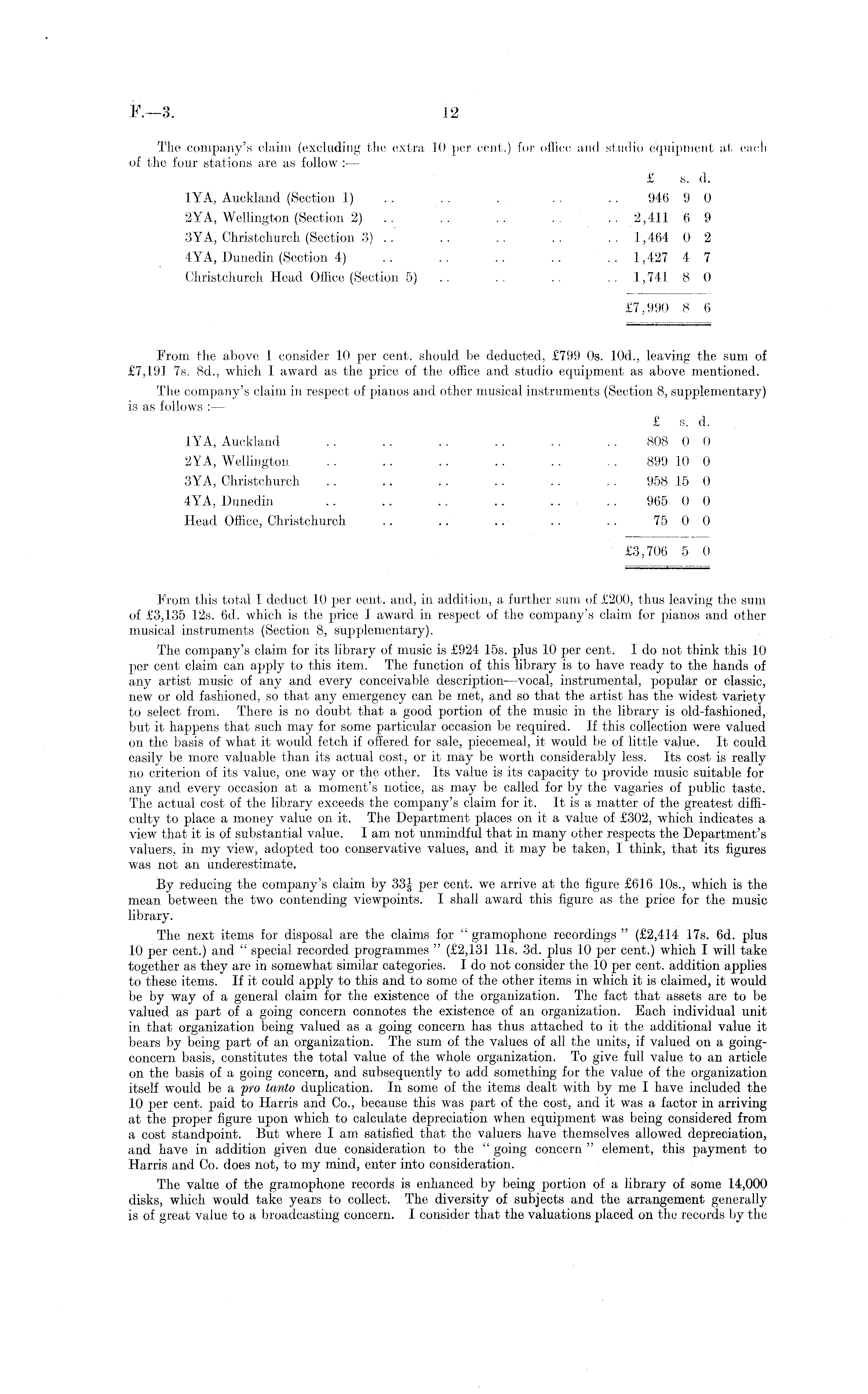 Tlie company's claim (excluding the extra 10 per cent.) for office and studio equipment at each of the four stations are as follow :— £ s. d. IYA, Auckland (Section 1) .. .. .. .. .. 946 9 0 2YA, Wellington (Section 2) .. .. .. .. .. 2,411 6 9 3YA, Christchurch (Section 3) ..' .. .. .: .. 1,464 0 2 4YA, Dunedin (Section 4) .. .. .. .. .. 1,427 4 7 Christchurch Head Office (Section 5) .. .. ... .. 1,741 8 0 £7,990 8 6 From the above I consider 10 per cent, should be deducted, £799 os. 10d., leaving the sum of £7,191 7s. Bd., which I award as the price of the office and studio equipment as above mentioned. The company's claim in respect of pianos and other musical instruments (Section 8, supplementary) is as follows :— £ s. d. IYA, Auckland .. .. .. .. .. .. 808 0 0 2YA, Wellington ... -. .. .. .. .. ~ 899 10 0 3YA, Christchurch .. .. .. .. .. .. 958 15 0 4YA, Dunedin .. .. .. .. 965 0 0 Head Office, Christchurch .. .. .. .. .. 75 0 0 £3,706 5 0 From this total I deduct 10 per oent. and, in addition, a further sum of £200, thus leaving the sum of £3,135 12s. 6d. which is the price I award in respect of the company's claim for pianos and other musical instruments (Section 8, supplementary). The company's claim for its library of music is £924 15s. plus 10 per cent. Ido not think this 10 per cent claim can apply to this item. The function of this library is to have ready to the hands of any artist music of any and every conceivable description —vocal, instrumental, popular or classic, new or old fashioned, so that any emergency can be met, and so that the artist has the widest variety to select from. There is no doubt that a good portion of the music in the library is old-fashioned, but it happens that such may for some particular occasion be required. If this collection were valued on the basis of what it would fetch if offered for sale, piecemeal, it would be of little value. It could easily be more valuable than its actual cost, or it may be worth considerably less. Its cost is really no criterion of its value, one way or the other. Its value is its capacity to provide music suitable for any and every occasion at a moment's notice, as may be called for by the vagaries of public taste. The actual cost of the library exceeds the company's claim for it. It is a matter of the greatest difficulty to place a money value on it. The Department places on it a value of £302, which indicates a view that it is of substantial value. lam not unmindful that in many other respects the Department's valuers, in my view, adopted too conservative values, and it may be taken, I think, that its figures was not an underestimate. _ By reducing the company's claim by 33-J- per cent, we arrive at the figure £616 10s., which is the mean between the two contending viewpoints. I shall award this figure as the price for the music library. The next items for disposal are the claims for " gramophone recordings " (£2,414 17s. 6d. plus 10 per cent.) and " special recorded programmes " (£2,131 11s. 3d. plus 10 per cent.) which I will take together as they are in somewhat similar categories. Ido not consider the 10 per cent, addition applies to these items. If it could apply to this and to some of the other items in which it is claimed, it would be by way of a general claim for the existence of the organization. The fact that assets are to be valued as part of a going concern connotes the existence of an organization. Each individual unit in that organization being valued as a going concern has thus attached to it the additional value it bears by being part of an organization. The sum of the values of all the units, if valued on a goingconcern basis, constitutes the total value of the whole organization. To give full value to an article on the basis of a going concern, and subsequently to add something for the value of the organization itself would be a pro tanto duplication. In some of the items dealt with by me I have included the 10 per cent, paid to Harris and Co., because this was part of the cost, and it was a factor in arriving at the proper figure upon which to calculate depreciation when equipment was being considered from a cost standpoint. But where lam satisfied that the valuers have themselves allowed depreciation, and have in addition given due consideration to the " going concern " element, this payment to Harris and Co. does not, to my mind, enter into consideration. The value of the gramophone records is enhanced by being portion of a library of some 14,000 disks, which would take years to collect. The diversity of subjects and the arrangement generally js of great value to a broadcasting concern. I consider that the valuations placed on the records by the