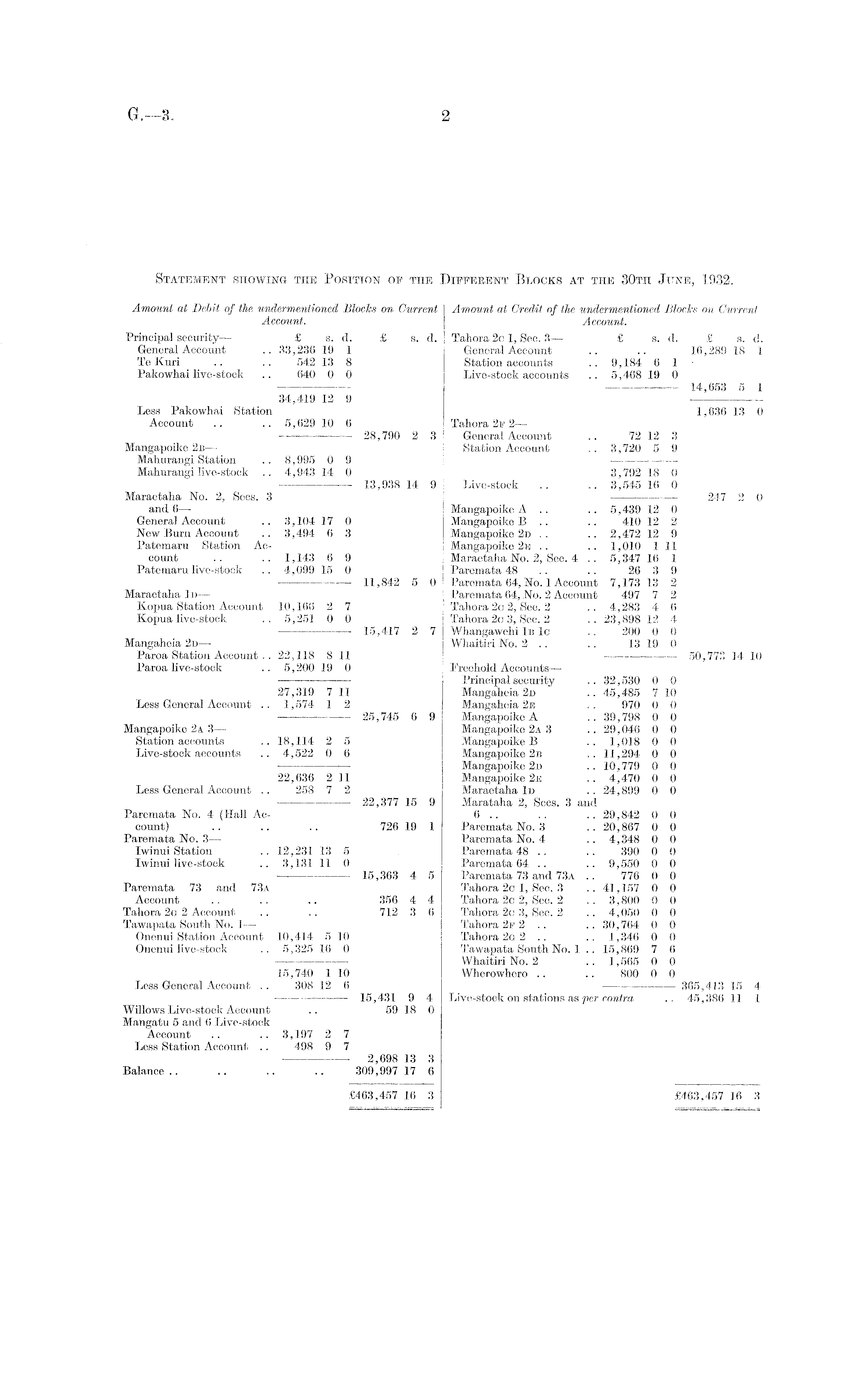 Statement showing the Position of the Different Blocks at the 30th June, 1932. Amount at Debit of the, undermentioned Blocks on Current Amount at Credit of the undermentioned Blocks on Current Account. Account. Principal security— £ s. d, £ s. d. Tahora 2c 1, Sec. 3— £ s. d. £ s. d. General Account .. 33,236 19 1 General Account .. .. 16,289 18 1 TeKuri .. .. 542 13 8 Station accounts .. 9,184 6 1 • Pakowhai live-stock .. 640 0 0 Live-stock accounts .. 5,468 19 0 14,653 5 1 34,419 12 9 Less Pakowhai Station 1,636 13 0 Account .. .. 5,629 10 6 Tahora 2s 2— 28,790 2 3 General Account .. 72 12 3 Mangapoike 2b— Station Account .. 3,720 5 9 Malmrangi Station .. 8,995 0 9 Mahurangi live-stook .. 4,94.3 14 0 3,792 18 0 13,938 14 9 Live-stock .. .. 3,545 16 0 Maraetaha No. 2, Sees. 3 247 2 0 and 6 — Mangapoike A .. .. 5,439 12 0 Genera] Account .. 3,104 17 0 Mangapoike B .. .. 410 12 2 New Burn Account .. 3,494 6 3 Mangapoike 2d .. .. 2,472 12 9 Patemaru Station Ac- Mangapoike 2e .. .. 1,010 1 11 count .. .. 1,143 6 9 Maraetaha No. 2, See. 4 .. 5,347 16 1 Patemaru live-stock .. 4,099 15 0 Paremata 48 .. .. 26 3 9 11,842 5 0 Paremata 64,N0. 1 Account 7,173 13 2 Maraetaha Id— Paremata 64, No. 2 Account 497 7 2 Kopua Station Account 10,166 2 7 Tahora 2c 2, Sec. 2 .. 4,283 4 6 Kopua live-stock .. 5,251 0 0 Tahora 2c 3, Sec. 2 .. 23,898 12 4 15,417 2 7 Whangawehi Iβ lc .. 200 0 0 Mangaheia 2d— Whaitiri No. 2 .. .. 13 19 0 Paroa Station Account .. 22,118 8 11 50,773 14 10 Paroa live-stock .. 5,200 19 0 Freehold Accounts— Principal security .. 32,530 0 0 27,319 7 11 Mangaheia 2d ' .. 45,485 7 10 Less General Account .. 1,574 1 2 Mangaheia 2e .. 970 0 0 25,745 6 9 Mangapoike A ..39,798 0 0 Mangapoike 2a 3— Mangapoike 2a 3 .. 29,046 0 0 Station accounts .. 18,114 2 5 Mangapoike B .. 1,018 0 0 Live-stock accounts .. 4,522 0 6 Mangapoike 2b .. 11,294 0 0 Mangapoike 2d ..10,779 0 0 22,636 2 11 Mangapoike 2e .. 4,470 0 0 Less General Account .. 258 7 2 Maraetaha Id .. 24,899 0 0 22,377 15 9 Marataha 2, Sees. 3 and Paremata No. 4 (Hall Ac- 6 .. .. .. 29,842 0 0 count) .. .. .. 726 19 1 Paremata No. 3 .. 20,867 0 0 Paremata No. 3— Paremata No. 4 .. 4,348 0 0 Iwinui Station .. 12,231 13 5 Paremata 48 .. .. 390 0 0 Iwinui live-stock .. 3,131 11 0 Paremata 64 .. .. 9,550 0 0 15,363 4 5 Paremata 73 and 73a .. 776 0 0 Paremata 73 and 73a Tahora 2o 1, Sec. 3 .. 41,157 0 0 Account .. 356 4 4 Tahora 2c 2, Sec. 2 .. 3,800 0 0 Tahora 2o 2 Account .. .. 712 3 6 Tahora 2c 3, Sec. 2 .. 4,050 0 0 Tawapata South No. 1— Tahora 2f 2 .. .. 30,764 0 0 Onenui Station Account 10,414 5 10 Tahora 2g 2 .. .. 1,346 0 0 Onenui live-stock .. 5,325 16 0 Tawapata South No. 1 .. 15,869 7 6 Whaitiri No. 2 .. 1,565 0 0 15,740 1 10 Wherowhero .. .. 800 0 0 Less General Account .. 308 12 6 365,413 15 4 15,431 9 4 Live-stock on stations as per contra .. 45,386 11 1 Willows Live-stock Account .. 59 18 0 Mahgatu 5 and 6 Live-stock Account .. .. 3,197 2 7 Less Station Account .. 498 9 7 2 698 13 3 Balance.. .. ~ .. 17 6 £463,457 16 3 £463,457 16 3
