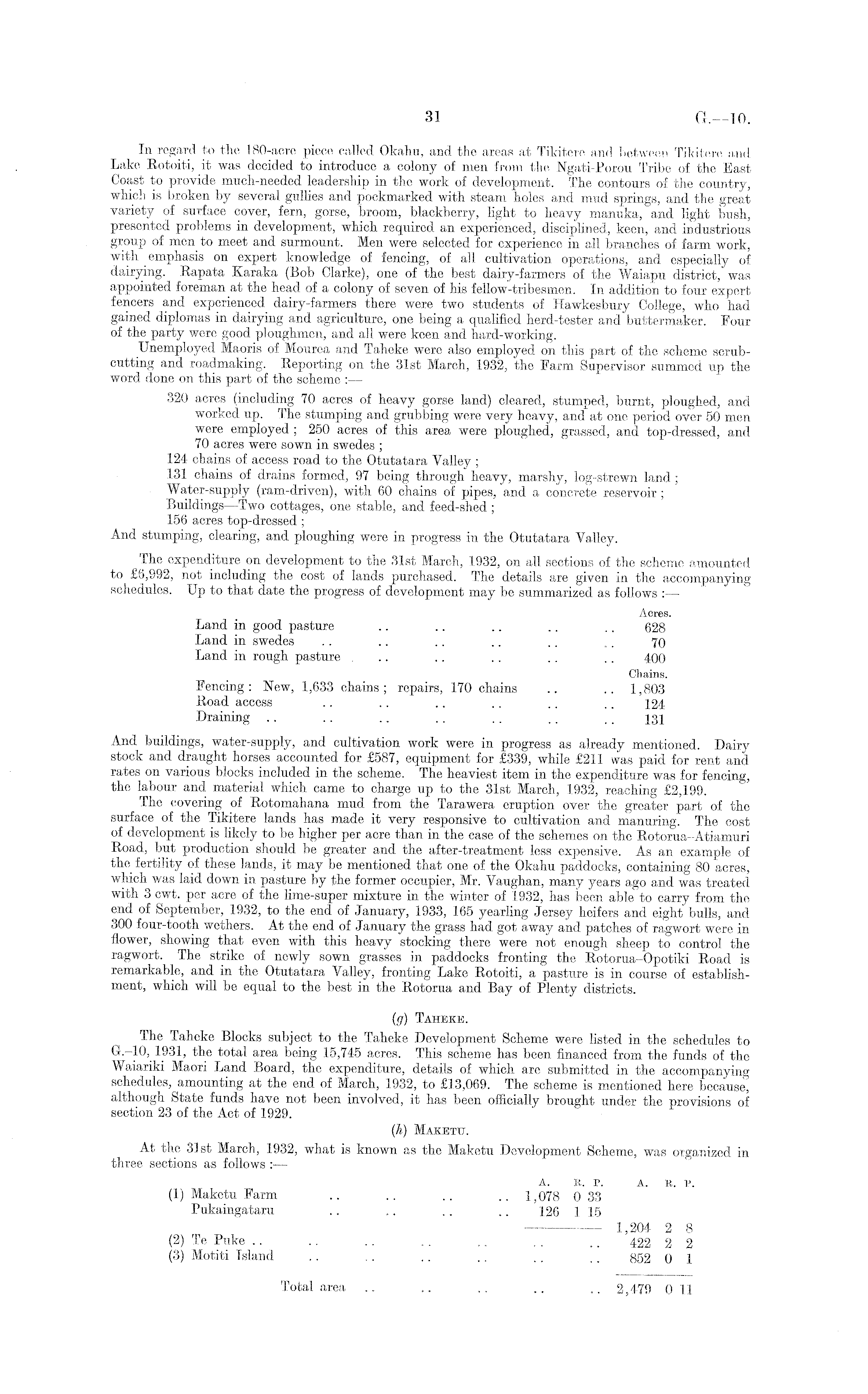 In regard to the 180-acre piece called Okahu, and the areas at Tikitere and between Tikitere and Lake Rotoiti, it was decided to introduce a colony of men from the Ngati-Porou Tribe of the East Coast to provide much-needed leadership in the w T ork of development. The contours of the country, which is broken by several gullies and pockmarked with steam holes and mud springs, and the great variety of surface cover, fern, gorse, broom, blackberry, light to heavy manuka, and light bush, presented problems in development, which required an experienced, disciplined, keen, and industrious group of men to meet and surmount. Men were selected for experience in all branches of farm work, with emphasis on expert knowledge of fencing, of all cultivation operations, and especially of dairying. Rapata Karaka (Bob Clarke), one of the best dairy-farmers of the Waiapu district, was appointed foreman at the head of a colony of seven of his fellow-tribesmen. In addition to four expert fencers and experienced dairy-farmers there were two students of Hawkesbury College, who had gained diplomas in dairying and agriculture, one being a qualified herd-tester and'buttermaker. Four of the party were good ploughmen, and all were keen and hard-working. Unemployed Maoris of Mourea and Taheke were also employed on this part of the scheme scrubcutting and roadmaking. Reporting on the 31st March, 1932, the Farm Supervisor summed up the word done on this part of the scheme :— 320 acres (including 70 acres of heavy gorse land) cleared, stumped, burnt, ploughed, and worked up. The stumping and grubbing were very heavy, and at one period over 50 men were employed ; 250 acres of this area were ploughed, grassed, and top-dressed, and 70 acres were sown in swedes ; 124 chains of access road to the Otutatara Valley ; 131 chains of drains formed, 97 being through heavy, marshy, log-strewn land ; Water-supply (ram-driven), with 60 chains of pipes, and a concrete reservoir ; Buildings—Two cottages, one stable, and feed-shed ; 156 acres top-dressed ; And stumping, clearing, and ploughing were in progress in the Otutatara Valley. The expenditure on development to the 31st March, 1932, on all sections of the scheme amounted to £6,992, not including the cost of lands purchased. The details are given in the accompanying schedules. Up to that date the progress of development may be summarized as follows :— Acres. Land in good pasture .. .. .. .. .. 628 Land in swedes .. .. .. .. .. .. 70 Land in rough pasture ... .. . . .. .. 400 Chains. Fencing: New, 1,633 chains; repairs, 170 chains .. .. 1,803 Road access .. .. .. .. .. .. 124 Draining .. .. .. .. .. . . ~ 131 And buildings, water-supply, and cultivation work were in progress as already mentioned. Dairy stock and draught horses accounted for £587, equipment for £339, while £211 was paid for rent and rates on various blocks included in the scheme. The heaviest item in the expenditure was for fencing, the labour and material which came to charge up to the 31st March, 1932, reaching £2,199. The covering of Rotomahana mud from the Tarawera eruption over the greater part of the surface of the Tikitere lands has made it very responsive to cultivation and manuring. The cost of development is likely to be higher per acre than in the case of the schemes on the Rotorua-Atiamuri Road, but production should be greater and the after-treatment less expensive. As an example of fertility of these lands, it may be mentioned that one of the Okahu paddocks, containing 80 acres, which was laid down in pasture by the former occupier, Mr. Vaughan, many years ago and was treated with 3 cwt. per acre of the lime-super mixture in the winter of 1932, has been able to carry from the end of September,'l932, to the end of January, 1933, 165 yearling Jersey heifers and eight bulls, and 300 four-tooth wethers. At the end of January the grass had got away and patches of ragwort were in flower, showing that even with this heavy stocking there were not enough sheep to control the ragwort. The strike of newly sown grasses in paddocks fronting the Rotorua-Opotiki Road is remarkable, and in the Otutatara Valley, fronting Lake Rotoiti, a pasture is in course of establishment, which will be equal to the best in the Rotorua and Bay of Plenty districts. (g) Taheke. The Taheke Blocks subject to the Taheke Development Scheme were listed in the schedules to 6.-10,. 1931, the total area being 15,745 acres. This scheme has been financed from the funds of the Waiariki Maori Land Board, the expenditure, details of which are submitted in the accompanying schedules, amounting at the end of March, 1932, to £13,069. The scheme is mentioned here because, although State funds have not been involved, it has been officially brought under the provisions of section 23 of the Act of 1929. (h) Maketu. At the 31st March, 1932, what is known as the Maketu Development Scheme, was organized in three sections as follows :— a. e. p. a. e. p. (1) Maketu Farm .. .. .. .. 1,078 033 Pukaingataru .. .. .. .. 126 1 15 1,204 2 8 (2) Te Puke .. .. .. .. .. .. .. 422 22 (3) Motiti Island .. .. .. ~ ~ ~ 852 0 1 Total area .. .. .. .. .. 2,479 011