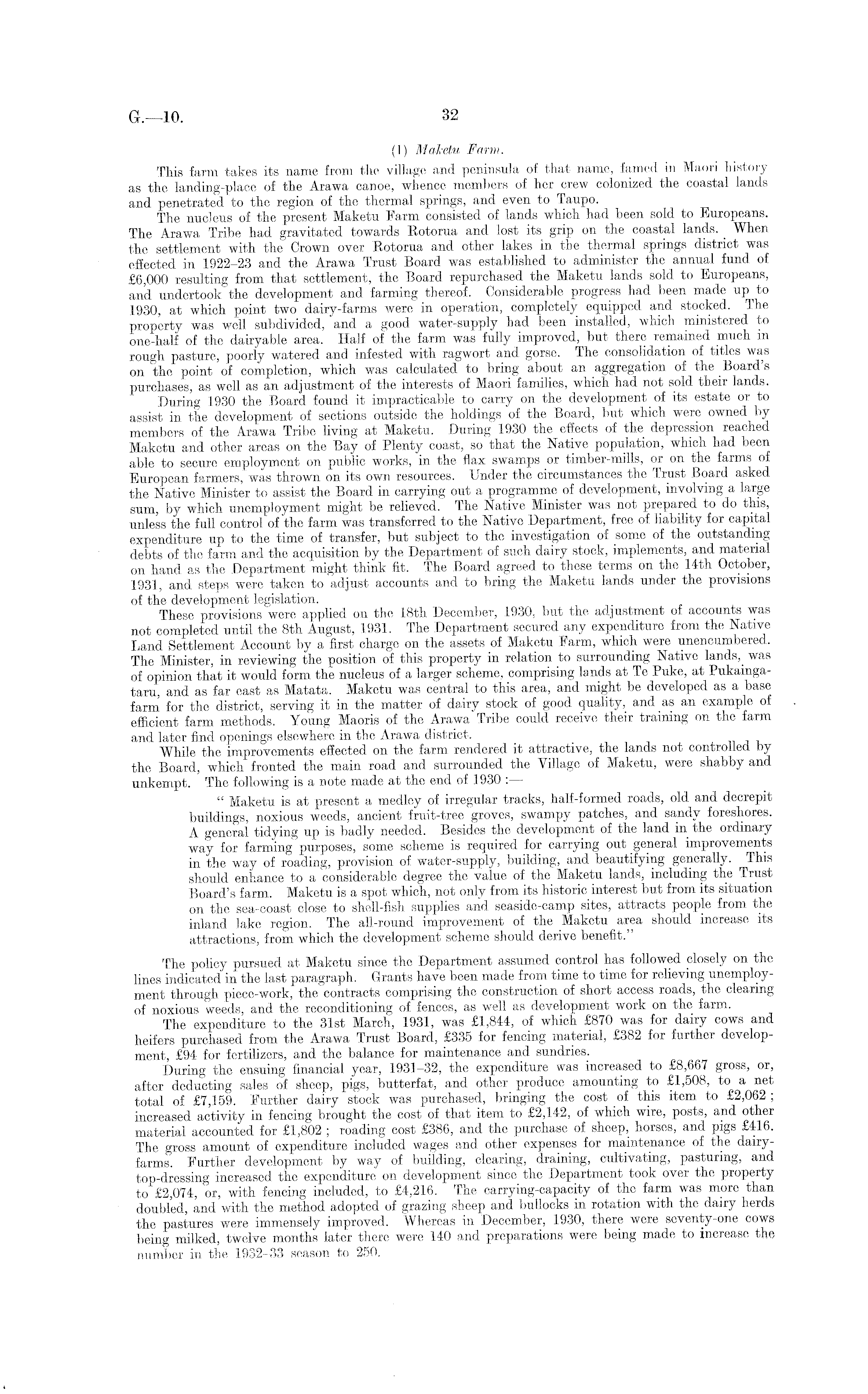 (1) Maketu Farm. This farm takes its name from the village and peninsula of that name, famed in Maori history as the landing-place of the Arawa canoe, whence members of her crew colonized the coastal lands and penetrated to the region of the thermal springs, and even to Taupo. The nucleus of the present Maketu Farm consisted of lands which had been sold to Europeans. The Arawa Tribe had gravitated towards Rotorua and lost its grip on the coastal lands. _ When the settlement with the Crown over Rotorua and other lakes in the thermal springs district was effected in 1922-23 and the Arawa Trust Board was established to administer the annual fund of £6,000 resulting from that settlement, the Board repurchased the Maketu lands sold to Europeans, and undertook the development and farming thereof. Considerable progress had been made up to 1930, at which point two dairy-farms were in operation, completely equipped and stocked. The property was well subdivided, and a good water-supply had been installed, which ministered to one-half of the dairyable area. Half of the farm was fully improved, but there remained much m rough pasture, poorly watered and infested with ragwort and gorse. The consolidation of titles was on the point of completion, which was calculated to bring about an aggregation of the Board s purchases, as well as an adjustment of the interests of Maori families, which had not sold their lands. During 1930 the Board found it impracticable to carry on the development of its estate or to assist in the development of sections outside the holdings of the Board, but which were owned by members of the Arawa Tribe living at Maketu. During 1930 the effects of the depression reached Maketu and other areas on the Bay of Plenty coast, so that the Native population, which had been able to secure employment on public works, in the flax swamps or timber-mills, or on the farms of European farmers, was thrown on its own resources. Under the circumstances the Trust Board asked the Native Minister to assist the Board in carrying out a programme of development, involving a large sum, by which unemployment might be relieved. The Native Minister was not prepared to do this, unless the full control of the farm was transferred to the Native Department, free of liability for capital expenditure up to the time of transfer, but subject to the investigation of some of the outstanding debts of the farm and the acquisition by the Department of such dairy stock, implements, and material on hand as the Department might think fit. The Board agreed to these terms on the 14th October, 1931, and steps were taken to adjust accounts and to bring the Maketu lands under the provisions of the development legislation. These provisions were applied on the 18th December, 1930, but the adjustment of accounts was not completed until the Bth August, 1931. The Department secured any expenditure from the Native Land Settlement Account by a first charge on the assets of Maketu Farm, which were unencumbered. The Minister, in reviewing the position of this property in relation to surrounding Native lands, _ was of opinion that it would form the nucleus of a larger scheme, comprising lands at Te Puke, at Pukaingataru, and as far east as Matata. Maketu was central to this area, and might be developed as a base farm for the district, serving it in the matter of dairy stock of good quality, and. as an example of efficient farm methods. Young Maoris of the Arawa Tribe could receive their training on the farm and later find openings elsewhere in the Arawa district. While the improvements effected on the farm rendered it attractive, the lands not controlled by the Board, which fronted the main road and surrounded the Village of Maketu, were shabby and unkempt. The following is a note made at the end of 1930 : — " Maketu is at present a medley of irregular tracks, half-formed roads, old and decrepit buildings, noxious weeds, ancient fruit-tree groves, swampy patches, and sandy foreshores. A general tidving up is badly needed. Besides the development of the land in the ordinary way for farming purposes, some scheme is required for carrying out general improvements in the way of roading, provision of water-supply, building, and beautifying generally. This should enhance to a considerable degree the value of the Maketu lands, including the Trust Board's farm. Maketu is a spot which, not only from its historic interest but from its situation on the sea-coast close to shell-fish supplies and seaside-camp sites, attracts people from the inland lake region. The all-round improvement of the Maketu area should increase its attractions, from which the development scheme should derive benefit." The policy pursued at Maketu since the Department assumed control has followed closely on the lines indicated in the last paragraph. Grants have been made from time to time for relieving unemployment through, piece-work, the contracts comprising the construction of short access roads, the clearing of noxious weeds, and the reconditioning of fences, as well as development work on the farm. The expenditure to the 31st March, 1931, was £1,844, of which £870 was for dairy cows and heifers purchased from the Arawa Trust Board, £335 for fencing material, £382 for further development, £94 for fertilizers, and the balance for maintenance and sundries. During the ensuing financial year, 1931—32, the expenditure was increased to £8,667 gross, or, after deducting sales of sheep, pigs, butterfat, and other produce amounting to £1,508, to a net total of £7,159. Further dairy stock was purchased, bringing the cost of this item to £2,062 ; increased activity in fencing brought the cost of that item to £2,142, of which wire, posts, and other material accounted for £1,802 ; roading cost £386, and the purchase of sheep, horses, and pigs £416. The gross amount of expenditure included wages and other expenses for maintenance of the dairyfarms. Further development
