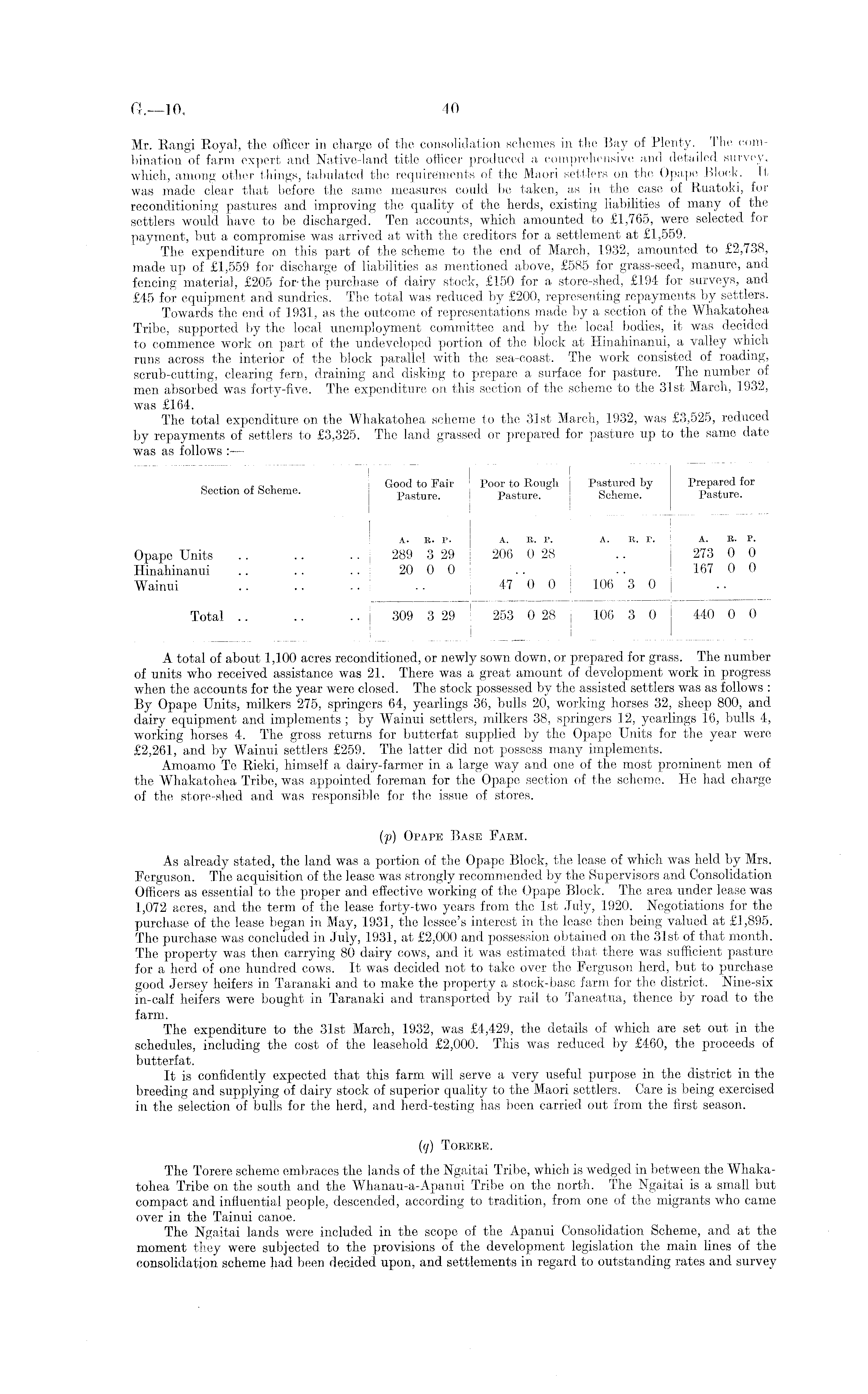 Mr. Rangi Royal, the officer in charge of the consolidation schemes in the Bay of Plenty. The combination of farm expert and Native-land title officer produced a comprehensive and detailed survey, which, among other things, tabulated the requirements of the Maori settlers on the Opape Block. It was made clear that before the same measures could be taken, as in the case of Ruatoki, for reconditioning pastures and improving the quality of the herds, existing liabilities of many of the settlers would have to be discharged. Ten accounts, which amounted to £1,765, were selected for payment, but a compromise was arrived at with the creditors for a settlement at £1,559. The expenditure on this part of the scheme to the end of March, 1932, amounted to £2,738, made up of £1,559 for discharge of liabilities as mentioned above, £585 for grass-seed, manure, and fencing material, £205 for the purchase of dairy stock, £150 for a store-shed, £194 for surveys, and £45 for equipment and sundries. The total was reduced by £200, representing repayments by settlers. Towards the end of 1931, as the outcome of representations made by a section of the Whakatohea Tribe, supported by the local unemployment committee and by the local bodies, it was decided to commence work on part of the undeveloped portion of the block at Hinahinanui, a valley which runs across the interior of the block parallel with the sea-coast. The work consisted of roading, scrub-cutting, clearing fern, draining and disking to prepare a surface for pasture. The number of men absorbed was forty-five. The expenditure on this section of the scheme to the 31st March, 1932, was £164. The total expenditure on the Whakatohea scheme to the 31st March, 1932, was £3,525, reduced by repayments of settlers to £3,325. The land grassed or prepared for pasture up to the same date was as follows :—