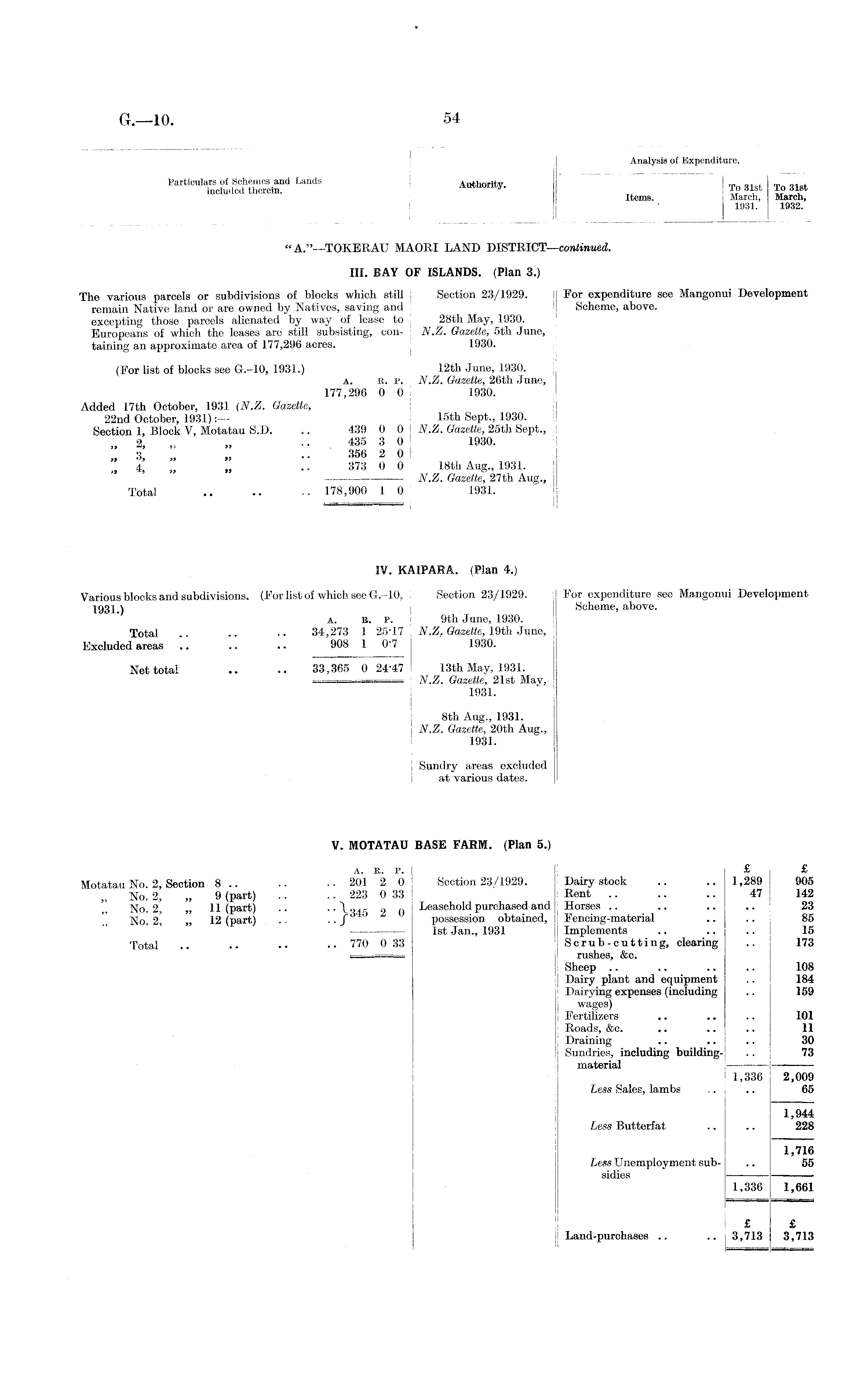 Analysis of Expenditure. ]lartiCUl Mi S edther 8 ein ndLan<1S To 31st To 31st Items. March, March, 1931. 1932. " A." —TOKERAU MAORI LAND DISTRICT —continued. III. BAY OF ISLANDS. (Plan 3.) The various parcels or subdivisions of blocks which still ! Section 23/1929. I For expenditure see Mangonui Development remain Native land or are owned by Natives, saving and : j Scheme, above. excepting those parcels alienated by way of lease to , 28th May, 1930. Europeans of which the leases are still subsisting, con- j N.Z. Gazette., 5th June, taining an approximate area of 177,296 acres. j 1930. (For list of blocks see G.-10, 1931.) 12th June, 1930. A. K. p. N.Z. Gazette, 26th June, 177,296 0 0 1930. Added 17th October, 1931 {N.Z. Gazette, 22nd October, 1931) 15th Sept., 1930. Section 1, Block V, Motatau S.D. .. 439 0 0 N.Z. Gazette, 25th Sept., 2 „ .. 435 3 0 1930. „ 3, „ „ •• ' 356 2 0 „ 4, „ „ .. 373 0 0 18th Aug., 1931. — N.Z. Gazette, 27th Aug., Total .. .. .. 178,900 1 0 1931. IV. KAIPARA. (Plan 4.) Various blocks and subdivisions. (For list of which see G.-10, Section 23/1929. For expenditure see Mangonui Development 193j \ Scheme, above. a. a. p. 9th June, 1930. Total .. .. •• 34,273 1 25'17 N.Z. Gazette, 19th June, Excluded areas .. .. .. 908 1 0'7 1930. Net total .. .. 33,365 0 24*47 13th May, 1931. 1 N.Z. Gazette, 21st Mav, 1931. 8th Aug., 1931. N.Z. Gazette, 20th Aug., 1931. Sundry areas excluded at various dates. V. MOTATAU BASE FARM. (Plan 5.) A. K. P. £ £ Motatau No. 2, Section 8 .. .. .. 201 2 0 Section 23/1929. Dairy stock .. .. 1,289 905 „ No. 2, „ 9 (part) .. .. 223 0 33 Rent .. .. .. 47 142 „ No. 2, „ 11 (part) .. .. \ , {4 - 2 0 Leasehold purchased and Horses .. .. .. .. 23 No. 2, „ 12 (part) .. possession obtained, Fencing-material .. .. 85 1st Jan., 1931 Implements .. .. .. 15 Total .. .. .. •• 770 0 33 Scrub-cutting, clearing .. 173 i rushes, &c. Sheep .. .. .. .. 108 Dairy plant and equipment .. 184 Dairying expenses (including .. 159 wages) Fertilizers .. .. .. 101 Roads, &c. .. .. .. 11 Draining .. .. .. 30 Sundries, including building- . . 73 material 1,336 2,009 Less Sales, lambs .. .. 65 1,944 Less Butterfat .. .. 228 1,716 Less Unemployment sub- .. 55 sidies 1,336 1,661 £ £ Land-purchases .. .. 3,713 3,713