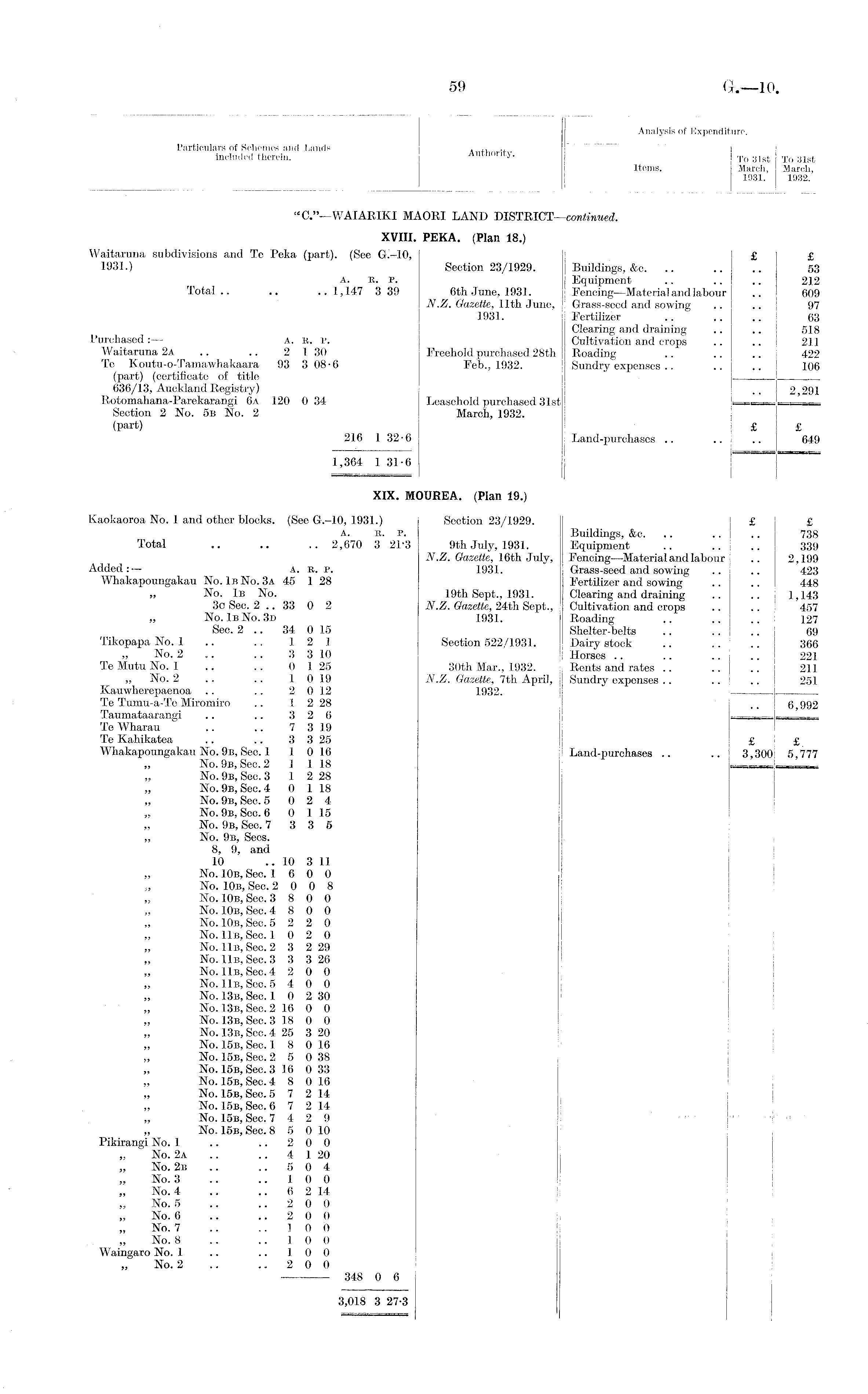 Analysis of Expenditure. Particulars of Schemes and Lands A ,, ... included therein. Authority. To 31sfc To Items. March, March, 1031. 1932. i ! "C."—WAIARIKI MAORI LAND DISTRICT—continued. XVIII. PEKA. (Plan 18.) Waitaruna. subdivisions and Te Peka (part). (See £ £ 1931.) Section 23/1929. Buildings, &c. .. .. .. S3 A. B. P. Equipment .. .. .. 212 Total .. .. ..1,147 3 39 6th June, 1931. Fencing—Material and labour .. 609 N.Z. Gazette, 11th June, Grass-seed .and sowing .. .. 97 1931. Fertilizer .. .. .. 63 Clearing and draining .. .. 518 Purchased: — a. k. p. Cultivation and crops .. .. 211 Waitaruna 2a .. .. 2 1 30 Freehold purchased 28th Roading .. .. .. 422 Te Koutu-o-Tamawhakaara 93 3 08-6 Feb., 1932. Sundry expenses .. .. .. 106 (part) (certificate of title 636/13, Auckland Registry) .. 2 291 Rotomahana-Parekarangi 6a 120 0 34 Leasehold purchased 31st — Section 2 No. 5b No. 2 March, 1932. (part) £ £ 216 1 32-6 Land-purchases .. .. .. 649 1,364 1 31-6 XIX. MOUREA. (Plan 19.) Kaokaoroa No. 1 and other blocks. (See G.-10, 1931.) Section 23/1929. £ £ A. b. P. Buildings, &c. .. .. .. 738 Total .. .. .. 2,670 3 21 - 3 9th July, 1931. Equipment .. .. .. 339 N.Z. Gazette, 16th July, Fencing—Material and labour .. 2,199 Added:— A. k. p. 1931. Grass-seed and sowing .. .. 423 Whakapoungakau No. IbNo. 3a 45 1 28 Fertilizer and sowing .. .. 448 » No. 1b No. 19th Sept., 1931. Clearing and draining .. .. 1,143 3c Sec. 2 .. 33 0 2 N.Z. Gazette, 24th Sept., Cultivation and crops .. .. 457 » No. IbNo. 3d 1931. Roading .. .. .. 127 Sec. 2 .. 34 0 15 Shelter-belts .. .. .. 69 Tikopapa No. 1 .. .. 12 1 Section 522/1931. Dairy stock .. .. .. 366 „ No. 2 .. .. 3 3 10 Horses .. .. .. .. 221 Te Mutu No. 1 .. .. 0 1 25 30th Mar., 1932. Rents and rates .. .. .. 211 „ No. 2 .. .. 1 0 19 N.Z. Gazette, 7th April, Sundry expenses .. .. .. 251 Kauwherepaenoa .. .. 2 0 12 1932. 4 Te Tumu-a-Te Miromiro ..1 2 28 .. 6,992 Taumataarangi .. .. 3 2 6 , Te Wharau .. .. 7 3 19 Te Kahikatea .... 3 3 25 £ £ Whakapoungakau No. 9b, Sec. 1 1 0 16 Land-purchases .. .. 3,300 5,777 No. 9b, Sec. 2 1 1 18 No. 9b, Sec. 3 1 2 28 „ No. 9b, Sec. 4 0 118 „ No. 9b, Sec. 5 0 2 4 No. 9b, Sec. 6 0 1 15 No. 9b, Sec. 7 3 3 5 „ No. 9b, Sees. 8, 9, and 10 .. 10 3 11 No. 10b, Sec. 16 0 0 No. 10b, Sec. 2 0 0 8 No. 10b, Sec. 3 8 0 0 „ No. 10b, Sec. 4 8 0 0 No. 10b, Sec. 5 2 2 0 No. llB,Sec. 1 0 2 0 „ No. 11b, Sec. 2 3 2 29 No. llB,Seo.3 3 3 26 „ No. 11b, Sec. 4 2 0 0 „ No. 11b, Sec. 5 4 0 0 No. 13b, Sec. 1 0 2 30 No. 13b, Sec. 2 16 0 0 No. 13b, Sec. 3 18 0 0 No. 13b, Sec. 4 25 3 20 „ No. 15b, Sec. 1 8 0 16 No. 15b, Sec. 2 5 0 38 No. 15b, Sec. 3 16 0 33 No. 15b, See. 4 8 0 16 No. 15b, Sec. 5 7 2 14 No. 15B,Sec.6 7 2 14 No. 15b, Sec. 7 4 2 9 . No. 15b, See. 8 5 0 10 Pikirangi No. 1 .. .. 2 0 0 No. 2a .. .. 4 1 20 „ No. 2b .. ..504 No. 3 .. ..100 No. 4 .. 6 2 14 „ No. 5 .... 2 0 0 No. 6 .. ..200 No. 7 .. .. 10 0 No. 8 .. ..100 Waingaro No. 1 .... 1 0 0 No. 2 .. ..200 348 0 6 3,018 3 27-3