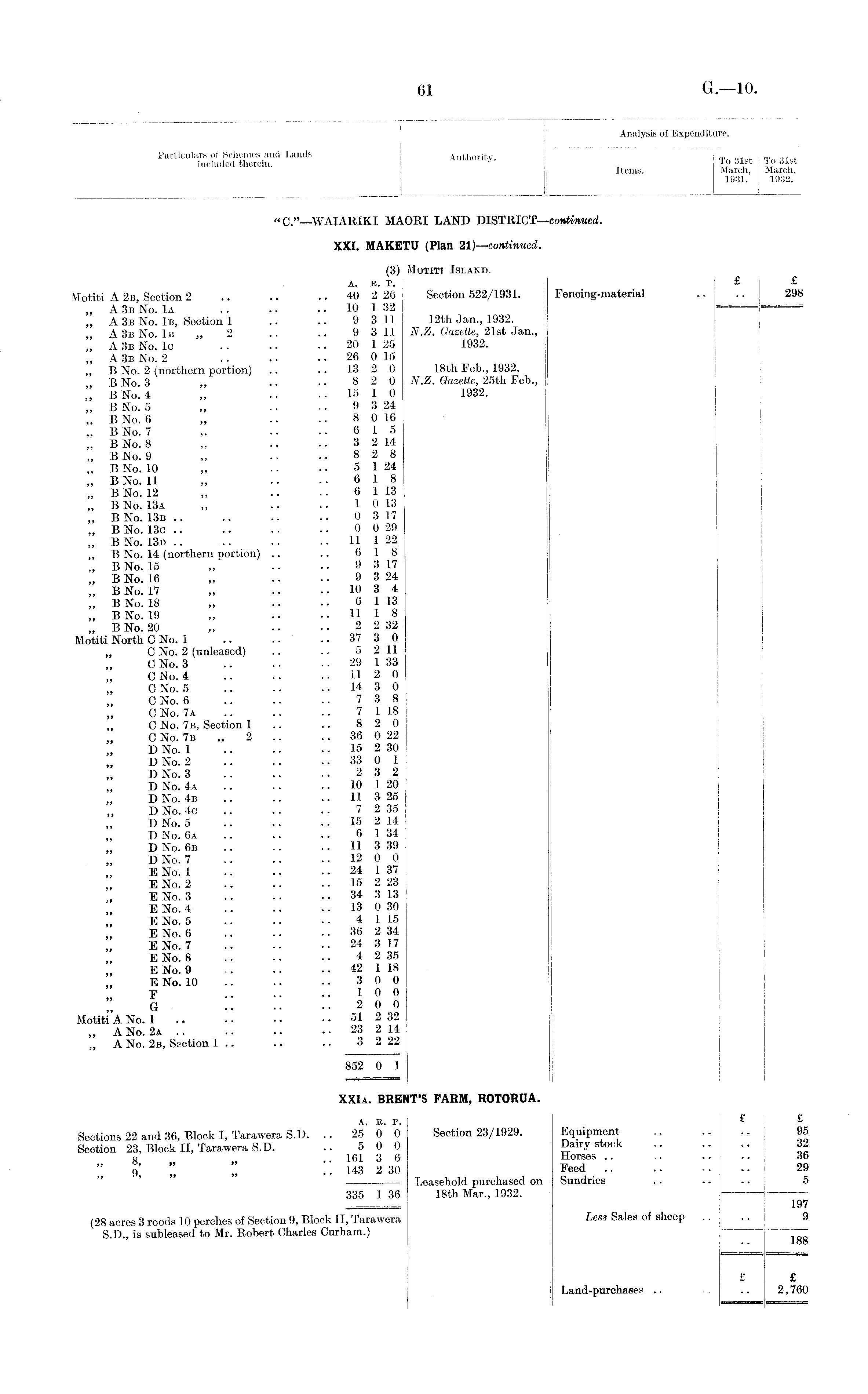 Analysis of Expenditure. Lands Authority. T 0 81 t T 8 , t j Items. March, March, 1931. 1932. " 0." —WAIARIKI MAORI LAND DISTRICT —continued. XXI. MAKETU (Plan 21)—continued. (3) Motitt Island. A. K. P. j £ £ Motiti A 2b, Section 2 .. .. .. 40 2 26 Section 522/1931. | Fencing-material .. .. 298 „ A 3b No. 1a .. .. .. 10 132 j «===» „ A 3b No. 1b, Section 1 .. .. 9 3 11 12th Jan., 1932. A 3b No 1b ,, 2 .. .. 9 3 11 N.Z. Gazette, 21at Jan., " A 3b No. lc 20 1 25 1932. „ A 3b NO. 2 .. .. .. 26 0 15 ,, B No. 2 (northern portion) .. .. 13 2 0 18th Feb., 1932. B No 3 „ ■ • ■ • 8 2 0 N.Z. Gazette, 25th Feb., ," B No! 4 „ .. .. 15 1 0 1932. „ B No. 5 „ . ■ ■ • 9 3 24 „ B No. 6 „ .. .. 8 0 16 ,, B No. 7 „ .. 6 15 ,, B No. 8 „ .. .. 3 2 14 „ B No. 9 „ .. 8 2 8 „ B No. 10 „ .. • ■ 5 1 24 B No. 11 „ . • ■ • 6 18 „ BNo. 12 „ .. 6 1 13 „ BNo. 13a „ .. .. 1 0 13 „ B No. 13b .. .. .. .. 0 3 17 „ B No. 13c .. .. .. .. 0 0 29 „ B No. 13d .. .. .. .. 11 1 22 „ B No. 14 (northern portion) .. .. 6 18 „ B No. 15 „ .. ■ ■ 9 3 17 „ B No. 16 „ .. • • 9 3 24 „ B No. 17 „ .. .. 10 3 4 „ BNo. 18 „ .. •• 6 1 13 „ BNo. 19 „ .. .. 11 1 8 „ B No. 20 „ . • • • 2 2 32 Motiti North 0 No. 1 .. .. 37 3 0 ,, C No. 2 (unleased) .. .. 5 2 11 C No. 3 .. .. .. 29 1 33 C No. 4 .. .. .. 11 2 0 C No. 5 .. .. .. 14 3 0 C No. 6 ...... 7 3 8 | C No. 7a .. .. .. 7 1 18 0 No. 7b, Section 1 .. 8 2 0 C No. 7b „ 2 .. 36 0 22 D No. 1 .. . • • • 15 2 30 D No. 2 .. .. .. 33 0 1 D No. 3 .. .. .. 2 3 2 D No. 4a .. .. 10 1 20 DNo. 4b .. .. 11 3 25 D No. 4o .. .. .. 7 2 35 D No. 5 .. .. .. 15 2 14 D No. 6a .. .. .. 6 1 34 DNo. 6b .. .. 11 3 39 D No. 7 .. .. .. 12 0 0 B No. 1 .. .. • • 24 1 37 E No. 2 .. .. . • 15 2 23 E No. 3 .. - ■ • • 34 3 13 E No. 4 .. .. • • 13 0 30 E No. 5 .. . ■ • • 4 1 15 E No. 6 .. .. • • 36 2 34 E No. 7 ...... 24 3 17 ! E No. 8 ...... 4 2 35 ENo. 9 .. .. •• 42 1 18 E No. 10 .. . • • • 3 0 0 F .. .. ..100 " G .. •• ..200 MotitiA No. 1 .. ■ • • • .. 51 2 32 „ A No. 2a .. . • • • .. 23 2 14 „ A No. 2b, Section 1 .. .. .. 3 2 22 852 0 1 ============== XXIa. BRENT'S FARM, ROTORUA. A. B. P. £ £ Sections 22 and 36, Block I, Tarawera S.D. .. 25 0 0 Section 23/1929. Equipment 95 Section 23, Block II, Tarawera S.D. .. 5 0 0 Dairy stock ,. .. .. 32 o „ .. 161 3 6 Horses .. .. .. .. 36 9 j n .. 143 2 30 Feed .. .. .. .. 29 Leasehold purchased on Sundries . . .. .. 5 335 1 36 18th Mar., 1932. 197 (28 acres 3 roods 10 perches of Section 9, Block II, Tarawera Less Sales of sheep -. .. 9 S.D., is subleased to Mr. Robert Charles Curham.) — . . loo £ £ Land-purchases .. .. 2,760