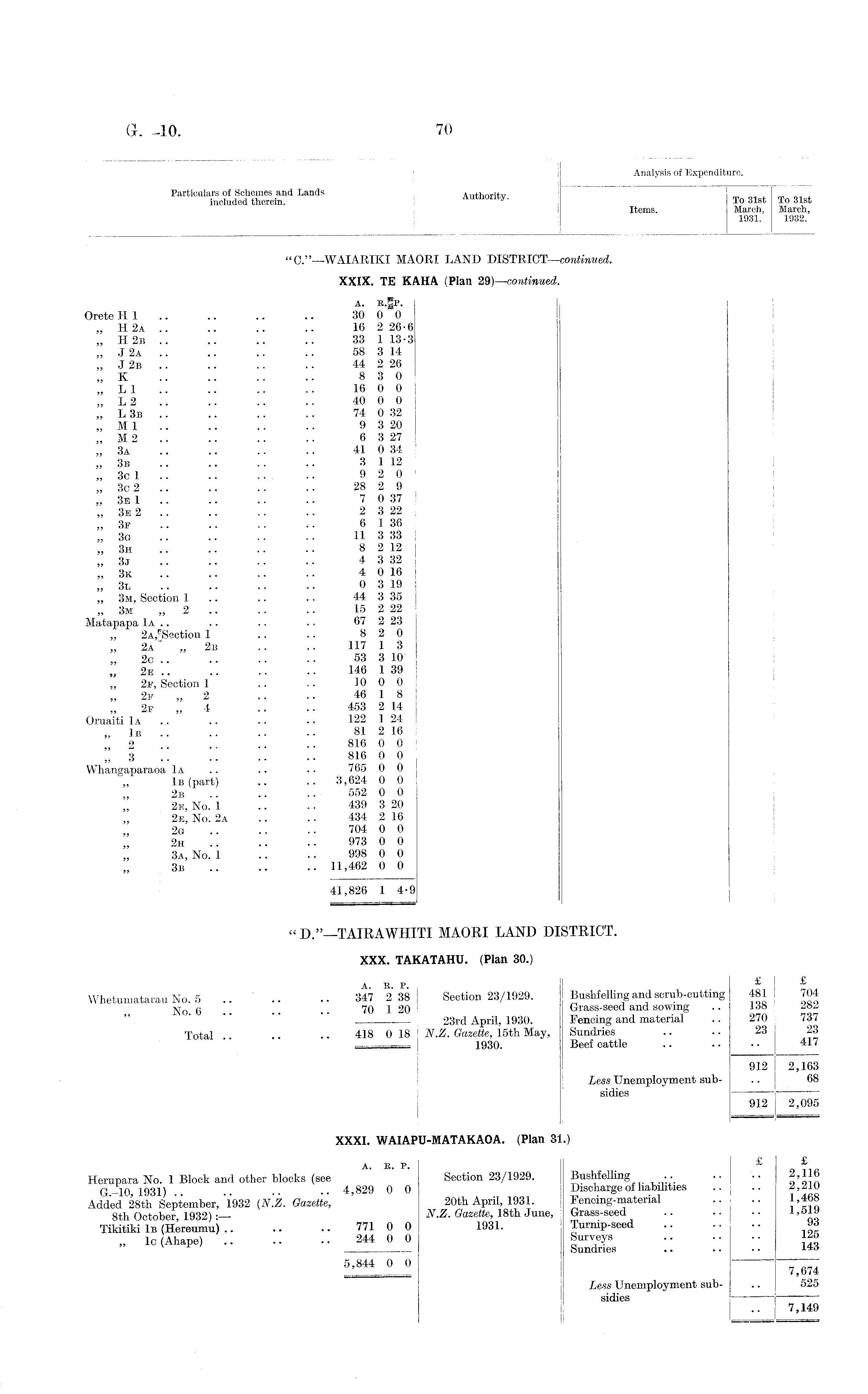 Analysis of Expenditure. Particulars of Schemes and Lands Authority ! „ * included therein. [ To 31st To 31st Items. March, March, 1931. 1932. "C."—WAIARIKI MAORI LAND DISTRICT—continued. XXIX. TE KAHA (Plan 29)—continued. A. B.§P. Orete HI .. .. .. .. 30 0 0 „ H2A 16 2 26-6 „ H2b .. .. .. .. 33 1 13-3 „ J 2a .. .. .. .. 58 3 14 „ J 2B .. .. .. .. 44 2 26 „ K 8 3 0 „ LI .. .. .. .. 16 0 0 „ L2 .. .. .. .. 40 0 0 „ L 3b 74 0 32 „ Ml .. .. .. .. 9 3 20 „ M 2 .. .. .. .. 6 3 27 „ 3A .. .. .. .. 41 0 34 „ 3B 3 1 12 „ 3c 1 .. .. 9 2 0 „ 3o 2 .. .. .. .. 28 2 9 „ 3E 1 7 0 37 „ 3B 2 .. .. .. .. 2 3 22 „ 3f .. .. .. 6 1 36 „ 3g 11 3 33 „ 3h 8 2 12 „ 3j 4 3 32 „ 3k .. .. .. .. 4 0 16 „ 3l 0 3 19 „ 3m, Section 1 .. .. 44 3 35 „ 3m „ 2 .. .. 15 2 22 Matapapa Ia .. .. .. ■. 67 2 23 „ 2a,"Section 1 .. .. 8 2 0 2a/ „ 2B .. .. 117 1 3 2c 53 3 10 2e 146 1 39 „ 2f, Section 1 .. • • 10 0 0 ,, 2f ,,2 .. . • 46 1 8 2f „ 4 .. .. 453 2 14 Oruaiti 1a .. .. .. 122 1 24 1b . .. .. 81 2 16 2 .. .. •- 816 0 0 „3 .. .. .. •• 816 0 0 Whangaparaoa 1a .. .. .. 765 0 0 „ 1b (part) .. .. 3,624 0 0 2b 552 0 0 2e, No. 1 .. • • 439 3 20 2b, No. 2a .. .. 434 2 16 2g 704 0 0 2H 973 0 0 3a, NO. I .. .. 998 0 0 3B 11,462 0 0 41,826 1 4-9 " D.'' —TAIRA WHĪTI MAORI LAND DISTRICT. XXX. TAKATAHU. (Plan 30.) A R P £ £ Whetumatarau No. 5 .. .. .. 347 2 38 Section 23/1929. BushfeUing and scrub-cutting 481 704 g _ 70 1 20 Grass-seed and sowing .. 138 23rd April, 1930. Fencing and material .. 270 737 Total .. .. .. %18 0 18 N.Z. Gazette, 15th May, Sundries .. • ■ 23 23 . . — 1930. Beef cattle .. .. • • 417 912 2,163 Less Unemployment sub- .. 68 sidies 912 2,095 XXXI. WAIAPU-MATAKAOA. (Plan 31.) A. b. p. £ £ Herupara No. 1 Block and other blocks (see Section 23/1929. Bushfeffing .. .. •• 2,116 G-10 1931) • •• 4,829 0 0 Discharge of liabilities .. .. Added 28th September, 1932 (N.Z. Gazette, ' 20th April, 1931. Fencing-material .. 1,468 8th October, 1932) N.Z. Gazette, 18th June, Grass-seed .. .. •• 1,519 Tikitiki 1b (Hereumu) 771 0 0 1931. Turnip-seed 93 » lc (Ahape) »4 » " " !! IS 5 ' 844 ° ° 7,674 Less Unemployment sub- .. 525 sidies 7,149