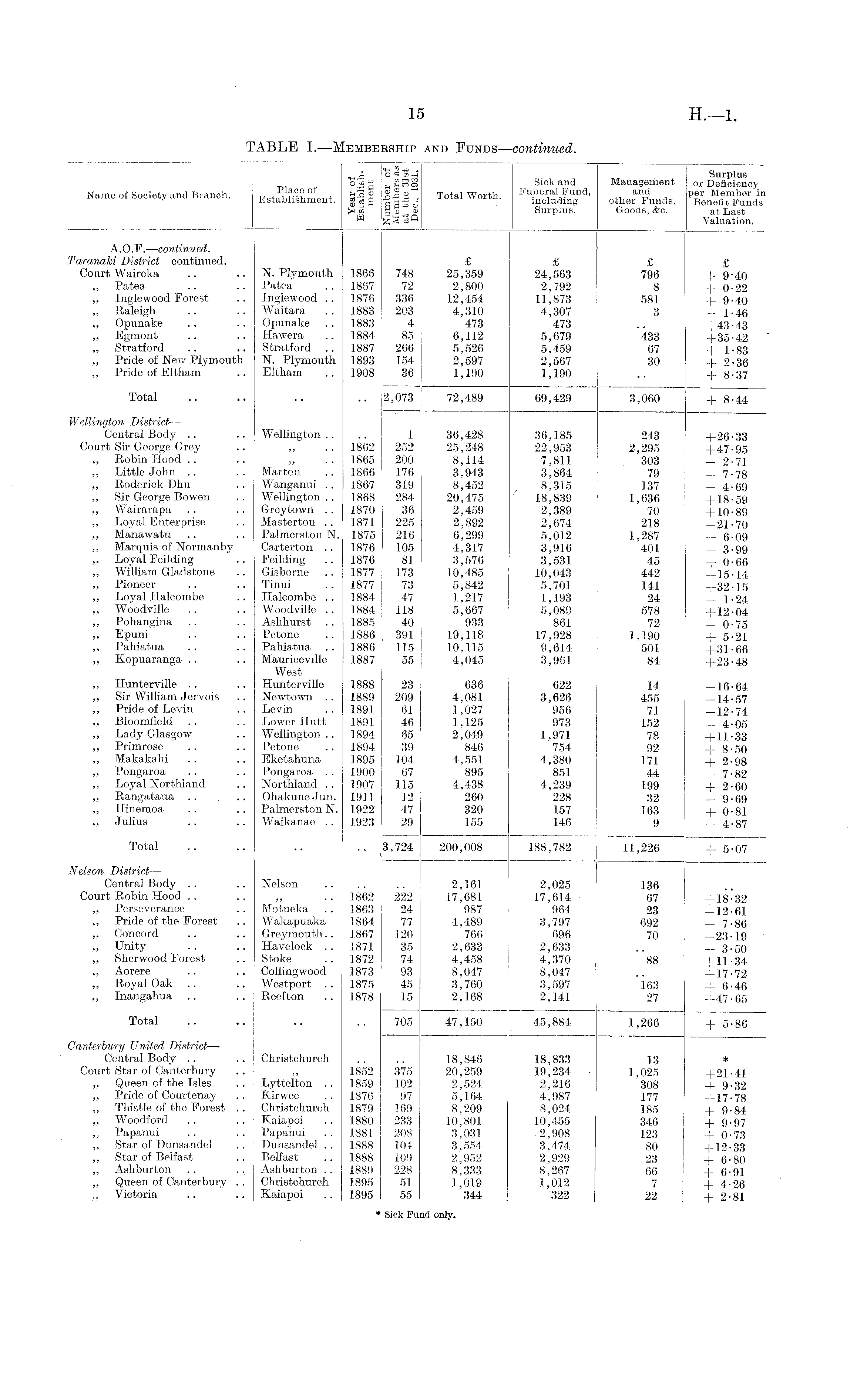 A o 50 "S j4 Surplus o.cfl-g Sick and Management or Deficiency Name of Society and Branch. watfhfistSfor.t a 3 S Ji.2 2"! Total Worth. funeral Fund, and per Member in listablisnment. g ts g a 35 o including other Funds, Benefit Funds lx« I S ® Surplus. Goods, &c. at Last ~ o3 q Valuation. A.O.F. —continued. Taranaki District—continued. £ £ £ £ Court Waireka .. .. N. Plymouth 1866 748 25,359 24,563 796 4- 9*40 „ Patea .. .. Patea .. 1867 72 2,800 2,792 8 + 0-22 „ Inglewood Forest .. Inglewood .. 1876 336 12,454 11,873 581 + 9-40 „ Raleigh .. .. Waitara .. 1883 203 4,310 4,307 3 _ 1-46 „ Opunake .. .. Opunake .. 1883 4 473 473 .. +43-43 „ Egmont .. .. Hawera .. 1884 85 6,112 5,679 433 +35-42 „ Stratford .. .. Stratford .. 1887 266 5,526 5,459 67 + 1-83 „ Pride of New Plymouth N. Plymouth 1893 154 2,597 2,567 30 + 2-36 ,, Pride of Eltham .. Eltham .. 1908 36 1,190 1,190 .. -(-8.37 Total .. .. .. .. 2,073 72,489 69,429 3,060 + 8-44 Wellington District— Central Body .. .. Wellington.. .. 1 36,428 36,185 243 +26-33 Court Sir George Grey .. ,, .. 1862 252 25,248 22,953 2,295 +47-95 „ Robin Hood .. .. „ .. 1865 200 8,114 7,811 303 — 2-71 ,, Little John .. .. Marton .. 1866 176 3,943 3,864 79 — 7-78 ,, Roderick ī)hu .. Wanganui .. 1867 319 8,452 8,315 137 — 4-69 „ Sir George Bowen .. Wellington.. 1868 284 20,475 / 18,839 1,636 +18-59 „ Wairarapa .. .. Greytown .. 1870 36 2,459 2,389 70 +10-89 ,, Loyal Enterprise .. Masterton .. 1871 225 2,892 2,674 218 -21-70 ,, Manawatu .. .. Palmerston N. 1875 216 6,299 5,012 1,287 — 6-09 „ Marquis of Normanby Carterton .. 1876 105 4,317 3,916 401 — 3-99 „ Loyal Feilding .. Feilding .. 1876 81 3,576 3,531 45 + 0-66 „ William Gladstone .. Gisborne .. 1877 173 10,485 10,043 442 +15-14 ,, Pioneer .. .. Tinui .. 1877 73 5,842 5,701 141 +32-15 „ Loyal Halcombe .. Halcombe .. 1884 47 1,217 1,193 24 — 1-24 „ Woodville .. .. Woodville .. 1884 118 5,667 5,089 578 +1.2-04 „ Pohangina .. .. Ashhurst .. 1885 40 933 861 72 — 0-75 „ Epuni .. .. Petone .. 1886 391 19,118 17,928 1,190 + 5-21 ,, Pahiatua .. .. Pahiatua .. 1886 115 10,115 9,614 501 +31-66 „ Kopuaranga .. .. Mauriceville 1887 55 4,045 3,961 84 +23-48 West „ Hunterville .. .. Hunterville 1888 23 636 622 14 -16-64 ,, Sir William Jervois .. Newtown .. 1889 209 4,081 3,626 455 -14-57 ,, Pride of Levin .. Levin .. 1891 61 1,027 956 71 —12-74 „ Bloomfield .. .. Lower Hutt 1891 46 1,125 973 152 — 4-05 „ Lady Glasgow .. Wellington.. 1894 65 2,049 1,971 78 +11-33 ,, Primrose .. .. Petone .. 1894 39 846 754 92 + 8-50 „ Makakahi .. .. Eketahuna 1895 104 4,551 4,380 171 -j- 2-98 ,, Pongaroa .. .. Pongaroa .. 1900 67 895 851 44 — 7-82 „ Loyal Northland .. Northland .. 1907 115 4,438 4,239 199 4. 2-60 „ Rangataua .. .. OhakuneJun. 1911 12 260 228 32 — 9-69 ,, Hinemoa .. .. Palmerston N. 1922 47 320 157 163 + 0-81 „ Julius .. .. Waikanae .. 1923 29 155 146 9 — 4-87 Total .. .. .. .. 3,724 200,008 188,782 11,226 + 5-07 Nelson District — Central Body .. .. Nelson .. .. .. 2,161 2,025 136 Court Robin Hood .. .. ,, .. 1862 222 17,681 17,614 67 +18-32 ,, Perseverance .. Motueka .. 1863 24 987 964 23 —12-61 ,, Pride of the Forest .. Wakapuaka 1864 77 4,489 3,797 692 — 7-86 „ Concord .. .. Greymouth.. 1867 120 766 696 70 -23-19 „ Unity .. .. Haveloek .. 1871 35 2,633 2,633 .. — 3.50 „ Sherwood Forest .. Stoke .. 1872 74 4,458 4,370 88 +11-34 ,, Aorere .. .. Collingwood 1873 93 8,047 8,047 .. +17-72 „ Royal Oak .. .. Westport .. 1875 45 3,760 3,597 163 + 6-46 „ Inangahua .. .. Reefton .. 1878 15 2,168 2,141 27 +47-65 Total .. .. .. .. 705 47,150 45,884 1,266 + 5-86 Canterbury United District— Central Body .. .. Christchurch .. .. 18,846 18,833 13 * Court Star of Canterbury .. „ 1852 375 20,259 19,234 1,025 +21-41 „ Queen of the Isles .. Lyttelton .. 1859 102 2,524 2,216 308 + 9-32 „ Pride of Courtenay .. Kirwee .. 1876 97 5,164 4,987 177 +17-78 „ Thistle of the Forest .. Christchurch 1879 169 8,209 8,024 185 + 9-84 „ Woodford .. .. Kaiapoi .. 1880 233 10,801 10,455 346 + 9-97 „ Papanui .. .. Paparnui .. 1881 208 3,031 2,908 123 + 0-73 „ Star of Dunsandel .. Dunsandel .. 1888 104 3,554 3,474 80 +12-33 „ Star of Belfast .. Belfast .. 1888 109 2,952 2,929 23 + 6-80 „ Ashburton .. ., Ashburton .. 1889 228 8,333 8,267 66 + 6-91 „ Queen of Canterbury .. Christchurch 1895 51 1,019 1,012 7 -f- 4-26 Victoria .. .. Kaiapoi .. 1895 55 344 322 | 22 +2-81 * Sick Fund only.