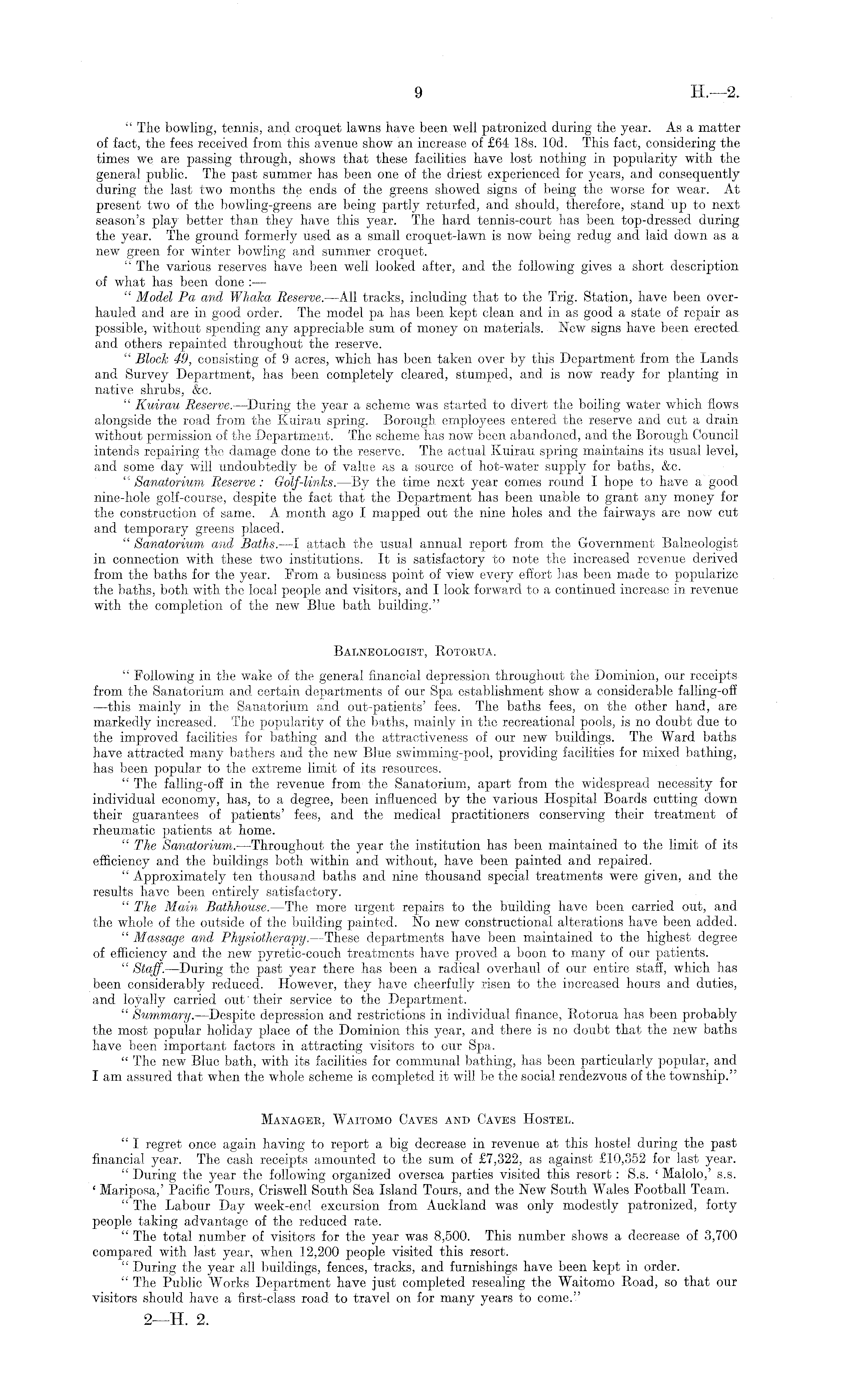 " The bowling, tennis, and croquet lawns have been well patronized during the year. As a matter of fact, the fees received from this avenue show an increase of £64 18s. lOd. This fact, considering the times we are passing through, shows that these facilities have lost nothing in popularity with the general public. The past summer has been one of the driest experienced for years, and consequently during the last two months the ends of the greens showed signs of being the worse for wear. At present two of the bowling-greens are being partly returfed, and should, therefore, stand up to next season's play better than they have this year. The hard tennis-court has been top-dressed during the year. The ground formerly used as a small croquet-lawn is now being redug and laid down as a new green for winter bowling and summer croquet. " The various reserves have been well looked after, and the following gives a short description of what has been done :— " Model Pa and Whaka Reserve. —All tracks, including that to the Trig. Station, have been overhauled and are in good order. The model pa has been kept clean and in as good a state of repair as possible, without spending any appreciable sum of money on materials. New signs have been erected and others repainted throughout the reserve. V Block 49, consisting of 9 acres, which has been taken over by this Department from the Lands and Survey Department, has been completely cleared, stumped, and is now ready for planting in native shrubs, &c. " Kuirau Reserve. —During the year a scheme was started to divert the boiling water which flows alongside the road from the Kuirau spring. Borough employees entered the reserve and cut a drain without permission of the Department. The scheme has now been abandoned, and the Borough Council intends repairing the damage done to the reserve. The actual Kuirau spring maintains its usual level, and some day will undoubtedly be of value as a source of hot-water supply for baths, &c. " Sanatorium Reserve: Golf-links.— By the time next year comes round I hope to have a good nine-hole golf-course, despite the fact that the Department has been unable to grant any money for the construction of same. A month ago I mapped out the nine holes and the fairways are now cut and temporary greens placed. " Sanatorium and Baths. —I attach the usual annual report from the Government Balneologist in connection with these two institutions. It is satisfactory to note the increased revenue derived from the baths for the year. From a business point of view every effort has been made to popularize the baths, both with the local people and visitors, and I look forward to a continued increase in revenue with the completion of the new Blue bath building." Balneologist, Rotorua. " Following in the wake of the general financial depression throughout the Dominion, our receipts from the Sanatorium, and certain departments of our Spa establishment show a considerable falling-off —this mainly in the Sanatorium and out-patients' fees. The baths fees, on the other hand, are markedly increased. The popularity of the baths, mainly in the recreational, pools, is no doubt due to the improved facilities for bathing and the attractiveness of our new buildings. The Ward baths have attracted many bathers and the new Blue swimming-pool, providing facilities for mixed bathing, has been popular to the extreme limit of its resources. " The falling-off in the revenue from 1 the Sanatorium, apart from the widespread necessity for individual economy, has, to a degree, been influenced by the various Hospital Boards cutting down their guarantees of patients' fees, and the medical practitioners conserving their treatment of rheumatic patients at home. " The Sanatorium.—Throughout the year the institution has been maintained to the limit of its efficiency and the buildings both within and without, have been painted and repaired. " Approximately ten thousand baths and nine thousand special treatments were given, and the results have been entirely satisfactory. " The Main Bathhouse.—The more urgent repairs to the building have been carried out, and the whole of the outside of the building painted. No new constructional alterations have been added. " Massage and Physiotherapy. —These departments have been maintained to the highest degree of efficiency and the new pyretic-couch treatments have proved a boon to many of our patients. " Staff. —During the past year there has been a radical overhaul of our entire stafi, which has been considerably reduced. However, they have cheerfully risen to the increased hours and duties, and loyally carried out' their service to the Department. " Summary. —Despite depression and restrictions in individual finance, Rotorua has been probably the most popular holiday place of the Dominion this year, and there is no doubt that the new baths have been important factors in attracting visitors to our Spa. " The new Blue bath, with its facilities for communal bathing, has been particularly popular, and I am assured that when the whole scheme is completed it will be the social rendezvous of the township." Manager, Waitomo Caves and Caves Hostel. " I regret once again having to report a big decrease in revenue at this hostel during the past financial year. The cash receipts amounted to the sum of £7,322, as against £10,352 for last year. " During the year the following organized oversea parties visited this resort: S.s. ' Malolo,' s.s. ' Mariposa,' Pacific Tours, Criswell South Sea Island Tours, and the New South Wales Football Team. " The Labour Day week-end excursion from Auckland was only modestly patronized, forty people taking advantage of the reduced rate. " The total number of visitors for the year was 8,500. This number shows a decrease of 3,700 compared with last year, when 12,200 people visited this resort. " During the year all buildings, fences, tracks, and furnishings have been kept in order. " The Public Works De