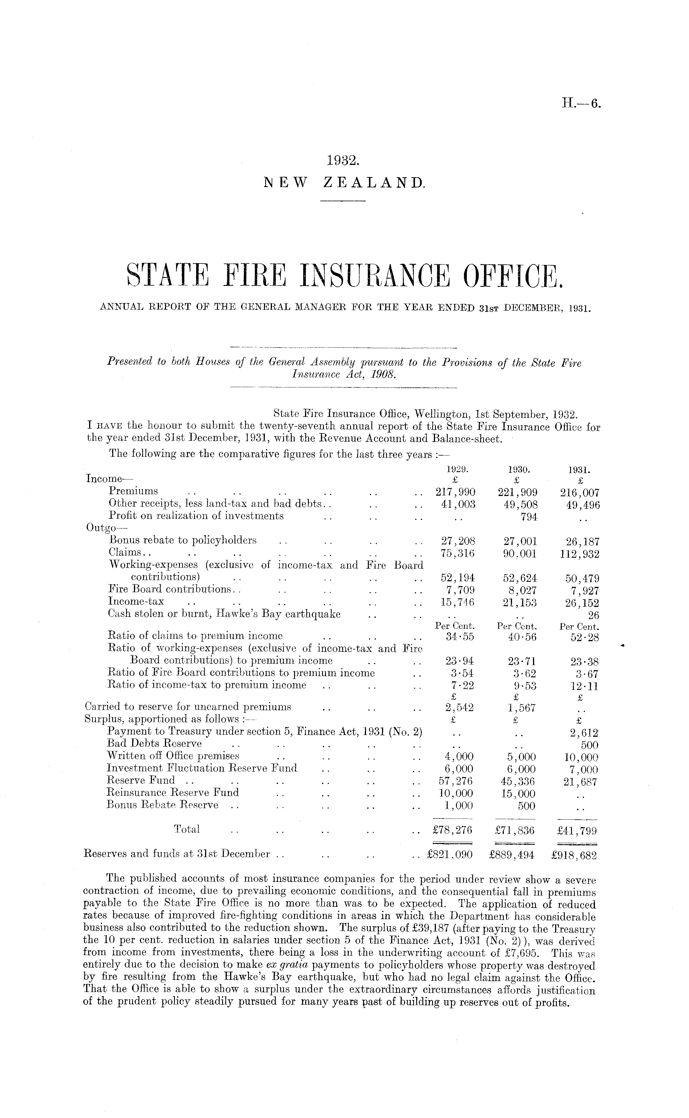 STATE FIRE INSURANCE OFFICE. ANNUAL REPORT OF THE GENERAL MANAGER FOR THE YEAR ENDED 31st DECEMBER, 1931.