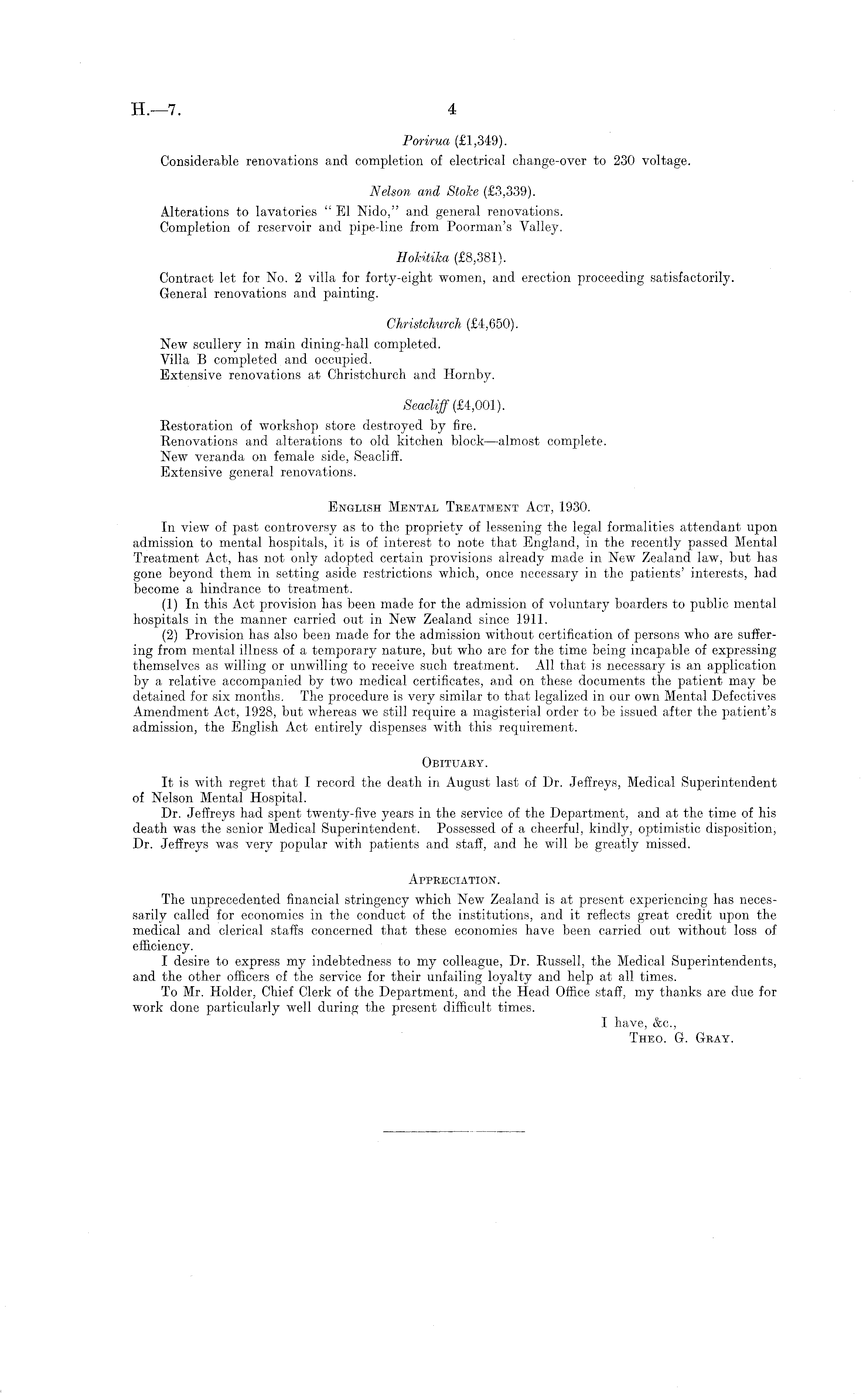 Porirua (£1,349). Considerable renovations and completion of electrical change-over to 230 voltage. Nelson and Stoke (£3,339). Alterations to lavatories " El Nido," and general renovations. Completion of reservoir and pipe-line from Poorman's Valley. Hokitika (£8,381). Contract let for No. 2 villa for forty-eight women, and erection proceeding satisfactorily. General renovation's and painting. Christchurch (£4,650). New scullery in main dining-hall completed. Villa B completed and occupied. Extensive renovations at Christchurch and Hornby. SeacliJJ (£4,001). Restoration of workshop store destroyed by fire. Renovations and alterations to old kitchen block —almost complete. New veranda on female side, Seacliff. Extensive general renovations. English Mental Treatment Aot, 1930. In view of past controversy as to the propriety of lessening the legal formalities attendant upon admission to mental hospitals, it is of interest to note that England, in the recently passed Mental Treatment Act, has not only adopted certain provisions already made in New Zealand law, but has gone beyond them in setting aside restrictions which, once necessary in the patients' interests, had become a hindrance to treatment. (1) In this Act provision has been made for the admission of voluntary boarders to public mental hospitals in the manner carried out in New Zealand since 1911. (2) Provision has also been made for the admission without certification of persons who are suffering from mental illness of a temporary nature, but who are for the time being incapable of expressing themselves as willing or unwilling to receive such treatment. All that is necessary is an application by a relative accompanied by two medical certificates, and on these documents the patient may be detained for six months. The procedure is very similar to that legalized in our own Mental Defectives Amendment Act, 1928, but whereas we still require a magisterial order to be issued after the patient's admission, the English Act entirely dispenses with this requirement. Obituary. It is with regret that I record the death in August last of Dr. Jeffreys, Medical Superintendent of Nelson Mental Hospital. Dr. Jeffreys had spent twenty-five years in the service of the Department, and at the time of his death was the senior Medical Superintendent. Possessed of a cheerful, kindly, optimistic disposition, Dr. Jeffreys was very popular with patients and staff, and he will be greatly missed. Appreciation. The unprecedented financial stringency which New Zealand is at present experiencing has necessarily called for economies in the conduct of the institutions, and it reflects great credit upon the medical and clerical staffs concerned that these economies have been carried out without loss of efficiency. I desire to express my indebtedness to my colleague, Dr. Russell, the Medical Superintendents, and the other officers of the service for their unfailing loyalty and help at all times. To Mr. Holder, Chief Clerk of the Department, and the Head Office staff, my thanks are due for work done particularly well during the present difficult times. I have, &c., Theo. G. Gray.