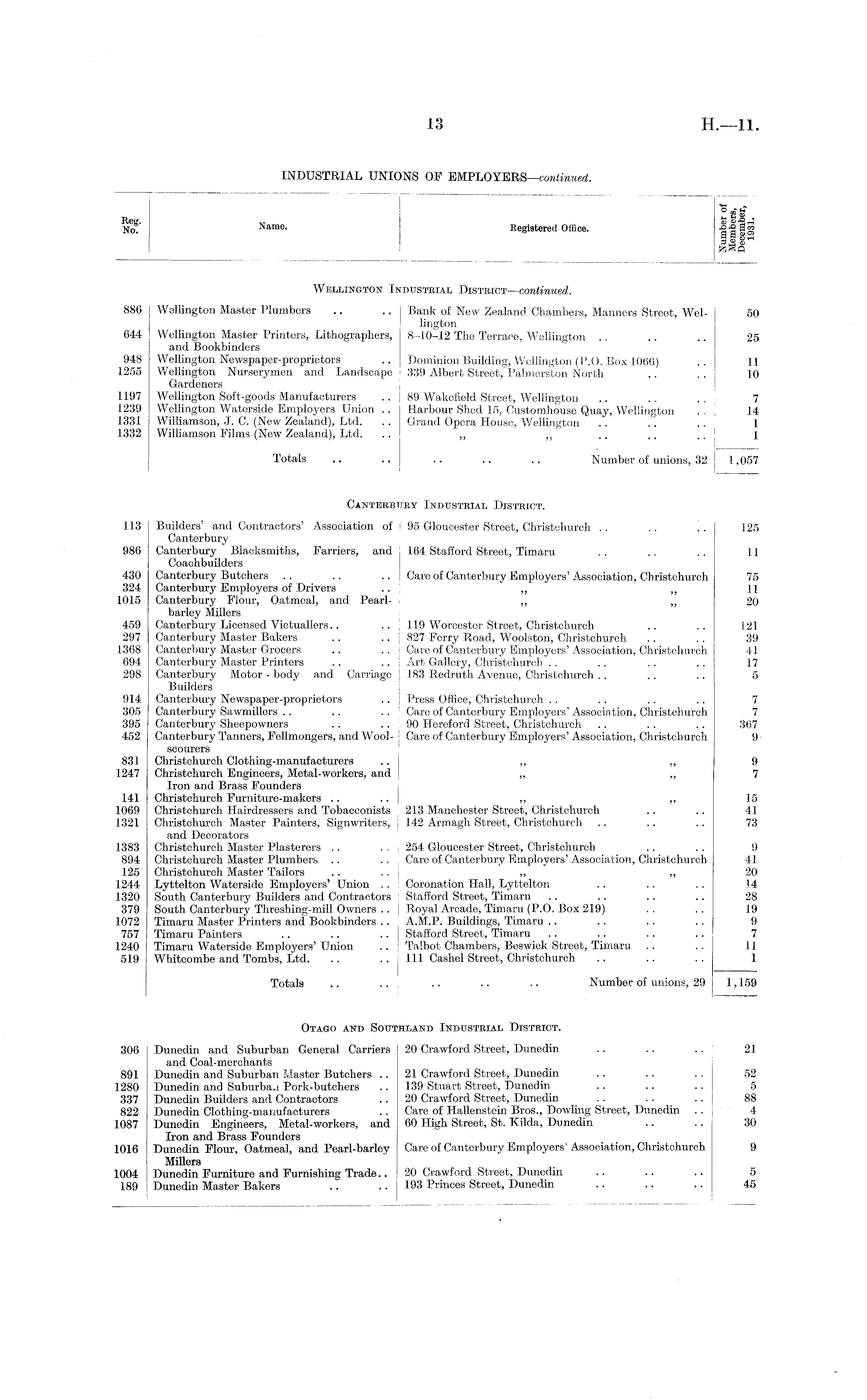 03 ** Reg, „ S3 S-§r-5 N 0> Name. Registered Office. agIos IJ1 W Wellington Industrial District—continued. 886 Wellington Master Plumbers .. .. Bank of New Zealand Chambers, Manners Street, Wei- 60 lington 644 Wellington Master Printers, Lithographers, 8-10-12 The Terrace, Wellington . , .. .. 25 and Bookbinders 948 Wellington Newspaper-proprietors .. Dominion Building, Wellington (P.O. Box 1066) .. 11 1255 Wellington Nurserymen and Landscape 339 Albert Street, Palmerston North .. .. 10 Gardeners 1197 Wellington Soft-goods Manufacturers .. 89 Wakefield Street, Wellington .. .. 7 1239 Wellington Waterside Employers Union .. Harbour Shed 15, Customhouse Quay, Wellington .. 14 1331 Williamson, J. C. (New Zealand), Ltd. .. Grand Opera House, Wellington .. .. .. 1 1332 Williamson Films (New Zealand), Ltd. .. „ „ .. .. .. 1 Totals .. .. .. .. .. Number of unions, 32 1,057 Canterbury Industrial District. 113 Builders' and Contractors' Association of 95 Gloucester Street, Christehurch .. . . .. 125 Canterbury 986 Canterbury Blacksmiths, Farriers, and 164 Stafford Street, Timaru .. .. .. 11 Coachbuilders 430 Canterbury Butchers .. .. .. Care of Canterbury Employers' Association, Christchurch 75 324 Canterbury Employers of Drivers .. ,, H 1015 Canterbury Flour, Oatmeal, and Pearl- „ „ 20 barley Millers 459 Canterbury Licensed Victuallers.. .. 119 Worcester Street, Christchurch .. .. 121 297 Canterbury Master Bakers .. .. 827 Ferry Road, Woolston, Christchurch .. .. 39 1368 Canterbury Master Grocers .. .. Care of Canterbury Employers' Association, Christchurch 41 694 Canterbury Master Printers .. .. Art Gallery, Christchurch .. .. . . .. 17 298 Canterbury Motor - body and Carriage 183 Redruth Avenue, Christchurch .. .. .. 5 Builders 914 Canterbury Newspaper-proprietors .. Press Office, Christchurch .. .. .. .. 7 305 Canterbury Sawmillers .. .. .. Care of Canterbury Employers' Association, Christchurch 7 395 Canterbury Sheepowners .. 90 Hereford Street, Christchurch .. .. .. 367 452 Canterbury Tanners, Fellmongers, and Wool- Care of Canterbury Employers'Association, Christchurch 9scourers 831 Christchurch Clothing-manufacturers .. ,, „9 1247 Christchurch Engineers, Metal-workers, and „ „ 7 Iron and Brass Founders 141 Christchurch Furniture-makers .... ,, ,, 15 1069 Christchurch Hairdressers and Tobacconists 213 Manchester Street, Christchurch .. .. 41 1321 Christchurch Master Painters, Signwriters, 142 Armagh Street, Christchurch .. .. .. 73 and Decorators 1383 Christchurch Master Plasterers .. . . 254 Gloucester Street, Christchurch .. .. 9 894 Christchurch Master Plumbers .. .. Care of Canterbury Employers' Association, Christchurch 41 125 Christchurch Master Tailors .... „ „ 20 1244 Lyttelton Waterside Employers' Union ., Coronation Hall, Lyttelton .. .. .. 14 1320 South Canterbury Builders and Contractors Stafford Street, Timaru .. .. .. .. 28 379 South Canterbury Threshing-mill Owners .. Royal Arcade, Timaru (P.O. Box 219) .. .. 19 1072 Timaru Master Printers and Bookbinders .. A.M.P. Buildings, Timaru .. .. .. .. 9 757 Timaru Painters .. .. .. Stafford Street, Timaru .. .. . . . . 7 1240 Timaru Waterside Employers' Union .. Talbot Chambers, Beswick Street, Timaru .. .. 11 519 Whiteombe and Tombs, Ltd. .. Ill Cashel Street, Christchurch .. .. . . 1 Totals .. .. .. .. .. Number of unions, 29 1,159 Otago and Southland Industrial District. 306 Dunedin and Suburban General Carriers 20 Crawford Street, Dunedin . . .. .. 21 and Coal-merchants 891 Dunedin and Suburban Master Butchers .. 21 Crawford Street, Dunedin .. .. . . 52 1280 Dunedin and Suburban Pork-butchers .. 139 Stuart Street, Dunedin .. .. .. 5 337 Dunedin Builders and Contractors .. 20 Crawford Street, Dunedin .. . . .. 88 822 Dunedin Clothing-manufacturers .. Care of Hallenstein Bros., Dowling Street, Dunedin .. 4 1087 Dunedin Engineers, Metal-workers, and 60 High Street, St. Kilda, Dunedin .. .. 30 Iron and Brass Founders 1016 Dunedin Flour, Oatmeal, and Pearl-barley Care of Canterbury Employers' Association, Christchurch 9 Millers 1004 Dunedin Furniture and Furnishing Trade.. 20 Crawford Street, Dunedin .. .. .. 5 189 Dunedin Master Bakers .. .. 193 Princes Street, Dunedin .. .. .. 45