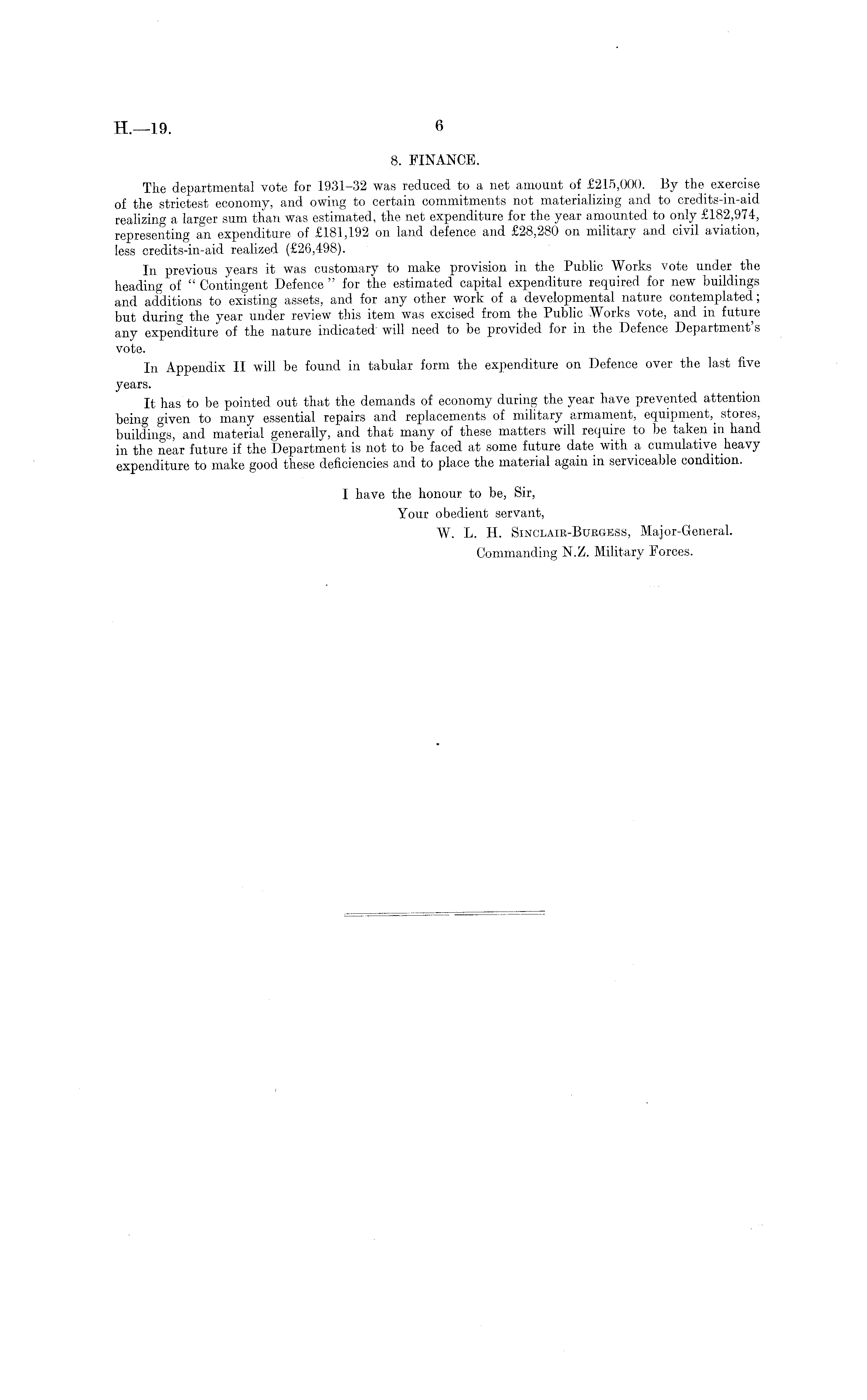 8. FINANCE. The departmental vote for 1931-32 was reduced to a net amount of £215,000. By the exercise of the strictest economy, and owing to certain commitments not materializing and to credits-in-aid realizing a larger sum than was estimated, the net expenditure for the year amounted to only £182,974, representing an expenditure of £181,192 on land defence and £28,280 on military and civil aviation, less credits-in-aid realized (£26,498). In previous years it was customary to make provision in the Public Works vote under the heading of " Contingent Defence " for the estimated capital expenditure required for new buildings and additions to existing assets, and for any other work of a developmental nature contemplated; but durins; the year under review this item was excised from the Public Works vote, and in future any expenditure of the nature indicated will need to be provided for in the Defence Department's vote. In Appendix II will be found in tabular form the expenditure on Defence over the last five years. It has to be pointed out that the demands of economy during the year have prevented attention being given to many essential repairs and replacements of military armament, stores, buildings, and material generally, and that many of these matters will require to be taken in hand in the near future if the Department is not to be "faced at some future date with a cumulative heavy expenditure to make good these deficiencies and to place the material again in serviceable condition. I have the honour to be, Sir, Your obedient servant, W. L. H. Sinclaik-Bubgess, Major-General. Commanding N.Z. Military Forces.