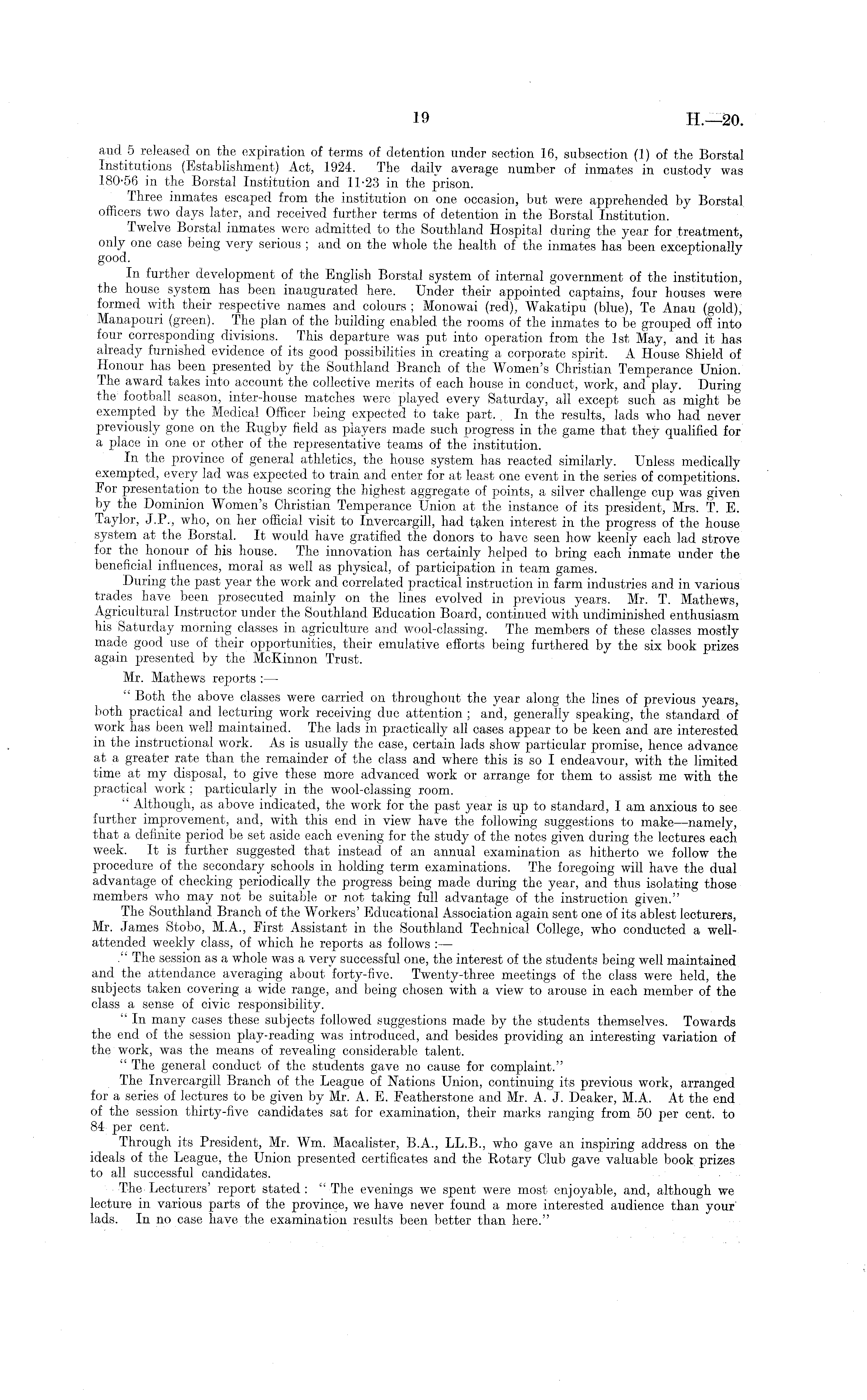 and 5 released on the expiration of terms of detention under section 16, subsection (1) of the Borstal Institutions (Establishment) Act, 1924. The daily average number of inmates in custody was 180-56 in the Borstal Institution and 11-23 in the prison. Three inmates escaped from the institution on one occasion, but were apprehended by Borstal officers two days later, and received further terms of detention in the Borstal Institution. Twelve Borstal inmates were admitted to the Southland Hospital during the year for treatment, only one case being very serious ; and on the whole the health of the inmates has been exceptionally good. In further development of the English Borstal system of internal government of the institution, the house system has been inaugurated here. Under their appointed captains, four houses were formed with their respective names and colours ; Monowai (red), Wakatipu (blue), Te Anau (gold), Manapouri (green). The plan of the building enabled the rooms of the inmates to be grouped off into four corresponding divisions. This departure was put into operation from the Ist May, and it has already furnished evidence of its good possibilities in creating a corporate spirit. A House Shield of Honour has been presented by the Southland Branch of the Women's Christian Temperance Union. The award takes into account the collective merits of each house in conduct, work, and play. During the football season, inter-house matches were played every Saturday, all except such as might be exempted by the Medical Officer being expected to take part, . In the results, lads who had never previously gone on the Rugby field as players made such progress in the game that they qualified for a place in one or other of the representative teams of the institution. In the province of general athletics, the house system has reacted similarly. Unless medically exempted, every lad was expected to train and enter for at least one event in the series of competitions. For presentation to the house scoring the highest aggregate of points, a silver challenge cup was given by the Dominion Women's Christian Temperance Union at the instance of its president, Mrs. T. E. Taylor, J.P., who, on her official visit to Invercargill, had interest in the progress of the house system at the Borstal. It would have gratified the donors to have seen how keenly each lad strove for the honour of his house. The innovation has certainly helped to bring each inmate under the beneficial influences, moral as well as physical, of participation in team games. During the past year the work and correlated practical instruction in farm industries and in various trades have been prosecuted mainly on the lines evolved in previous years. Mr. T. Mathews, Agricultural Instructor under the Southland Education Board, continued with undiminished enthusiasm his Saturday morning classes in agriculture and wool-classing. The members of these classes mostly made good use of their opportunities, their emulative efforts being furthered by the six book prizes again presented by the McKinnon Trust. Mr. Mathews reports :— •' Both the above classes were carried on throughout the year along the lines of previous years, both practical and lecturing work receiving due attention ; and, generally speaking, the standard of work has been well maintained. The lads in practically all cases appear to be keen and are interested in the instructional work. As is usually the case, certain lads show particular promise, hence advance at a greater rate than the remainder of the class and where this is so I endeavour, with the limited time at my disposal, to give these more advanced work or arrange for them to assist me with the practical work ; particularly in the wool-classing room. " Although, as above indicated, the work for the past year is up to standard, I am anxious to see further improvement, and, with this end in view have the following suggestions to make —namely, that a definite period be set aside each evening for the study of the notes given during the lectures each week. It is further suggested that instead of an annual examination as hitherto we follow the procedure of the secondary schools in holding term examinations. The foregoing will have the dual advantage of checking periodically the progress being made during the year, and thus isolating those members who may not be suitable or not taking full advantage of the instruction given." The Southland Branch of the Workers' Educational Association again sent one of its ablest lecturers, Mr. James St.obo, M.A., First Assistant in the Southland Technical College, who conducted a wellattended weekly class, of which he reports as follows : — ." The session as a whole was a very successful one, the interest of the students being well maintained and the attendance averaging about forty-five. Twenty-three meetings of the class were held, the subjects taken covering a wide range, and being chosen with a view to arouse in each member of the class a sense of civic responsibility. "In many cases these subjects followed suggestions made by the students themselves. Towards the end of the session play-reading was introduced, and besides providing an interesting variation of the work, was the means of revealing considerable talent. " The general conduct of the students gave no cause for complaint." The Invercargill Branch of the League of Nations Union, continuing its previous work, arranged for a series of lectures to be given by Mr. A. E. Featherstone and Mr. A. J. Deaker, M.A. At the end of the session thirty-five candidates sat for examination, their marks ranging from 50 per cent, to 84 per cent. Through its President, Mr. Wm. Macalister, 8.A., LL.B., who gave an inspiring address on the ideals of the League, the Union presented certificates and the Rotary Club gave valuable book prizes to all successful candidates. The Lecturers' report stated : " The evenings we spent were most enjoyable, and, although
