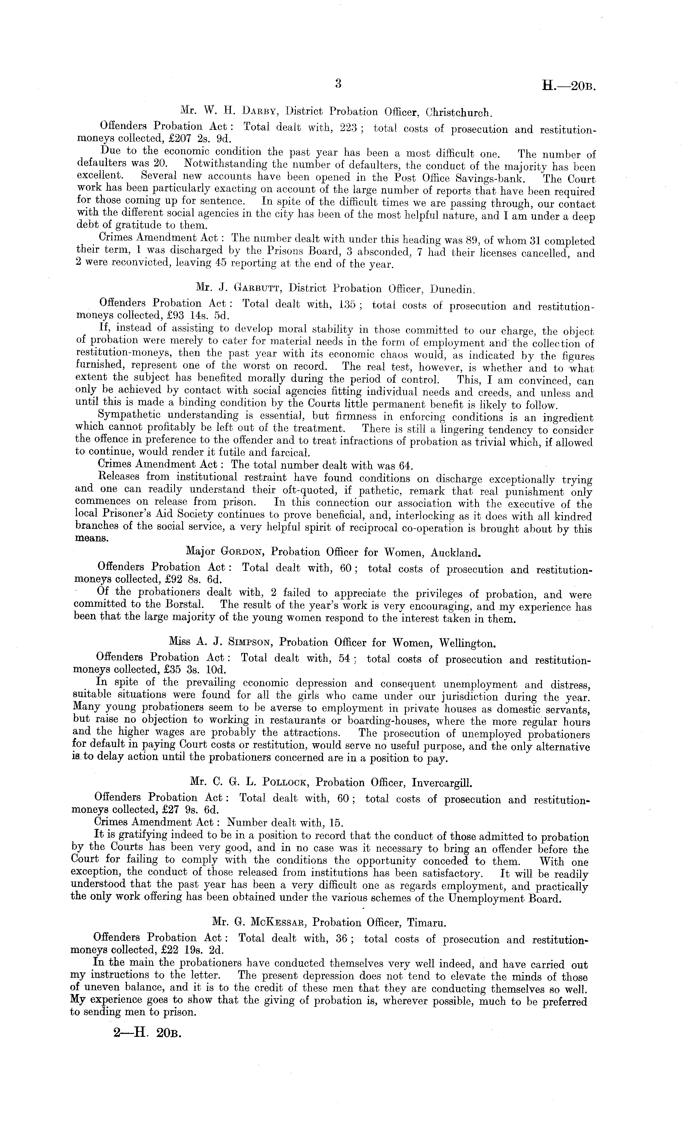 Mr. W. H. Dabby, District Probation Officer, Christchurch. Offenders Probation Act : Total dealt with, 223 ; total costs of prosecution and restitutionmoneys collected, £207 2s. 9d. Due to the economic condition the past year has been a most difficult one. The number of defaulters was 20. Notwithstanding the number of defaulters, the conduct of the majority has been excellent. Several new accounts have been opened in the Post Office Savings-bank. The Court work has been particularly exacting on account of the large number of reports that have been required for those coming up for sentence. In spite of the difficult times we are passing through, our contact with the different social agencies in the city has been of the most helpful nature, and I am under a deep debt of gratitude to them. Crimes Amendment Act: The number dealt with under this heading was 89, of whom 31 completed their term, 1 was discharged by the Prisons Board, 3 absconded, 7 had their licenses cancelled, and 2 were reconvicted, leaving 45 reporting at the end of the year. Mr. J. Gabbutt, District Probation Officer, Dunedin. Offenders Probation Act : Total dealt with, 135 ; total costs of prosecution and restitutionmoneys collected, £93 14s. sd. If, instead of assisting to develop moral stability in those committed to our charge, the object of probation were merely to cater for material needs in the form of employment and' the collection of restitution-moneys, then the past year with its economic chaos would, as indicated by the figures furnished, represent one of the worst on record. The real test, however, is whether and to what extent the subject has benefited morally during the period of control. This, lam convinced, can only be achieved by contact with social agencies fitting individual needs and creeds, and unless and until this is made a binding condition by the Courts little permanent benefit is likely to follow. Sympathetic understanding is essentia], but firmness in enforcing conditions is an ingredient which cannot profitably be left out of the treatment. There is still a lingering tendency to consider the offence in preference to the offender and to treat infractions of probation as trivial which, if allowed to continue, would render it futile and farcical. Crimes Amendment Act: The total number dealt with was 64. Releases from institutional restraint have found conditions on discharge exceptionally trying and one can readily understand their oft-quoted, if pathetic, remark that real punishment only commences on release from prison. In this connection our association with the executive of the local Prisoner's Aid Society continues to prove beneficial, and, interlocking as it does with all kindred branches of the social service, a very helpful spirit of reciprocal co-operation is brought about by this means. Major Gordon, Probation Officer for Women, Auckland. Offenders Probation Act.: Total dealt with, 60; total costs of prosecution and restitutionmoneys collected, £92 Bs. 6d. Of the probationers dealt with, 2 failed to appreciate the privileges of probation, and were committed to the Borstal. The result of the year's work is very encouraging, and my experience has been that the large majority of the young women respond to the interest taken in them. Miss A. J. Simpson, Probation Officer for Women, Wellington. Offenders Probation Act: Total dealt with, 54-; total costs of prosecution and restitutionmoneys collected, £35 3s. lOd. In spite of the prevailing economic depression and consequent unemployment and distress, suitable situations were found for all the girls who came under our jurisdiction during the year. Many young probationers seem to be averse to employment in private houses as domestic servants, but raise no objection to working in restaurants or boarding-houses, where the more regular hours and the higher wages are probably the attractions. The prosecution of unemployed probationers for default in paying Court costs or restitution, would serve no useful purpose, and the only alternative is to delay action until the probationers concerned are in a position to pay. Mr. C. G. L. Pollock, Probation Officer, Invercargill. Offenders Probation Act: Total dealt with, 60; total costs of prosecution and restitutionmoneys collected, £27 9s. 6d. Crimes Amendment Act: Number dealt with, 15. It is gratifying indeed to be in a position to record that the conduct of those admitted to probation by the Courts has been very good, and in no case was it necessary to bring an offender before the Court for failing to comply with the conditions the opportunity conceded to them. With one exception, the conduct of those released from institutions has been satisfactory. It will be readily understood that the past year has been a very difficult one as regards employment, and practically the only work offering has been obtained under the various schemes of the Unemployment Board. Mr. G. McKessab, Probation Officer, Timaru. Offenders Probation Act: Total dealt with, 36 ; total costs of prosecution and restitutionmoneys collected, £22 19s. 2d. In the main the probationers have conducted themselves very well indeed, and have carried out my instructions to the letter. The present depression does not tend to elevate the minds of those of uneven balance, and it is to the credit of these men that they are conducting themselves so well. My experience goes to show that the giving of probation is, wherever possible, much to be preferred to sending men to prison.