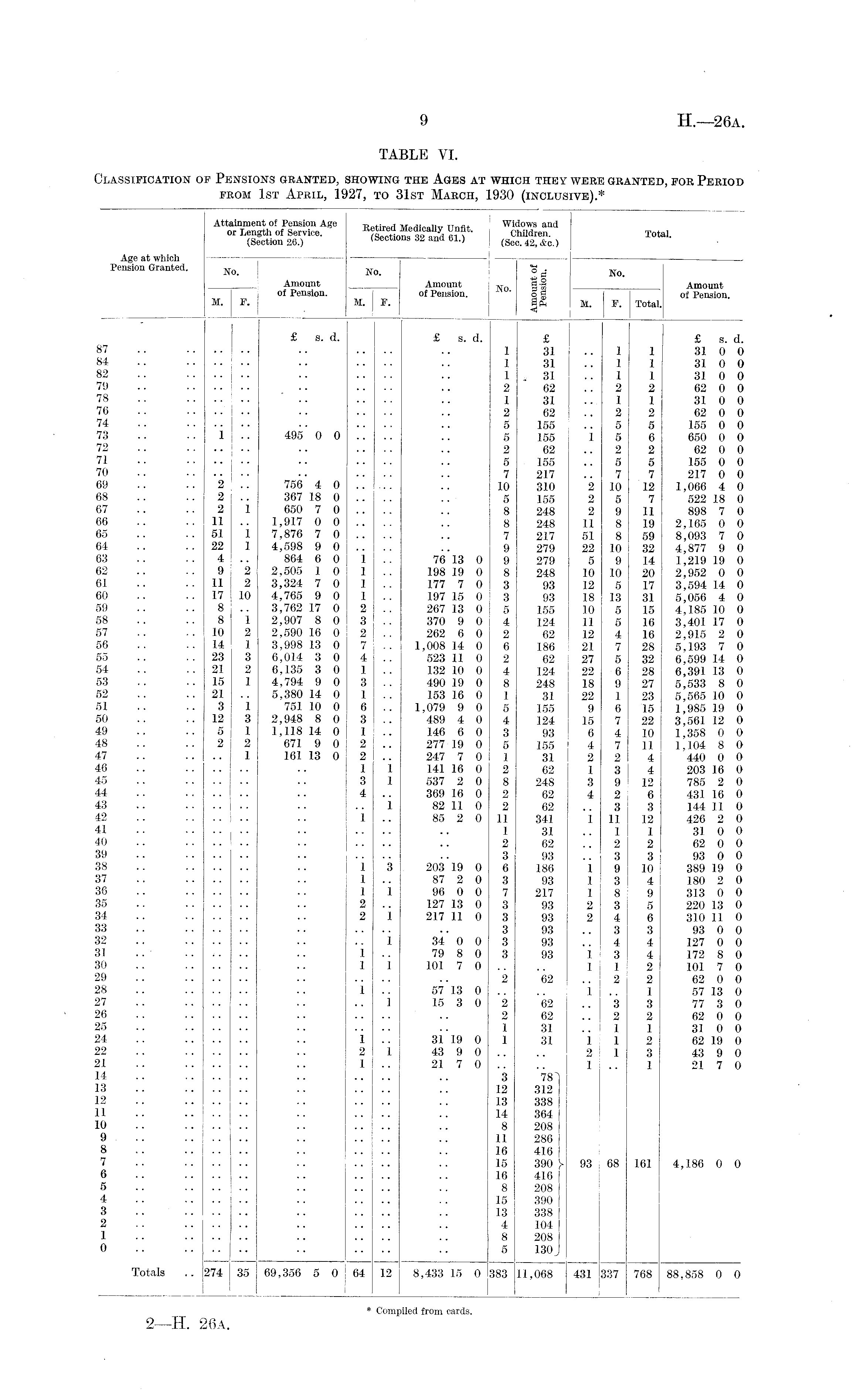 TABLE VI. Classification of Pensions granted, showing the Ages at which they were granted, for Period from 1st April, 1927, to 31st March, 1930 (inclusive).*