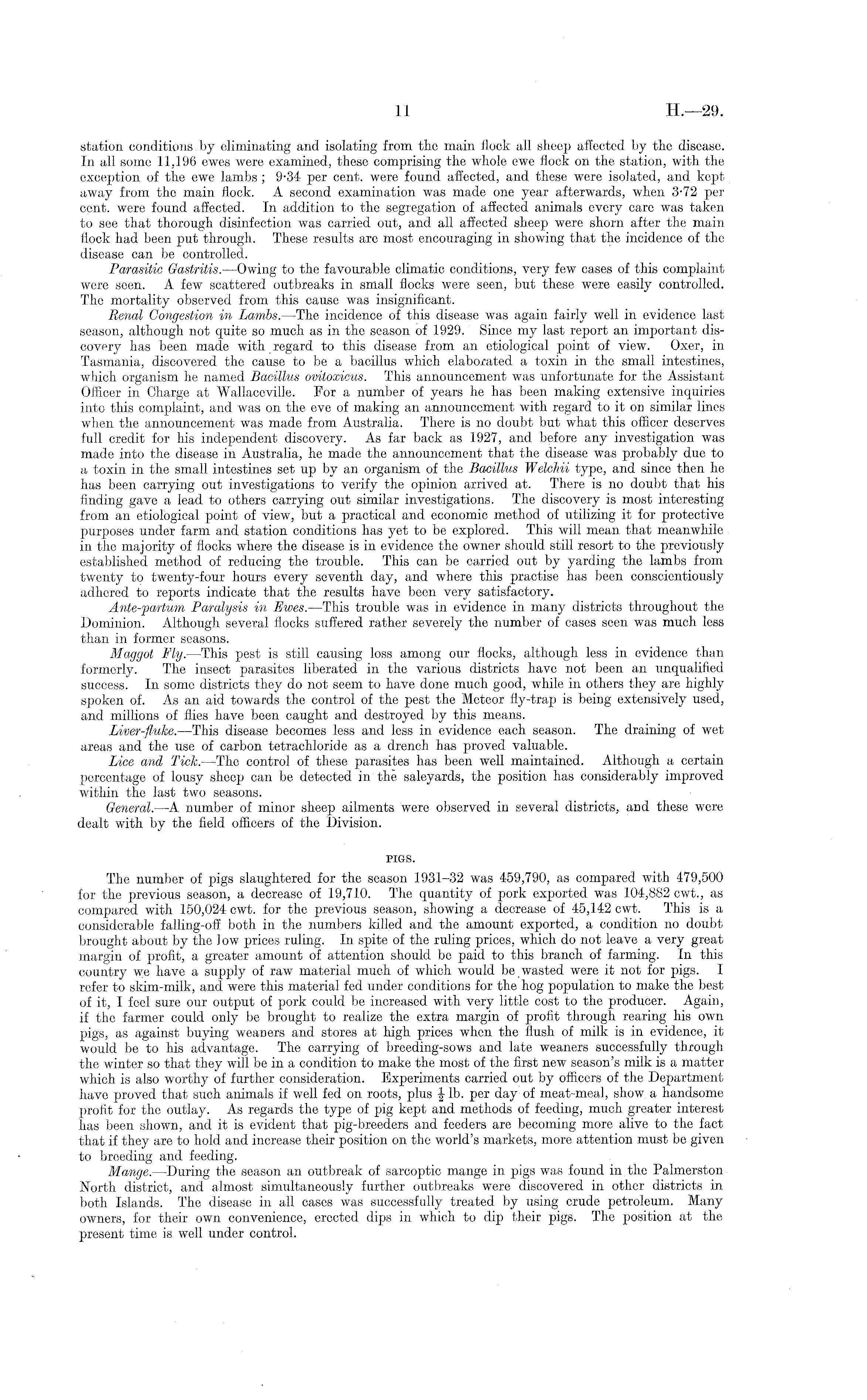 station conditionsjby eliminating and isolating from the main flock all sheep affected by the disease. In all some 11,196 ewes were examined, these comprising the whole ewe flock on the station, with the exception of the ewe lambs ; 9-34 per cent, were found affected, and these were isolated, and kept away from the main flock. A second examination was made one year afterwards, when 3-72 per cent, were found affected. In addition to the segregation of affected animals every care was taken to see that thorough disinfection was carried out, and all affected sheep were shorn after the main flock had been put through. These results are most encouraging in showing that the incidence of the disease can be controlled. Parasitic Gastritis. —Owing to the favourable climatic conditions, very few cases of this complaint were seen. A few scattered outbreaks in small flocks were seen, but these were easily controlled. The mortality observed from this cause was insignificant. Renal Congestion in Lambs. —The incidence of this disease was again fairly well in evidence last season, although not quite so much as in the season of 1929. Since my last report an important discovery has been made with regard to this disease from an etiological point of view. Oxer, in Tasmania, discovered the cause to be a bacillus which elaborated a toxin in the small intestines, which organism he named Bacillus ovitoxious. This announcement was unfortunate for the Assistant Officer in Charge at Wallaceville. For a number of years he has been making extensive inquiries into this complaint, and was on the eve of making an announcement with regard to it on similar lines when the announcement was made from Australia. There is no doubt but what this officer deserves full credit for his independent discovery. As far back as 1927, and before any investigation was made into the disease in Australia, he made the announcement that the disease was probably due to a toxin in the small intestines set up by an organism of the Bacillus Welchii type, and since then he has been carrying out investigations to verify the opinion arrived at. There is no doubt that his finding gave a lead to others carrying out similar investigations. The discovery is most interesting from an etiological point of view, but a practical and economic method of utilizing it for protective purposes under farm and station conditions has yet to be explored. This will mean that meanwhile in the majority of flocks where the disease is in evidence the owner should still resort to the previously established method of reducing the trouble. This can be carried out by yarding the lambs from twenty to twenty-four hours every seventh day, and where this practise has been conscientiously adhered to reports indicate that the results have been very satisfactory. Ante-partum Paralysis in Ewes.—This trouble was in evidence in many districts throughout the Dominion. Although several flocks suffered rather severely the number of cases seen was much less than in former seasons. Maggot Fly. —This pest is still causing loss among our flocks, although less in evidence than formerly. The insect parasites liberated in the various districts have not been an unqualified, success. In some districts they do not seem to have done much good, while in others they are highly spoken of. As an aid towards the control of the pest the Meteor fly-trap is being extensively used, and millions of flies have been caught and destroyed By this means. Liver-fluke. —This disease becomes less and less in evidence each season. The draining of wet areas and the use of carbon tetrachloride as a drench has proved valuable. Lice and Tick.—The control of these parasites has been well maintained. Although a certain percentage of lousy sheep can be detected in the saleyards, the position has considerably improved within the last two seasons. General. —A number of minor sheep ailments were observed in several districts, and these were dealt with by the field officers of the Division. PIGS. The number of pigs slaughtered for the season 1931-32 was 459,790, as compared with 479,500 for the previous season, a decrease of 19,710. The quantity of pork exported was 104,882 cwt., as compared with 150,024 cwt. for the previous season, showing a decrease of 45,142 cwt. This is a considerable falling-off both in the numbers killed and the amount exported, a condition no doubt brought about by the low prices ruling. In spite of the ruling prices, which do not leave a very great margin of profit, a greater amount of attention should be paid to this branch of farming. In this country we have a supply of raw material much of which would be wasted were it not for pigs. I refer to skim-milk, and were this material fed under conditions for the hog population to make the best of it, I feel sure our output of pork could be increased with very little cost to the producer. Again, if the farmer could only be brought to realize the extra margin of profit through rearing his own pigs, as against buying weaners and stores at high prices when the flush of milk is in evidence, it would be to his advantage. The carrying of breeding-sows and late weaners successfully through the winter so that they will be in a condition to make the most of the first new season's milk is a matter which is also worthy of further consideration. Experiments carried out by officers of the Department have proved that such animals if well fed on roots, plus \ lb. per day of meat-meal, show a handsome profit for the outlay. As regards the type of pig kept and methods of feeding, much greater interest has been shown, and it is evident that pig-breeders and feeders are becoming more alive to the fact that if they are to hold and increase their position on the world's markets, more attention must be given to breeding and feeding. Mange.—During the season an outbreak of sarcoptic mange in pigs was found in the Palmerston North district, and almost simultaneously 