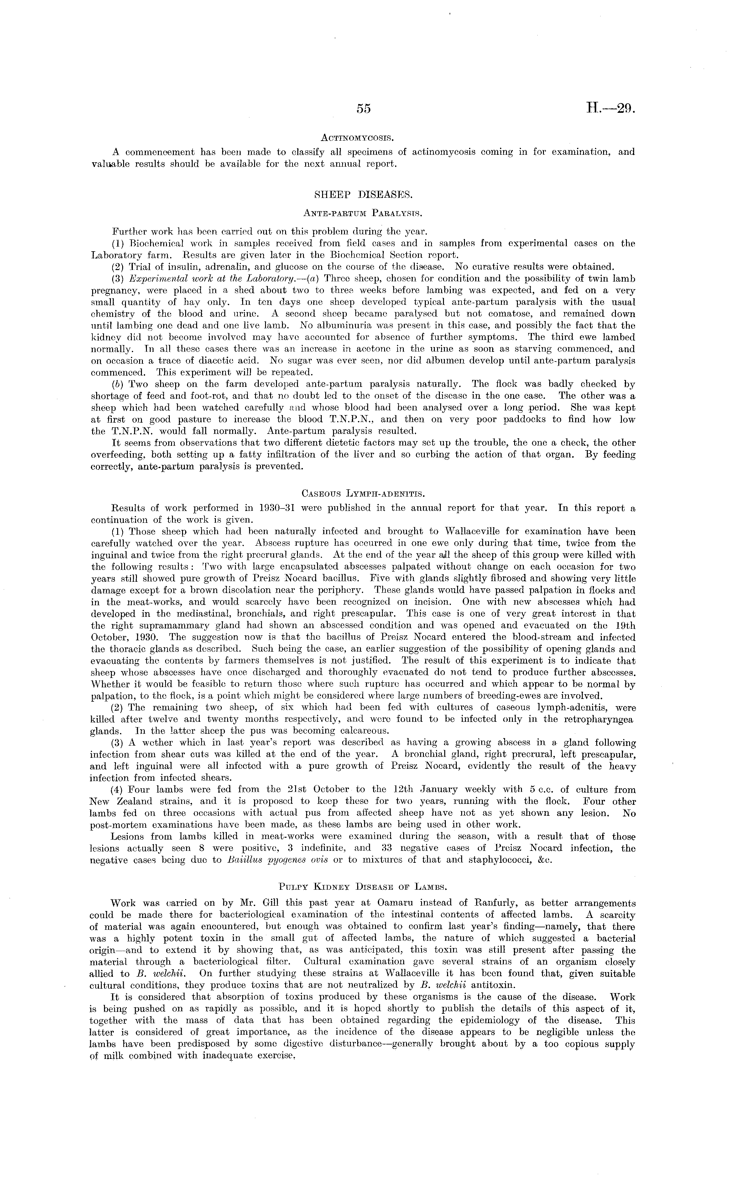 Actinomycosis. A commencement has been made to classify all specimens of actinomycosis coming in for examination, and valuable results should be available for the next annual report. SHEEP DISEASES. Ante-partum Paralysis. Further work ha,s been carried out on this problem during the year. (1) Biochemical work in samples received from field cases and in samples from experimental cases on the Laboratory farm. Results are given later in the Biochemical Section report. (2) Trial of insulin, adrenalin, and glucose on the course of the disease. No curative results were obtained. (3) Experimental worle at the Laboratory.—(a) Three sheep, chosen for condition and the possibility of twin lamb pregnancy, were placed in a shed about two to three weeks before lambing was expected, and fed on a very small quantity of hay only. In ten days one sheep developed typical ante-partum paralysis with the usual chemistry of the blood and urine. A second sheep became paralysed but not comatose, and remained down until lambing one dead and one live lamb. No albuminuria was present in this case, and possibly the fact that the kidney did not become involved may have accounted for absence of further symptoms. The third ewe lambed normally. In all these cases there was an increase in acetone in the urine as soon as starving commenced, and on occasion a trace of diacetic acid. No sugar was ever seen, nor did albumen develop until ante-partum paralysis commenced. This experiment will be repeated. (6) Two sheep on the farm developed ante-partum paralysis naturally. The flock was badly checked by shortage of feed and foot-rot, and that no doubt led to the onset of the disease in the one case. The other was a sheep which had been watched carefully and whose blood had been analysed over a long period. She was kept at first on good pasture to increase the blood T.N.P.N., and then on very poor paddocks to find how low the T.N.P.N. would fall normally. Ante-partum paralysis resulted. It seems from observations that two different dietetic factors may set up the trouble, the one a check, the other overfeeding, both setting up a fatty infiltration of the liver and so curbing the action of that organ. By feeding correctly, ante-partum paralysis is prevented. Caseous Lymph-adenitis. Results of work performed in 1930-31 were published in the annual report for that year. In this report a continuation of the work is given. (1) Those sheep which had been naturally infected and brought to Wallaceville for examination have been carefully watched over the year. Abscess rupture has occurred in one ewe only during that time, twice from the inguinal and twice from the right precrural glands. At the end of the year ajll the sheep of this group were killed with the following results : Two with large encapsulated abscesses palpated without change on each occasion for two years still showed pure growth of Preisz Nocard bacillus. Five with glands slightly fibrosed and showing very little damage except for a brown discolation near the periphery. These glands would have passed palpation in flocks and in the meat-works, and would scarcely have been recognized on incision. One with new abscesses which had developed in the mediastinal, bronchials, and right prescapular. This ease is one of very great interest in that the right supramammary gland had shown an abscessed condition and was opened and evacuated on the 19th October, 1930. The suggestion now is that the bacillus of Preisz Nocard entered the blood-stream and infected the thoracic glands as described. Such being the ease, an earlier suggestion of the possibility of opening glands and evacuating the contents by farmers themselves is not justified. The result of this experiment is to indicate that sheep whose abscesses have once discharged and thoroughly evacuated do not tend to produce further abscesses. Whether it would be feasible to return those where such rupture has occurred and which appear to be normal by palpation, to the floek, is a point which might be considered where large numbers of breeding-ewes are involved. (2) The remaining two sheep, of six which had been fed with cultures of caseous lymph-adenitis, were killed after twelve and twenty months respectively, and were found to be infected only in the retropharyngea glands. In the latter sheep the pus was becoming calcareous. (3) A wether which in last year's report was described as having a growing abscess in a gland following infection from shear cuts was killed at the end of the year. A bronchial gland, right precrural, left prescapular, and left inguinal were all infected with a pure growth of Preisz Nocard, evidently the result of the heavy infection from infected shears. (4) Four lambs were fed from the 21st October to the 12th January weekly with 5 c.c. of culture from New Zealand strains, and it is proposed to keep these for two years, running with the flock. Four other lambs fed on three occasions with actual pus from affected sheep have not as yet shown any lesion. No post-mortem examinations have been made, as these lambs are being used in other work. Lesions from lambs killed in meat-works were examined during the season, with a result that of those lesions actually seen 8 were positive, 3 indefinite, and 33 negative cases of Preisz Nocard infection, the negative cases being due to Baiillus pyogenes ovis or to mixtures of that and staphylococci, &c. Pulpy Kidney Disease oe Lambs. Work was carried on by Mr. Gill this past year at Oamaru instead of Ranfurly, as better arrangements could be made there for bacteriological examination of the intestinal contents of affected lambs. A scarcity of material was again encountered, but enough was obtained to confirm last year's finding—namely, that there was a highly potent toxin in the small gut of affected lambs, the nature of which suggested a bacterial origin—and to extend it by showing that, as was anticipated, this toxin was still present after passing the material t