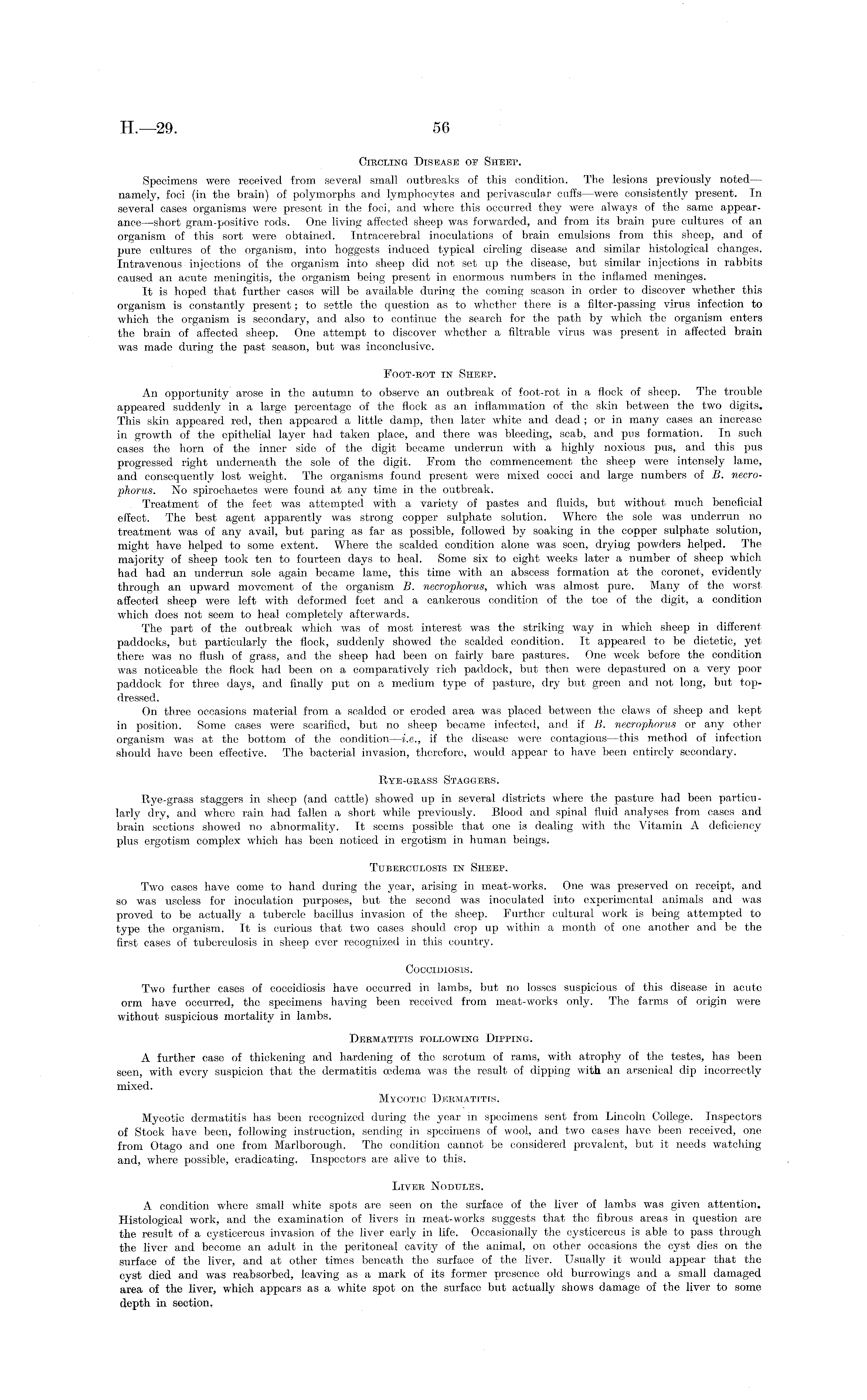 Circling Disease of Sheep. Specimens were received from several small outbreaks of this condition. The lesions previously noted— namely, foci (in the brain) of polymorphs and lymphocytes and perivascular cuffs —were consistently present. In several cases organisms were present in the foci, and where this occurred they were always of the same appearance —short gram-positive rods. One living affected sheep was forwarded, and from its brain pure cultures of an organism of this sort were obtained. Intracerebral inoculations of brain emulsions from this sheep, and of pure cultures of the organism, into hoggests induced typical circling disease and similar histological changes. Intravenous injections of the organism into sheep did not set up the disease, but similar injections in rabbits caused an acute meningitis, the organism being present in enormous numbers in the inflamed meninges. It is hoped that further cases will be available during the coming season in order to discover whether this organism is constantly present; to settle the question as to whether there is a filter-passing virus infection to which the organism is secondary, and also to continue the search for the path by which the organism enters the brain of affected sheep. One attempt to discover whether a filtrable virus was present in affected brain was made during the past season, but was inconclusive. Foot-rot in Sheep. An opportunity arose in the autumn to observe an outbreak of foot-rot in a flock of sheep. The trouble appeared suddenly in a large percentage of the flock as an inflammation of the skin between the two digits. This skin appeared red, then appeared a little damp, then later white and dead ; or in many cases an increase in growth of the epithelial layer had taken place, and there was bleeding, scab, and pus formation. In such cases the horn of the inner side of the digit became undetrun with a highly noxious pus, and this pus progressed right underneath the sole of the digit. From the commencement the sheep were intensely lame, and consequently lost weight. The organisms found present were mixed cocci and large numbers of B. necrophorus. No spirochaetes were found at any time in the outbreak. Treatment of the feet was attempted with a variety of pastes and fluids, but without much beneficial effect. The best agent apparently was strong copper sulphate solution. Where the sole was underrun no treatment was of any avail, but paring as far as possible, followed by soaking in the copper sulphate solution, might have helped to some extent. Where the scalded condition alone was seen, drying powders helped. The majority of sheep took ten to fourteen days to heal. Some six to eight weeks later a number of sheep which had had an underrun sole again became lame, this time with an abscess formation at the coronet, evidently through an upward movement of the organism B. necrophorus, which was almost pure. Many of the worst affected sheep were left with deformed feet and a cankerous condition of the toe of the digit, a condition which does not seem to heal completely afterwards. The part of the outbreak which was of most interest was the striking way in which sheep in different paddocks, but particularly the flock, suddenly showed the scalded condition. It appeared to be dietetic, yet there was no flush of grass, and the sheep had been on fairly bare pastures. One week before the condition was noticeable the flock had been on a comparatively rich paddock, but then were depastured on a very poor paddock for three days, and finally put on a medium type of pasture, dry but green and not long, but topdressed. On three occasions material from a scalded or eroded area was placed between the claws of sheep and kept in position. Some eases were scarified, but no sheep became infected, and if B. necrophorus or any other organism was at the bottom of the condition—i.e., if the disease were contagious —this method of infection should have been effective. The bacterial invasion, therefore, would appear to have been entirely secondary. Rye-grass Staggers. Rye-grass staggers in sheep (and cattle) showed up in several districts where the pasture had been particularly dry, and where rain had fallen a short while previously. Blood and spinal fluid analyses from cases and brain sections showed no abnormality. It seems possible that one is dealing with the Vitamin A deficiency plus ergotism complex which has been noticed in ergotism in human beings. Tuberculosis in Siieep. Two cases have come to hand during the year, arising in meat-works. One was preserved on receipt, and so was useless for inoculation purposes, but the second was inoculated into experimental animals and was proved to be actually a tubercle bacillus invasion of the sheep. Further cultural work is being attempted to type the organism. It is curious that two cases should crop up within a month of one another and be the first cases of tuberculosis in sheep ever recognized in this country. Coccidiosis. Two further cases of coccidiosis have occurred in lambs, but no losses suspicious of this disease in acute orm have occurred, the specimens having been received from meat-works only. The farms of origin were without suspicious mortality in lambs. Dermatitis following Dipping. A further case of thickening and hardening of the scrotum of rams, with atrophy of the testes, has been seen, with every suspicion that the dermatitis oedema was the result of dipping with an arsenical dip incorrectly mixed. Mycotic Dermatitis. Mycotic dermatitis has been recognized during the year in specimens sent from Lincoln College. Inspectors of Stock have been, following instruction, sending in specimens of wool, and two cases have been received, one from Otago and one from Marlborough. The condition cannot be considered prevalent, but it needs watching and, where possible, eradicating. Inspectors are alive to this. Liver Nodules. A condition where small white spots are seen on the surface o