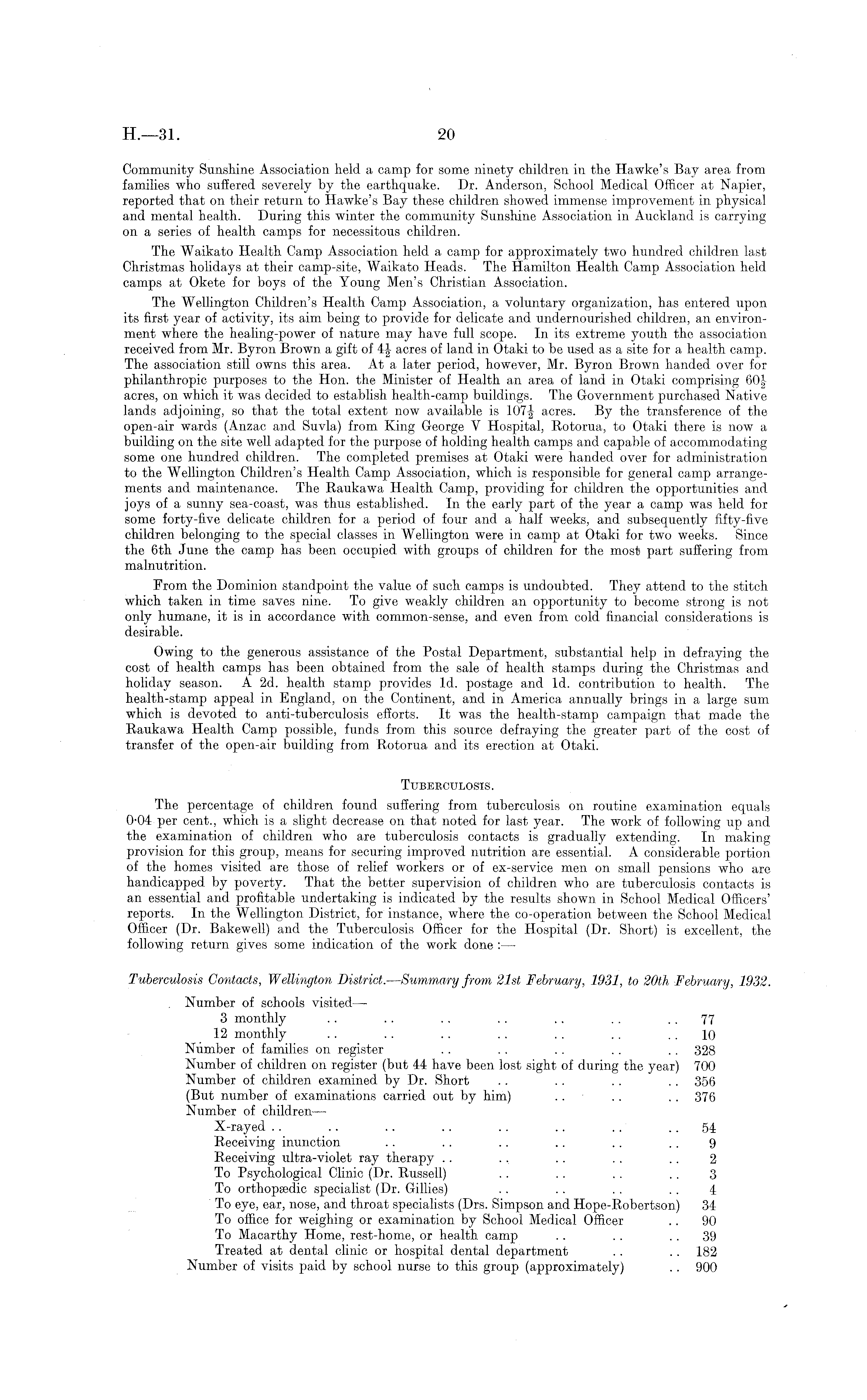 Community Sunshine Association held a camp for some ninety children in the Hawke's Bay area from families who suffered severely by the earthquake. Dr. Anderson, School Medical Officer at Napier, reported that on their return to Hawke's Bay these children showed immense improvement in physical and mental health. During this winter the community Sunshine Association in Auckland is carrying on a series of health camps for necessitous children. The Waikato Health Camp Association held a camp for approximately two hundred children last Christmas holidays at their camp-site, Waikato Heads. The Hamilton Health Camp Association held camps at Okete for boys of the Young Men's Christian Association. The Wellington Children's Health Camp Association, a voluntary organization, has entered upon its first year of activity, its aim being to provide for delicate and undernourished children, an environment where the healing-power of nature may have full scope. In its extreme youth the association received from Mr. Byron Brown a gift of 4| acres of land in Otaki to be used as a site for a health camp. The association still owns this area. At a later period, however, Mr. Byron Brown handed over for philanthropic purposes to the Hon. the Minister of Health an area of land in Otaki comprising 60| acres, on which it was decided to establish health-camp buildings. The Government purchased Native lands adjoining, so that the total extent now available is 107| acres. By the transference of the open-air wards (Anzac and Suvla) from King George Y Hospital, Rotorua, to Otaki there is now a building on the site well adapted for the purpose of holding health camps and capable of accommodating some one hundred children. The completed premises at Otaki were handed over for administration to the Wellington Children's Health Camp Association, which is responsible for general camp arrangements and maintenance. The Raukawa Health Camp, providing for children the opportunities and joys of a sunny sea-coast, was thus established. In the early part of the year a camp was held for some forty-five delicate children for a period of four and a half weeks, and subsequently fifty-five children belonging to the special classes in Wellington were in camp at Otaki for two weeks. Since the 6th June the camp has been occupied with groups of children for the most part suffering from malnutrition. From the Dominion standpoint the value of such camps is undoubted. They attend to the stitch which taken in time saves nine. To give weakly children an opportunity to become strong is not only humane, it is in accordance with common-sense, and even from cold financial considerations is desirable. Owing to the generous assistance of the Postal Department, substantial help in defraying the cost of health camps has been obtained from the sale of health stamps during the Christmas and holiday season. A 2d. health stamp provides Id. postage and Id. contribution to health. The health-stamp appeal in England, on the Continent, and in America annually brings in a large sum which is devoted to anti-tuberculosis efforts. It was the health-stamp campaign that made the Raukawa Health Camp possible, funds from this source defraying the greater part of the cost of transfer of the open-air building from Rotorua and its erection at Otaki. Tuberculosis. The percentage of children found suffering from tuberculosis on routine examination equals 0-04: per cent., which is a slight decrease 011 that noted for last year. The work of following up and the examination of children who are tuberculosis contacts is gradually extending. In making provision for this group, means for securing improved nutrition are essential. A considerable portion of the homes visited are those of relief workers or of ex-service men on small pensions who are handicapped by poverty. That the better supervision of children who are tuberculosis contacts is an essential and profitable undertaking is indicated by the results shown in School Medical Officers' reports. In the Wellington District, for instance, where the co-operation between the School Medical Officer (Dr. Bakewell) and the Tuberculosis Officer for the Hospital (Dr. Short) is excellent, the following return gives some indication of the work done :— Tuberculosis Contacts, Wellington District.—Summary from 21st February, 1931, to 20th February, 1932. Number of schools visited— 3 monthly .. .. .. . . .. . . 77 12 monthly .. .. .. . . . . .. . . 10 Number of families on register . . . . .. . . . . 328 Number of children on register (but 44 have been lost sight of during the year) 700 Number of children examined by Dr. Short .. .. .. .. 356 (But number of examinations carried out by him) .. . . . . 376 Number of children— X-rayed .. .. .. .. .. .. . . .. 54 Receiving inunction .. . . .. .. .. . . 9 Receiving ultra-violet ray therapy .. . . .. . . .. 2 To Psychological Clinic (Dr. Russell) . . .. .. . . 3 To orthopaedic specialist (Dr. Gillies) .. . . .. .. 4 To eye, ear, nose, and throat specialists (Drs. Simpson and Hope-Robertson) 34 To office for weighing or examination by School Medical Officer .. 90 To Macarthy Home, rest-home, or health camp .. .. 39 Treated at dental clinic or hospital dental department . . . . 182 Number of visits paid by school nurse to this group (approximately) .. 900