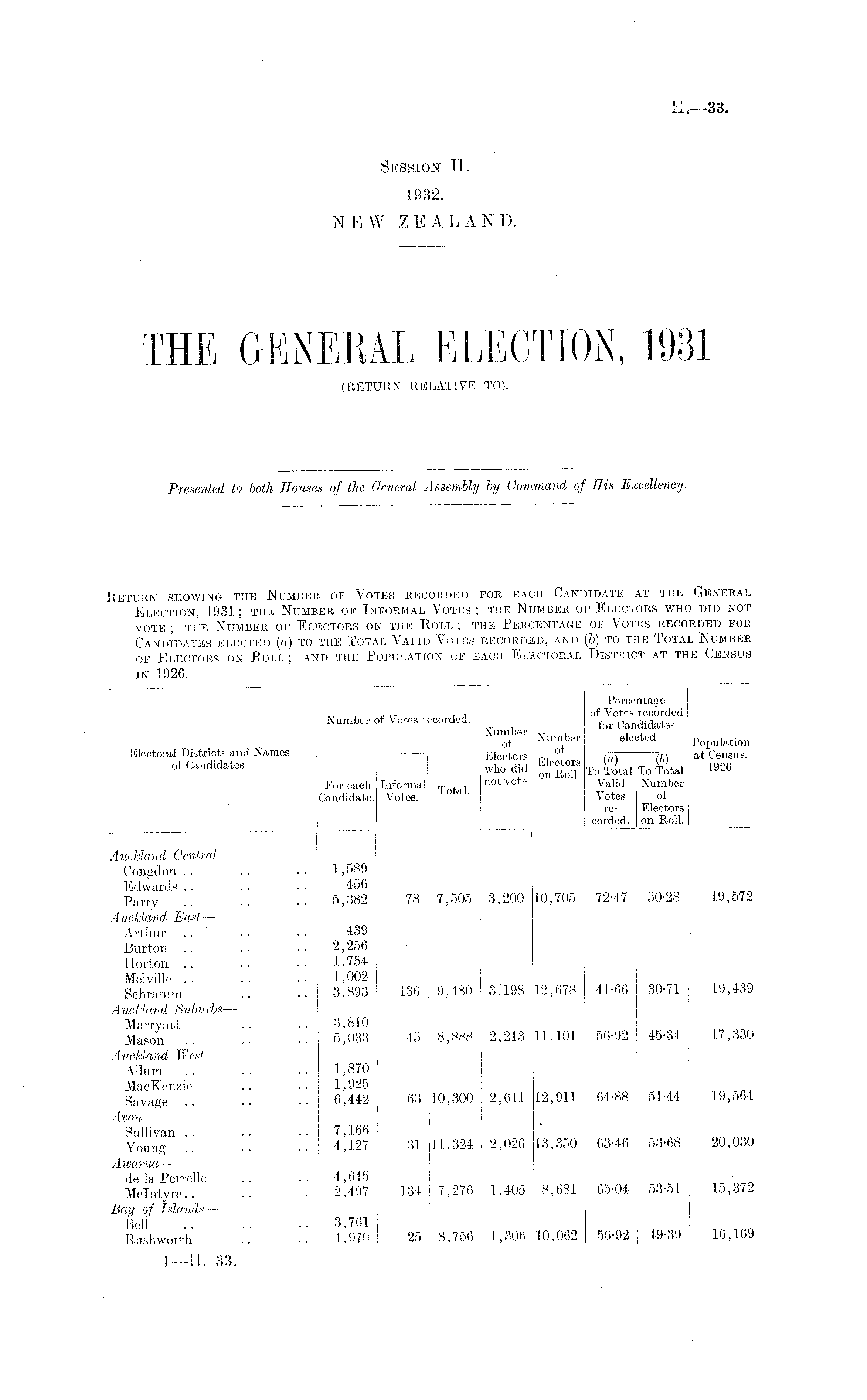 Return showing the Number of Votes recorded for each Candidate at the General Election, 1931; the Number of Informal Votes; the Number of Electors who did not vote; the Number of Electors on the Roll; the Percentage of Votes recorded for Candidates elected (a) to the Total Valid Votes recorded, and (b) to the Total Number of Electors on Roll; and the Population of each Electoral District at the Census in 1926.