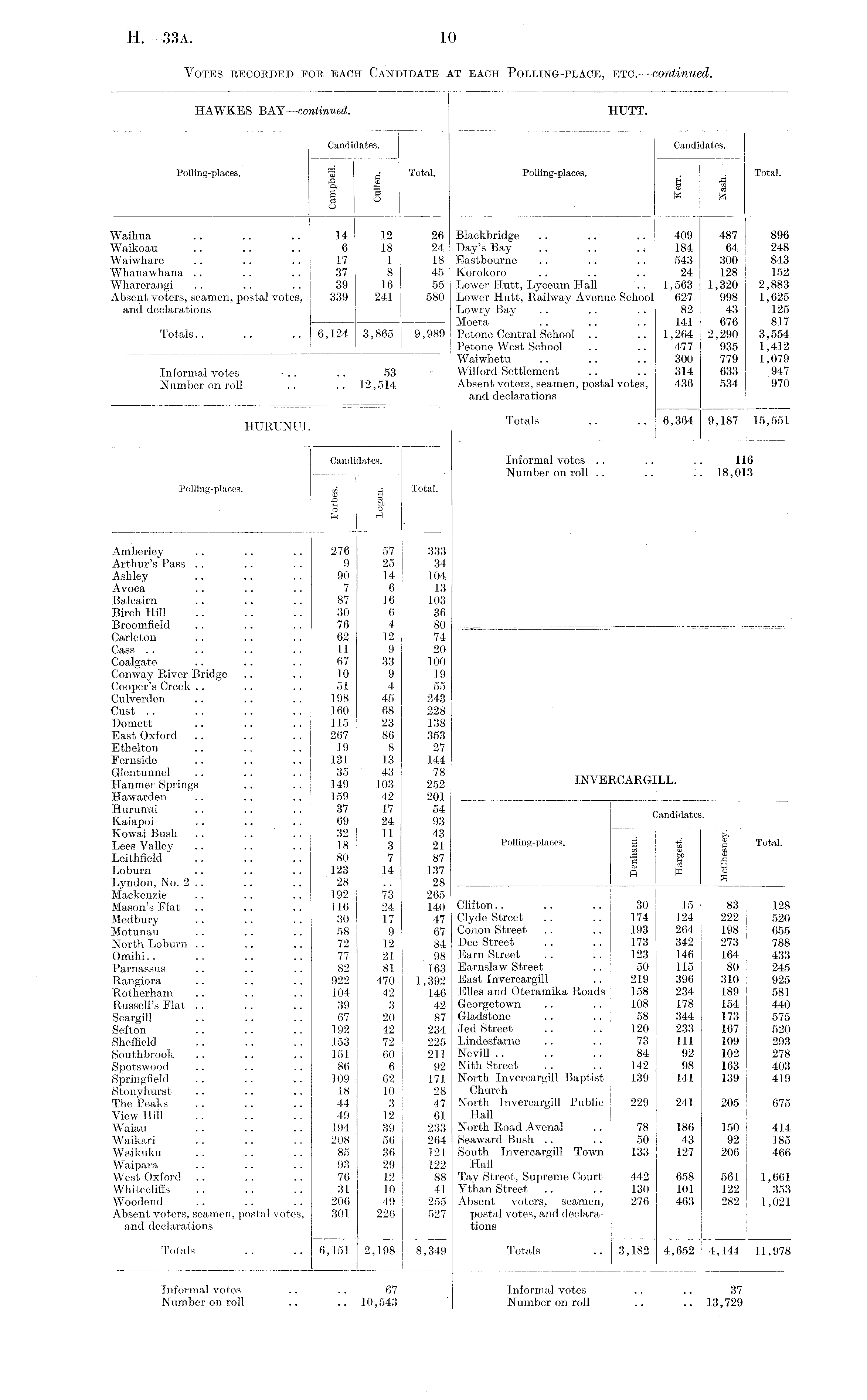 HUTT. Candidates. Polling-places. . . Total. Blackbridge .. .. .. 409 487 896 Day's Bay .. .. ., 184 64 248 Eastbourne .. .. .. 543 300 843 Korokoro .. .. .. 24 128 152 Lower Hutt, Lyceum Hall .. 1,563 1,320 2,883 Lower Hutt, Railway Avenue School 627 998 1,625 Lowry Bay .... .. 82 43 125 Moera .. .. .. 141 676 817 Petone Central School .. .. 1,264 2,290 3,554 Petone West School .. .. 477 935 1,412 Waiwhetu .. .. .. 300 779 1,079 Wilford Settlement .. .. 314 633 947 Absent voters, seamen, postal votes, 436 534 970 and declarations Totals .. .. 6,364 9,187 15,551 Informal votes .. .. .. 116 Number on roll .. .. .. 18,013 INVERCARGILL. Candidates. Polling-places. g -e' § Total. I I 1 « « I I I Clifton.. .. .. 30 15 83 128 Clyde Street .. .. 174 124 222 I 520 Conon Street .. .. 193 264 198 655 Dee Street .. .. 173 342 I 273 | 788 Earn Street .. .. 123 146 | 164 433 Earnslaw Street .. 50 115 80 245 East Invercargill .. 219 396 310 | 925 Elles and Oteramika Roads 158 234 189 I 581 Georgetown .. .. 108 178 154 440 Gladstone .. .. 58 344 173 575 Jed Street .. .. 120 233 167 520 Lindesfarne .. .. 73 111 109 293 Nevill .. .. .. 84 92 102 278 Nith Street .. .. 142 98 163 403 North Invercargill Baptist 139 141 139 419 Church North Invercargill Public 229 241 205 675 Hall North Road Avenal .. 78 186 150 | 414 Seaward Bush .. .. 50 43 92 185 South Invercargill Town 133 127 206 466 Hall Tay Street, Supreme Court 442 658 561 1,661 Ythan Street .. .. 130 101 122 353 Absent voters, seamen, 276 463 282 1,021 postal votes, and declarations Totals .. 3,182 4,652 4,144 11,978 Informal votes .. .. 37 Number on roll .. .. 13,729