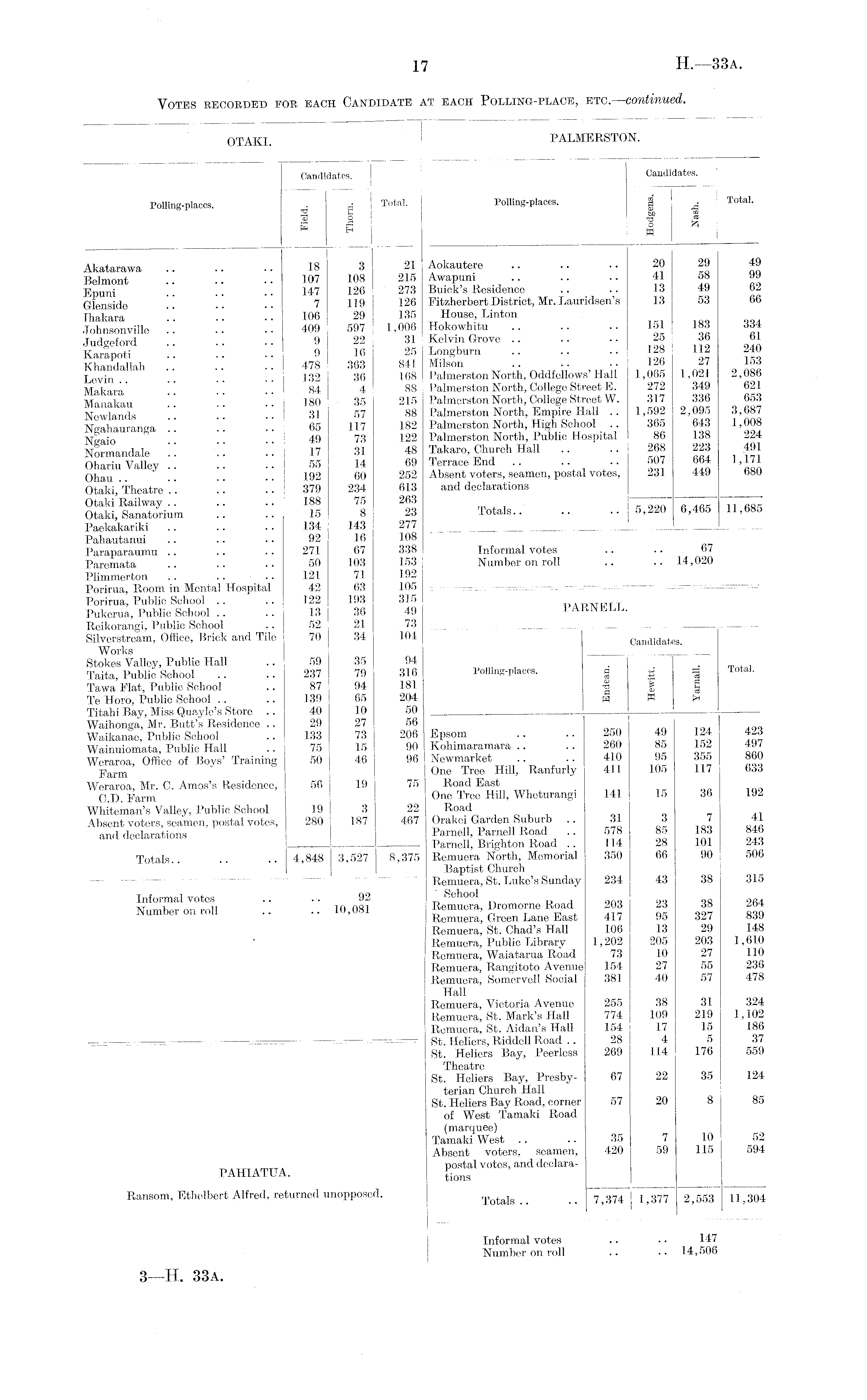 PALMERSTON. Candidates. Polling-places. S Total. ! 1 w I Aokautere 20 29 49 Awapuni 41 58 99 Buiok's Residence .. .. 13 49 62 Fitzherbert District, Mr. Lauridsen's 13 53 66 House, Linton Hokowhitu 151 183 334 Kelvin Grove .. .. •■ 25 36 61 Longburn 128 112 240 Milson 126 27 153 PalmerstonNorth, Oddfellows'Hall 1,065 1,021 2,086 Palmerston North, College Street E. 272 349 621 Palmerston North, College Street W. 317 336 653 Palmerston North, Empire Hall .. 1,592 2,095 3,687 Palmerston North, High School .. 365 643 1,008 Palmerston North, Public Hospital 86 138 224 Takaro, Church Hall .. .. 268 223 491 Terrace End .. .. .. 507 664 1,171 Absent voters, seamen, postal votes, 231 449 680 and declarations Totals.. .. .. j 5,220 6,465 11,685 Informal votes .. .. 67 Number on roll .. .. 14,020 PARNELL. Candidates. Polling-places. a g g Total. 1 I I H W (X Epsom .. .. 250 49 124 423 Kohimaramara .. .. 260 85 152 497 Newmarket .. .. 410 95 355 860 One Tree Hill, Ranfurly 411 105 117 633 Road East One Tree Hill, Wheturangi 141 15 36 192 Road Orakei Garden Suburb 31 3 7 41 Parnell, Parnell Road .. 578 85 183 846 Parnell, Brighton Road .. 114 28 101 243 Remuera North, Memorial 350 66 90 506 Baptist Church Remuera, St. Luke's Sunday 234 43 38 315 ■ School Remuera, Dromorne Road 203 23 38 264 Remuera, Green Lane East 417 95 327 839 Remuera, St. Chad's Hall 106 13 29 148 Remuera, Public Library 1,202 205 203 1,610 Remuera, Waiatarua Road 73 10 27 110 Remuera, Rangitoto Avenue 154 27 55 236 Remuera, Somervell Social 381 40 57 478 Hall Remuera, Victoria Avenue 255 38 31 324 Remuera, St. Mark's Hall 774 | 109 219 1,102 Remuera, St. Aidan's Hall 154 17 15 186 St. Heliers, Riddoll Road .. 28 4 5 37 St. Heliers Bay, Peerless 269 114 176 559 Theatre St. Heliers Bay, Presby- 67 22 35 124 terian Church Hall St. Heliers Bay Road, corner 57 20 8 85 of West Tamaki Road (marquee) Tamaki West .. .. 35 I 7 10 52 Absent voters, seamen, 420 59 115 594 postal votes, and declarations Totals.. .. 7,374 j 1,377 2,553 11,304 Informal votes .. • • 147 Number on roll .. ■• 14,506