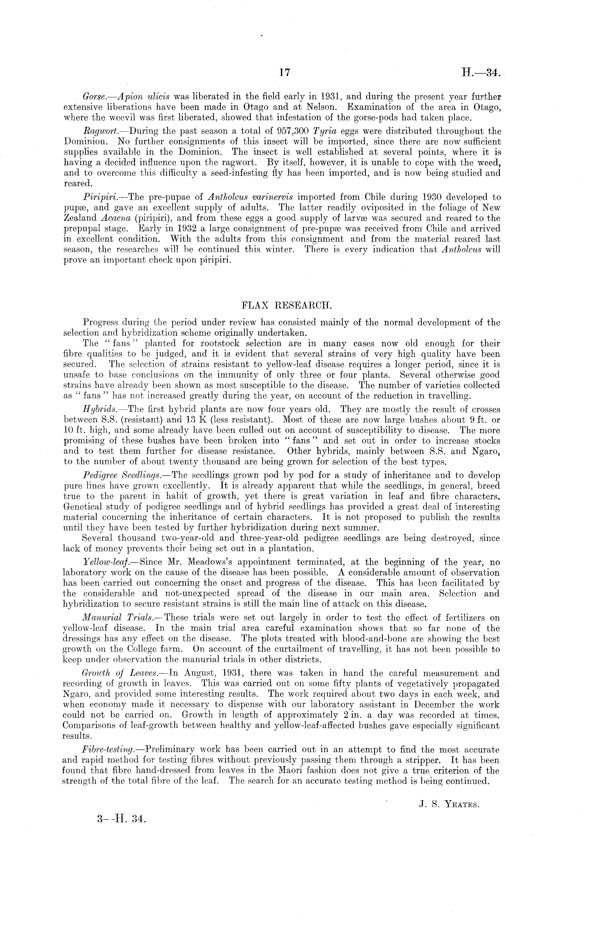 Gorse. —Apion ulicis was liberated in the field early in 1931, and during the present year further extensive liberations have been made in Otago and at Nelson. Examination of the area in Otago, where the weevil was first liberated, showed that infestation of the gorse-pods had taken place. Ragwort. —During the past season a total of 957,300 Tyria eggs were distributed throughout the Dominion. No further consignments of this insect will be imported, since there are now sufficient supplies available in the Dominion. The insect is well established at several points, where it is having a decided influence upon the ragwort. By itself, however, it is unable to cope with the weed, and to overcome this difficulty a seed-infesting fly has been imported, and is now being studied and reared. Piripiri.—The pre-pupae of Antholcus varinervis imported from Chile during 1930 developed to pupse, and gave an excellent supply of adults. The latter readily oviposited in the foliage of New Zealand Acaena (piripiri), and from these eggs a good supply of larvae was secured and reared to the prepupal stage. Early in 1932 a large consignment of pre-pup® was received from Chile and arrived in excellent condition. With the adults from this consignment and from the material reared last season, the researches will be continued this winter. There is every indication that Antholcus will prove an important check upon piripiri. FLAX RESEARCH. Progress during the period under review has consisted mainly of the normal development of the selection and hybridization scheme originally undertaken. The " fans" planted for rootstock selection are in many cases now old enough for their fibre qualities to be judged, and it is evident that several strains of very high quality have been secured. The selection of strains resistant to yellow-leaf disease requires a longer period, since it is unsafe to base conclusions on the immunity of only three or four plants. Several otherwise good strains have already been shown as most susceptible to the disease. The number of varieties collected as " fans " has not increased greatly during the year, on account of the reduction in travelling. Hybrids.—The first hybrid plants are now four years old. They are mostly the result of crosses between S.S. (resistant) and 13 K (less resistant). Most of these are now large bushes about 9 ft. or 10 ft. high, and some already have been culled out on account of susceptibility to disease. The more promising of these bushes have been broken into " fans " and set out in order to increase stocks and to test them further for disease resistance. Other hybrids, mainly between S.S. and Ngaro, to the number of about twenty thousand are being grown for selection of the best types. Pedigree Seedlings. —The seedlings grown pod by pod for a study of inheritance and to develop pure lines have grown excellently. It is already apparent that while the seedlings, in general, breed true to the parent in habit of growth, yet there is great variation in leaf and fibre characters. Genetical study of pedigree seedlings and of hybrid seedlings has provided a great deal of interesting material concerning the inheritance of certain characters. It is not proposed to publish the results until they have been tested by further hybridization during next summer. Several thousand two-year-old and three-year-old pedigree seedlings are being destroyed, since lack of money prevents their being set out in a plantation. Yellow-leaf. —Since Mr. Meadows's appointment terminated, at the beginning of the year, no laboratory work on the cause of the disease has been possible. A considerable amount of observation has been carried out concerning the onset and progress of the disease. This has been facilitated by the considerable and not-unexpected spread of the disease in our main area. Selection and hybridization to secure resistant strains is still the main line of attack on this disease. Manurial Trials. — These trials were set out largely in order to test the effect of fertilizers on yellow-leaf disease. In the main trial area careful examination shows that so far none of the dressings has any effect on the disease. The plots treated with blood-and-bone are showing the best growth on the College farm. On account of the curtailment of travelling, it has not been possible to keep under observation the manurial trials in other districts. Growth of Leaves. —In August, 1931, there was taken in hand the careful measurement and recording of growth in leaves. This was carried out on some fifty plants of vegetatively propagated Ngaro, and provided some interesting results. The work required about two days in each, week, and when economy made it necessary to dispense with our laboratory assistant in December the work could not be carried on. Growth in length of approximately 2 in. a day was recorded at times. Comparisons of leaf-growth between healthy and yellow-leaf-affected bushes gave especially significant results. Fibre-testing.—Preliminary work has been carried out in an attempt to find the most accurate and rapid method for testing fibres without previously passing them through a stripper. It has been found that fibre hand-dressed from leaves in the Maori fashion does not give a true criterion of the strength of the total fibre of the leaf. The search for an accurate testing method is being continued. J. S. Yeates.