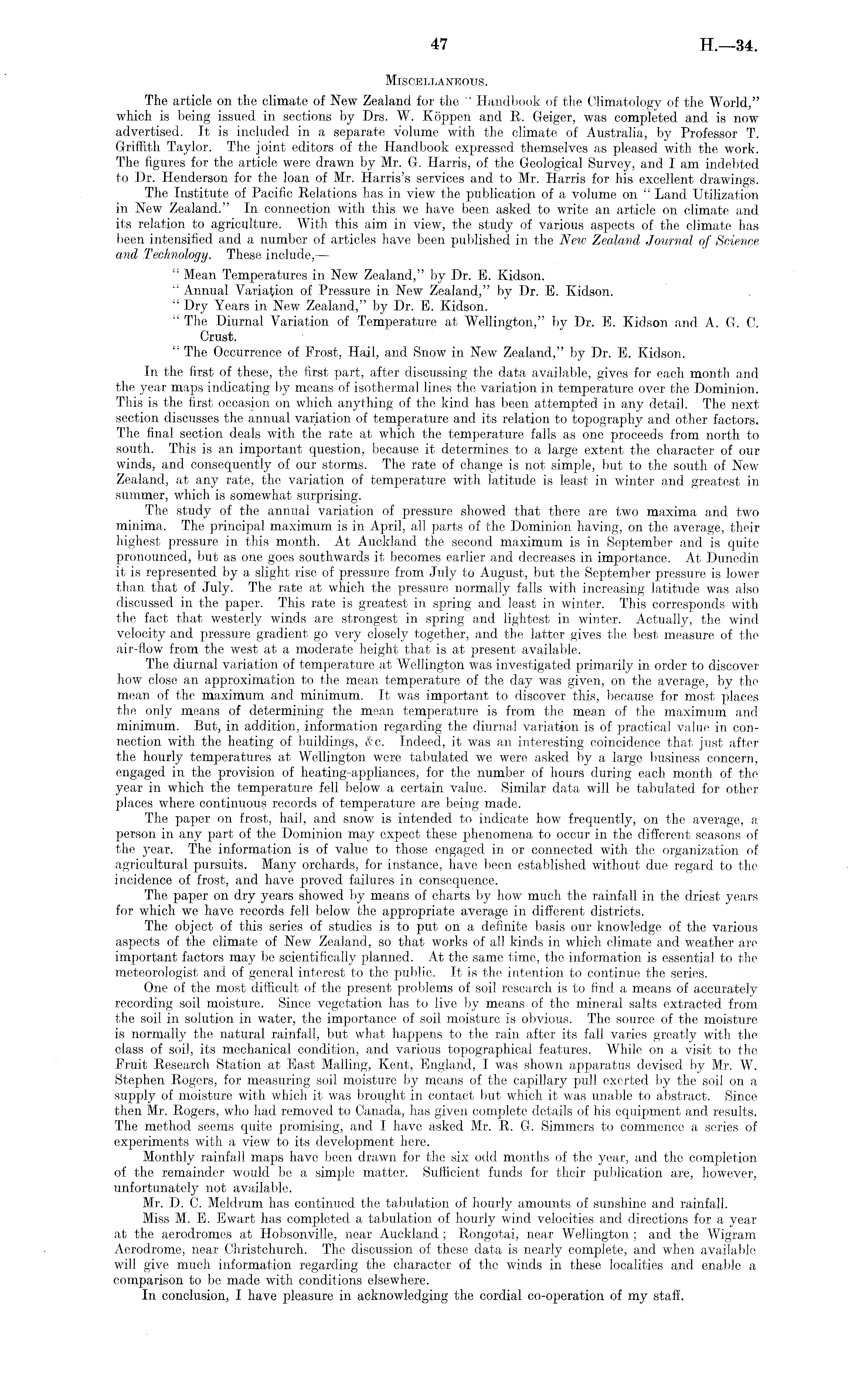 Miscellaneous. The article on the climate of New Zealand for the " Handbook of the Climatology of the World," which is being issued in sections by Drs. W. Kôppen and R. Geiger, was completed and is now advertised. It is included in a separate volume with the climate of Australia, by Professor T. Griffith Taylor. The joint editors of the Handbook expressed themselves as pleased with the work. The figures for the article were drawn by Mr. G. Harris, of the Geological Survey, and I am indebted to Dr. Henderson for the loan of Mr. Harris's services and to Mr. Harris for his excellent drawings. The Institute of Pacific Relations has in view the publication of a volume on " Land Utilization in New Zealand." In connection with this we have been asked to write an article on climate and its relation to agriculture. With this aim in view, the study of various aspects of the climate has been intensified and a number of articles have been published in the New Zealand Journal of Science and Technology. These include, — " Mean Temperatures in New Zealand," by Dr. E. Kidson. " Annual Variation of Pressure in New Zealand," by Dr. E. Kidson. " Dry Years in New Zealand," by Dr. E. Kidson. " The Diurnal Variation of Temperature at Wellington," by Dr. E. Kidson and A. G. C. Crust. " The Occurrence of Frost, Hail, and Snow in New Zealand," by Dr. E. Kidson. In the first of these, the first part, after discussing the data available, gives for each month and the year maps indicating by means of isothermal lines the variation in temperature over the Dominion. This is the first occasion on which anything of the kind has been attempted in any detail. The next section discusses the annual variation of temperature and its relation to topography and other factors. The final section deals with the rate at which the temperature falls as one proceeds from north to south. This is an important question, because it determines to a large extent the character of our winds, and consequently of our storms. The rate of change is not simple, but to the south of New Zealand, at any rate, the variation of temperature with latitude is least in winter and greatest in summer, which is somewhat surprising. The study of the annual variation of pressure showed that there are two maxima and two minima. The principal maximum is in April, all parts of the Dominion having, on the average, their highest pressure in this month. At Auckland the second maximum is in September and is quite pronounced, but as one goes southwards it becomes earlier and decreases in importance. At Dunedin it is represented by a slight rise of pressure from July to August, but the September pressure is lower than that of July. The rate at which the pressure normally falls with increasing latitude was also discussed in the paper. This rate is greatest in spring and least in winter. This corresponds with the fact that westerly winds are strongest in spring and lightest in winter. Actually, the wind velocity and pressure gradient go very closely together, and the latter gives the best measure of the air-flow from the west at a moderate height that is at present available. The diurnal variation of temperature at Wellington was investigated primarily in order to discover how close an approximation to the mean temperature of the day was given, on the average, by the mean of the maximum and minimum. It was important to discover this, because for most places the only means of determining the mean temperature is from the mean of the maximum and minimum. But, in addition, information regarding the diurnal variation is of practical value in connection with the heating of buildings, &c. Indeed, it was an interesting coincidence that just after the hourly temperatures at Wellington were tabulated we were asked by a large business concern, engaged in the provision of heating-appliances, for the number of hours during each month of the year in which the temperature fell below a certain value. Similar data will be tabulated for other places where continuous records of temperature are being made. The paper on frost, hail, and snow is intended to indicate how frequently, on the average, a person in any part of the Dominion may expect these phenomena to occur in the different seasons of the year. The information is of value to those engaged in or connected with the organization of agricultural pursuits. Many orchards, for instance, have been established without due regard to the incidence of frost, and have proved failures in consequence. The paper on dry years showed by means of charts by how much the rainfall in the driest years for which we have records fell below the appropriate average in different districts. The object of this series of studies is to put on a definite basis our knowledge of the various aspects of the climate of New Zealand, so that works of all kinds in which climate and weather are important factors may be scientifically planned. At the same time, the information is essential to the meteorologist and of general interest to the public. It is the intention to continue the series. One of the most difficult of the present problems of soil research is to find a means of accurately recording soil moisture. Since vegetation has to live by means of the mineral salts extracted from the soil in solution in water, the importance of soil moisture is obvious. The source of the moisture is normally the natural rainfall, but what happens to the rain after its fall varies greatly with the class of soil, its mechanical condition, and various topographical features. While on a visit to the Fruit Research Station at East Mailing, Kent, England, I was shown apparatus devised by Mr. W. Stephen Rogers, for measuring soil moisture by means of the capillary pull exerted by the soil on a supply of moisture with which it was brought in contact but which it was unable to abstract. Since then Mr. Rogers, who had removed to Canada, has given complete details of his equipment and result