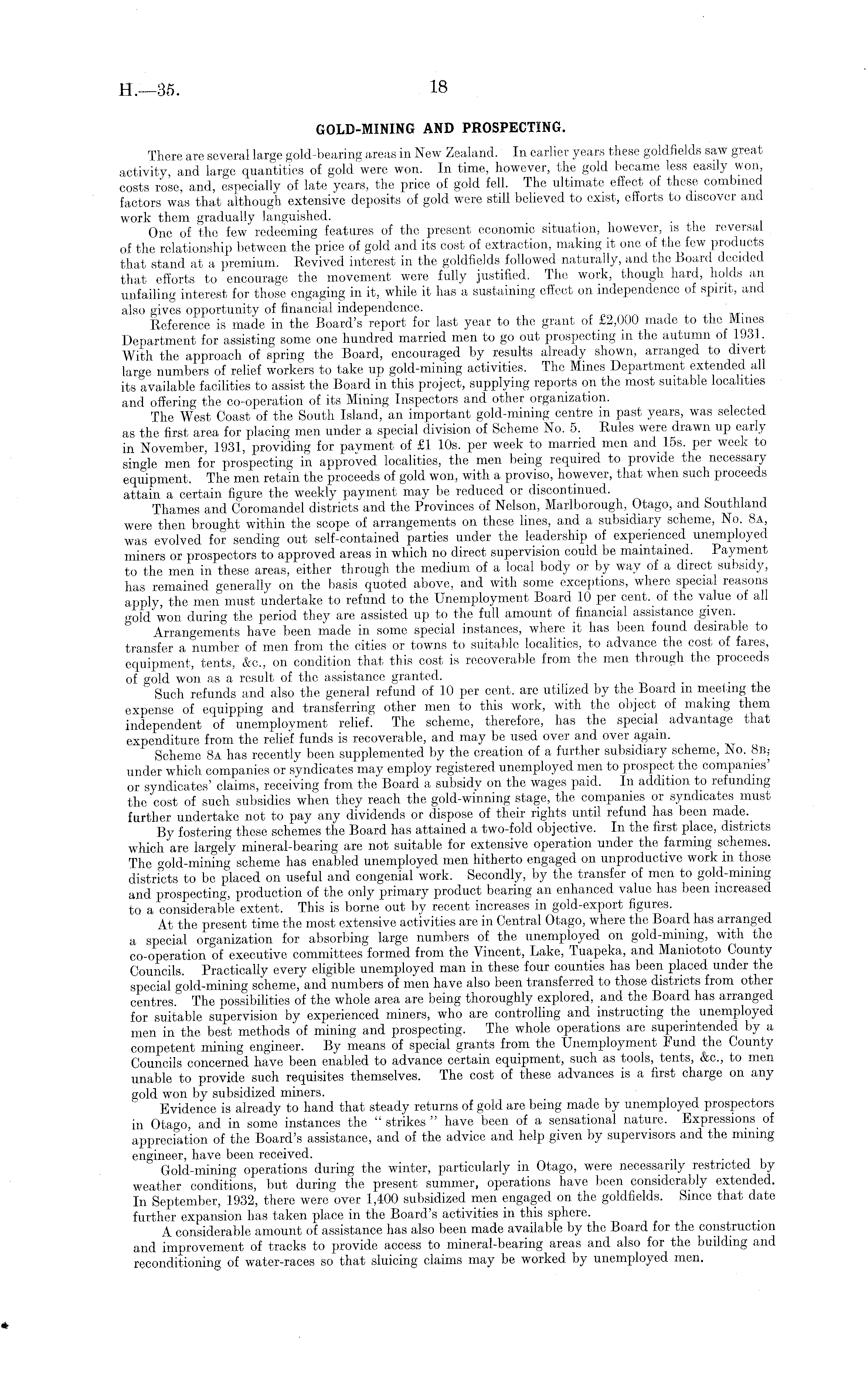 GOLD-MINING AND PROSPECTING. There are several large gold-bearing areas in New Zealand. In earlier years these goldfields saw great activity, and large quantities of gold were won. In time, however, the gold became less easily won, costs rose, and, especially of late years, the price of gold fell. The ultimate effect of these combined factors was that although extensive deposits of gold were still believed to exist, efforts to discover and work them gradually languished. . One of the few redeeming features of the present economic situation, however, is the reversal of the relationship between the price of gold and its cost of extraction, making it one of the few products that stand at a premium. Revived interest in the goldfields followed naturally, and the Board decided that efforts to encourage the movement were fully justified. The work, though hard, holds an unfailing interest for those engaging in it, while it has a sustaining effect on independence of spirit, and also gives opportunity of financial independence. Reference is made in the Board's report for last year to the grant of £2,000 made to the Mines Department for assisting some one hundred married men to go out prospecting m the autumn of 1931. With the approach of spring the Board, encouraged by results already shown, arranged to divert large numbers of relief workers to take up gold-mining activities. The Mines Department extended all its available facilities to assist the Board in this project, supplying reports on the most suitable localities and offering the co-operation of its Mining Inspectors and other organization. The West Coast of the South Island, an important gold-mining centre m past years, was selected as the first area for placing men under a special division of Scheme No. 5. Rules were drawn up early in November, 1931, providing for payment of £1 10s. per week, to married men and 15s. per week to single men for prospecting in approved localities, the men being required to provide the necessary equipment. The men retain the proceeds of gold won, with a proviso, however, that when such proceeds attain a certain figure the weekly payment may be reduced or discontinued. Thames and Coromandel districts and the Provinces of Nelson, Marlborough, Otago, and Southland were then brought within the scope of arrangements on these lines, and a subsidiary scheme, No. Ba, was evolved for sending out self-contained parties under the leadership of experienced unemployed miners or prospectors to approved areas in which no direct supervision could be maintained. Payment to the men in these areas, either through the medium of a local body or by way of a direct subsidy, has remained generally on the basis quoted above, and with some exceptions, where special reasons apply, the men must undertake to refund to the Unemployment Board 10 per cent, of the value of all gold won during the period they are assisted up to the full amount of financial assistance given. Arrangements have been made in some special instances, where it has been found desirable to transfer a number of men from the cities or towns to suitable localities, to advance the cost of fares, equipment, tents, &c| on condition that this cost is recoverable from the men through the proceeds of gold won as a result of the assistance granted. Such refunds and also the general refund of 10 per cent, are utilized by the Board m meeting the expense of equipping and transferring other men to this work, with the object of making them independent of unemployment relief. The scheme, therefore, has the special advantage that expenditure from the relief funds is recoverable, and may be used over and over again. Scheme 8a has recently been supplemented by the creation of a further subsidiary scheme, No. Bb,under which companies or syndicates may employ registered unemployed men to prospect the companies or syndicates' claims, receiving from the Board a subsidy on the wages paid. In addition to refunding the cost of such subsidies when they reach the gold-winning stage, the companies or syndicates must further undertake not to pay any dividends or dispose of their rights until refund has been made. By fostering these schemes the Board has attained a two-fold objective. In the first place, districts which are largely mineral-bearing are not suitable for extensive operation under the farming schemes. The cold-mining scheme has enabled unemployed men hitherto engaged on unproductive work 111 those districts to be placed on useful and congenial work. Secondly, by the transfer of men to gold-mining and prospecting, production of the only primary product bearing an enhanced value has been increased to a considerable extent. This is borne out by recent increases in gold-export figures. At the present time the most extensive activities are in Central Otago, where the Board has arranged a special organization for absorbing large numbers of the unemployed on gold-mining, with the co-operation of executive committees formed from the Vincent, Lake, Tuapeka, and Maniototo County Councils. Practically every eligible unemployed man in these four counties has been placed under the special gold-mining scheme, and numbers of men have also been transferred to those districts from other centres. The possibilities of the whole area are being thoroughly explored, and the Board has arranged for suitable supervision by experienced miners, who are controlling and instructing the unemployed men in the best methods of mining and prospecting. The whole operations are superintended by a competent mining engineer. By means of special grants from the Unemployment iund the County Councils concerned have been enabled to advance certain equipment, such as tools, tents, &c., to men unable to provide such requisites themselves. The cost of these advances is a first charge on any gold won by subsidized miners. Evidence is already to hand that steady returns of gold are being made by unemployed prospectors in Otago, an
