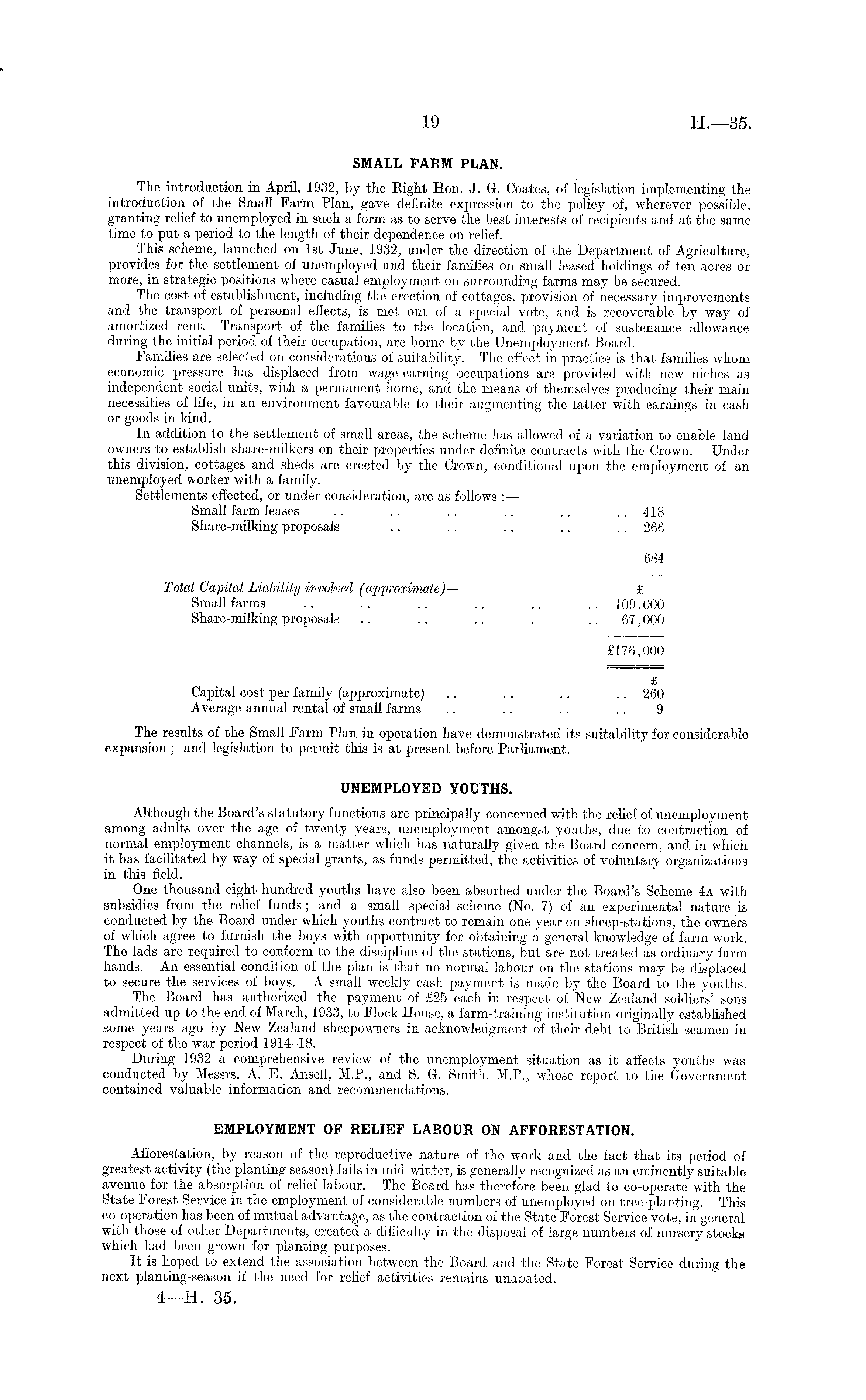 SMALL FARM PLAN. The introduction in April, 1932, by the Right Hon. J. G. Coates, of legislation implementing the introduction of the Small Farm Plan, gave definite expression to the policy of, wherever possible, granting relief to unemployed in such a form as to serve the best interests of recipients and at the same time to put a period to the length of their dependence on relief. This scheme, launched on Ist June, 1932, under the direction of the Department of Agriculture, provides for the settlement of unemployed and their families on small leased holdings of ten acres or more, in strategic positions where casual employment on surrounding farms may be secured. The cost of establishment, including the erection of cottages, provision of necessary improvements and the transport of personal effects, is met out of a special vote, and is recoverable by way of amortized rent. Transport of the families to the location, and payment of sustenance allowance during the initial period of their occupation, are borne by the Unemployment Board. Families are selected on considerations of suitability. The effect in practice is that families whom economic pressure has displaced from wage-earning occupations are provided with new niches as independent social units, with a permanent home, and the means of themselves producing their main necessities of life, in an environment favourable to their augmenting the latter with earnings in cash or goods in kind. In addition to the settlement of small areas, the scheme has allowed of a variation to enable land owners to establish share-milkers on their properties under definite contracts with the Crown. Under this division, cottages and sheds are erected by the Crown, conditional upon the employment of an unemployed worker with a family. Settlements effected, or under consideration, are as follows : — Small farm leases .. .. .. .. .. .. 418 Share-milking proposals .. .. .. .. .. 266 684 Total Capital Liability involved (approximate)— £ Small farms .. .. .. .. .. .. 109,000 Share-milking proposals .. .. .. .. .. 67,000 £176,000 £ Capital cost per family (approximate) .. .. .. .. 260 Average annual rental of small farms .. .. .. .. 9 The results of the Small Farm Plan in operation have demonstrated its suitability for considerable expansion ; and legislation to permit this is at present before Parliament. UNEMPLOYED YOUTHS. Although the Board's statutory functions are principally concerned with the relief of unemployment among adults over the age of twenty years, unemployment amongst youths, due to contraction of normal employment channels, is a matter which has naturally given the Board concern, and in which it has facilitated by way of special grants, as funds permitted, the activities of voluntary organizations in this field. One thousand eight hundred youths have also been absorbed under the Board's Scheme 4a with subsidies from the relief funds ; and a small specia-l scheme (No. 7) of an experimental nature is conducted by the Board under which youths contract to remain one year on sheep-stations, the owners of which agree to furnish the boys with opportunity for obtaining a general knowledge of farm work. The lads are required to conform to the discipline of the stations, but are not treated as ordinary farm hands. An essential condition of the plan is that no normal labour on the stations may be displaced to secure the services of boys. A small weekly cash payment is made by the Board to the youths. The Board has authorized the payment of £25 each in respect of New Zealand soldiers' sons admitted up to the end of March, 1933, to Flock House, a farm-training institution originally established some years ago by New Zealand sheepowners in acknowledgment of their debt to British seamen in respect of the war period 1914-18. During 1932 a comprehensive review of the unemployment situation as it affects youths was conducted by Messrs. A. E. Ansell, M.P., and S. G. Smith, M.P., whose report to the Government contained valuable information and recommendations. EMPLOYMENT OF RELIEF LABOUR ON AFFORESTATION. Afforestation, by reason of the reproductive nature of the work and the fact that its period of greatest activity (the planting season) falls in mid-winter, is generally recognized as an eminently suitable avenue for the absorption of relief labour. The Board has therefore been glad to co-operate with the State Forest Service in the employment of considerable numbers of unemployed on tree-planting. This co-operation has been of mutual advantage, as the contraction of the State Forest Service vote, in general with those of other Departments, created a difficulty in the disposal of large numbers of nursery stocks which had been grown for planting purposes. It is hoped to extend the association between the Board and the State Forest Service during the next planting-season if the need for relief activities remains unabated.