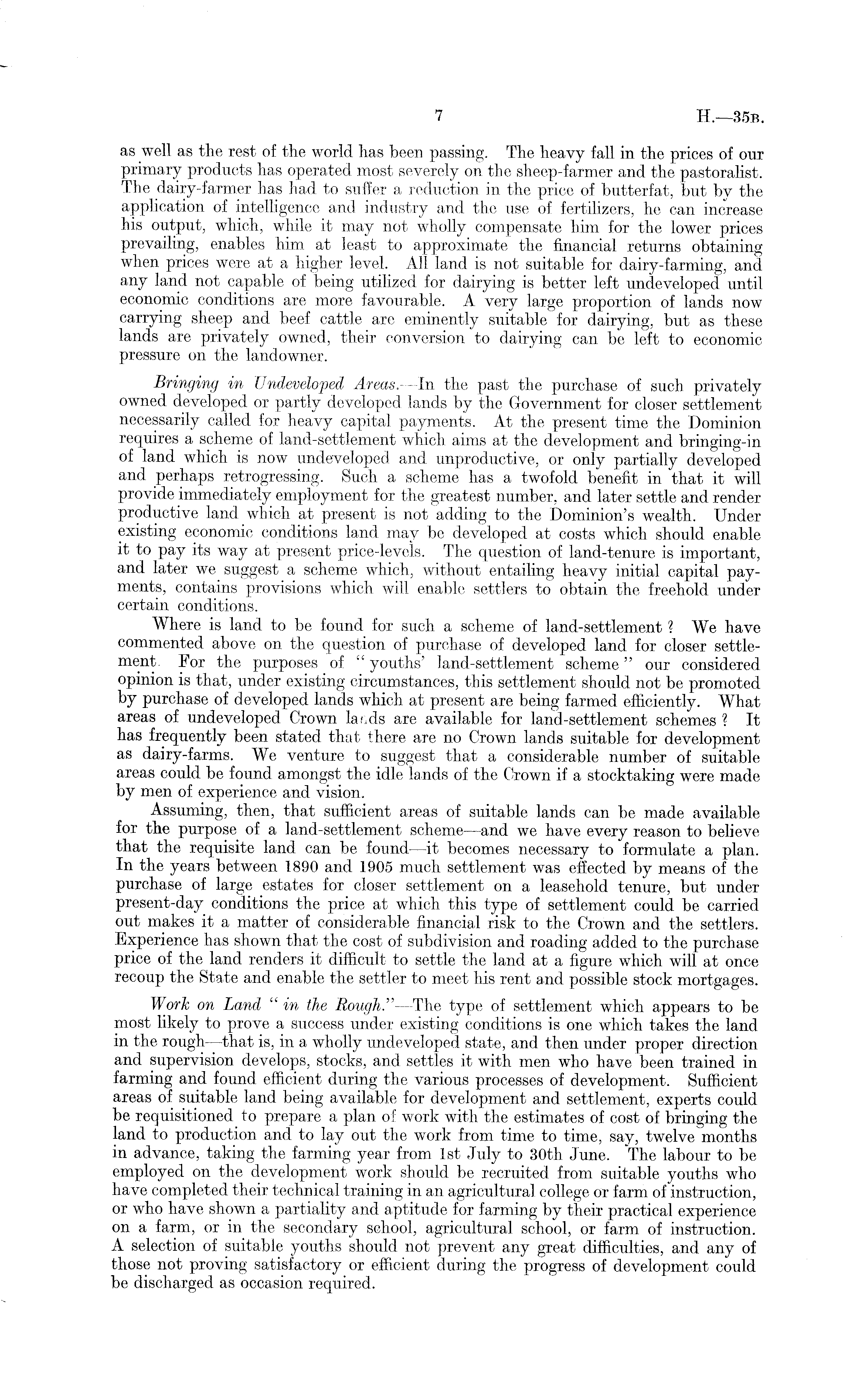 as well as the rest of the world has been passing. The heavy fall in the prices of our primary products has operated most severely on the sheep-farmer and the pastoralist. The dairy-farmer has had to suffer a reduction in the price of butterfat, but by the application of intelligence and industry and the use of fertilizers, he can increase his output, which, while it may not wholly compensate him for the lower prices prevailing, enables him at least to approximate the financial returns obtaining when prices were at a higher level. All land is not suitable for dairy-farming, and any land not capable of being utilized for dairying is better left undeveloped until economic conditions are more favourable. A very large proportion of lands now carrying sheep and beef cattle are eminently suitable for dairying, but as these lands are privately owned, their conversion to dairying can be left to economic pressure on the landowner. Bringing in Undeveloped Areas.—ln the past the purchase of such privately owned developed or partly developed lands by the Government for closer settlement necessarily called for heavy capital payments. At the present time the Dominion requires a scheme of land-settlement which aims at the development and bringing-in of land which is now undeveloped and unproductive, or only partially developed and perhaps retrogressing. Such a scheme has a twofold benefit in that it will provide immediately employment for the greatest number, and later settle and render productive land which at present is not adding to the Dominion's wealth. Under existing economic conditions land may be developed at costs which should enable it to pay its way at present price-levels. The question of land-tenure is important, and later we suggest a scheme which, without entailing heavy initial capital payments, contains provisions which will enable settlers to obtain the freehold under certain conditions. Where is land to be found for such a scheme of land-settlement ? We have commented above on the question of purchase of developed land for closer settlement. For the purposes of " youths' land-settlement scheme" our considered opinion is that, under existing circumstances, this settlement should not be promoted by purchase of developed lands which at present are being farmed efficiently. What areas of undeveloped Crown lar,ds are available for land-settlement schemes ? It has frequently been stated that there are no Crown lands suitable for development as dairy-farms. We venture to suggest that a considerable number of suitable areas could be found amongst the idle lands of the Crown if a stocktaking were made by men of experience and vision. Assuming, then, that sufficient areas of suitable lands can be made available for the purpose of a land-settlement scheme—and we have every reason to believe that the requisite land can be found—it becomes necessary to formulate a plan. In the years between 1890 and 1905 much settlement was effected by means of the purchase of large estates for closer settlement on a leasehold tenure, but under present-day conditions the price at which this type of settlement could be carried out makes it a matter of considerable financial risk to the Crown and the settlers. Experience has shown that the cost of subdivision and roading added to the purchase price of the land renders it difficult to settle the land at a figure which will at once recoup the State and enable the settler to meet his rent and possible stock mortgages. Work on Land " in the Rough." —The type of settlement which appears to be most likely to prove a success under existing conditions is one which takes the land in the rough —that is, in a wholly undeveloped state, and then under proper direction and supervision develops, stocks, and settles it with men who have been trained in farming and found efficient during the various processes of development. Sufficient areas of suitable land being available for development and settlement, experts could be requisitioned to prepare a plan of work with the estimates of cost of bringing the land to production and to lay out the work from time to time, say, twelve months in advance, taking the farming year from Ist July to 30th June. The labour to be employed on the development work should be recruited from suitable youths who have completed their technical training in an agricultural college or farm of instruction, or who have shown a partiality and aptitude for farming by their practical experience on a farm, or in the secondary school, agricultural school, or farm of instruction. A selection of suitable youths should not prevent any great difficulties, and any of those not proving satisfactory or efficient during the progress of development could be discharged as occasion required.