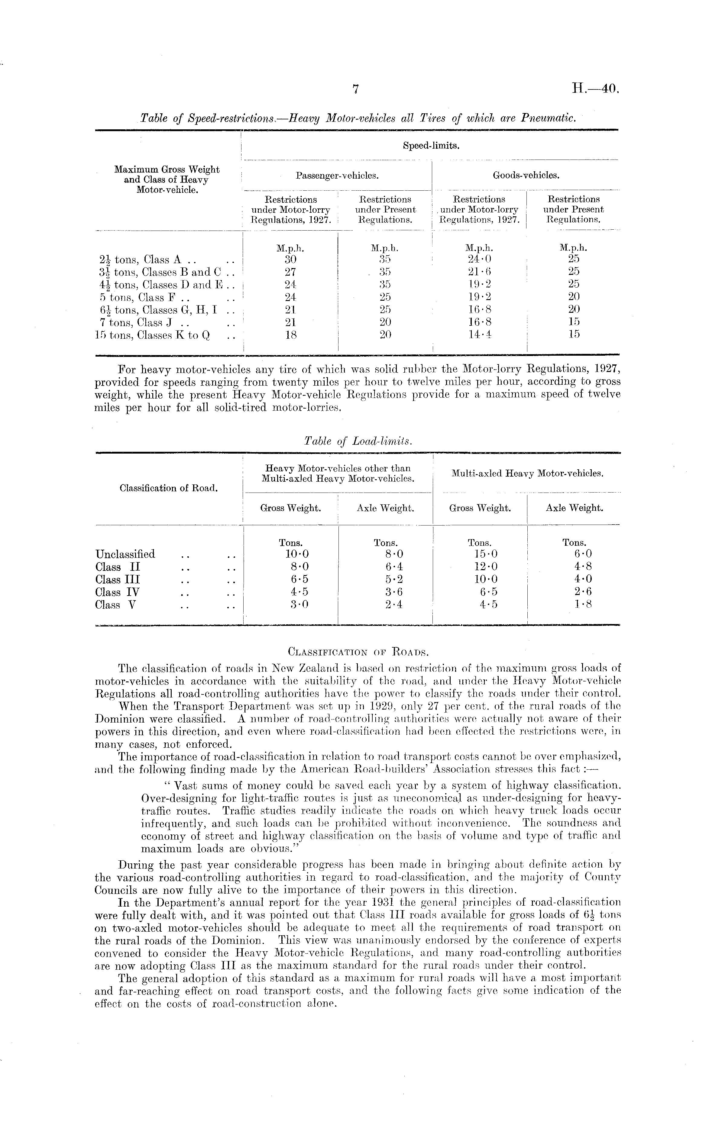 Speed-limits. Maximum Gross Weight _ ... „ . , . , and Class of Heavy Passenger-vehicles. Goods-vehicles. Motor-vehicle. ; Restrictions ' Restrictions Restrictions Restrictions under Motor-lorry under Present . under Motor-lorry under Present Regulations, 1927. i Regulations. Regulations, 1927. Regulations. M.p.h. M.p.h. M.p.h. M.p.h. 21 tons, Class A .. .. 30 35 24-0 j 25 3| tons, Classes B and C .. 27 - 35 21-6 ! 25 4\ tons, Classes D and E .. 24 35 19-2 25 5 tons, Class F .. .. 24 25 19-2 20 6J tons, Classes G, H, I .. 21 25 16-8 20 7 tons, Class J .. .. 21 20 16-8 j 15 15 tons, Classes K to Q .. ' 18 | 20 14-4 j 15 i _—