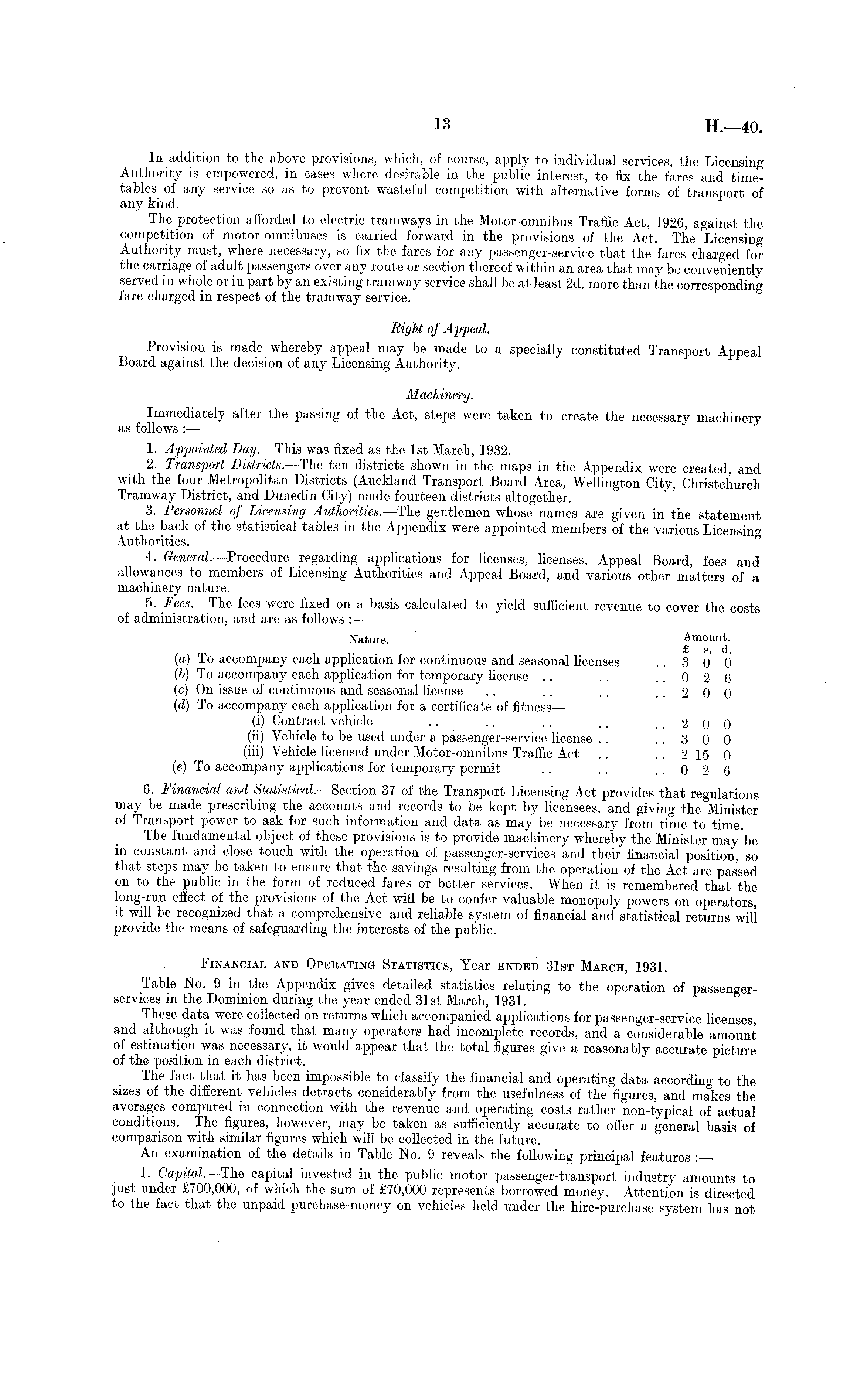 In addition to the above provisions, which, of course, apply to individual services, the Licensing Authority is empowered, in cases where desirable in the public interest, to fix the fares and timetables of any service so as to prevent wasteful competition with alternative forms of transport of any kind. The protection afforded to electric tramways in the Motor-omnibus Traffic Act, 1926, against the competition of motor-omnibuses is carried forward in the provisions of the Act. The Licensing Authority must, where necessary, so fix the fares for any passenger-service that the fares charged for the carriage of adult passengers over any route or section thereof within an area that may be conveniently served in whole or in part by an existing tramway service shall be at least 2d. more than the corresponding fare charged in respect of the tramway service. Right of Appeal. Provision is made whereby appeal may be made to a specially constituted Transport Appeal Board against the decision of any Licensing Authority. Machinery. Immediately after the passing of the Act, steps were taken to create the necessary machinery as follows :— 1. Appointed Day. —This was fixed as the Ist March, 1932. 2. Transport Districts. —The ten districts shown in the maps in the Appendix were created, and with the four Metropolitan Districts (Auckland Transport Board Area, Wellington City, Christchurch Tramway District, and Dunedin City) made fourteen districts altogether. 3. Personnel of Licensing Authorities.—The gentlemen whose names are given in the statement at the back of the statistical tables in the Appendix were appointed members of the various Licensing Authorities. 4. General.-—Procedure regarding applications for licenses, licenses, Appeal Board, fees and allowances to members of Licensing Authorities and Appeal Board, and various other matters of a machinery nature. 5. Fees.—The fees were fixed on a basis calculated to yield sufficient revenue to cover the costs of administration, and are as follows : — Nature. Amount. £ s. d. (a) lo accompany each application for continuous and seasonal licenses ..300 (b) To accompany each application for temporary license . . .. ..026 (c) On issue of continuous and seasonal license .. .. .. ..200 (d) To accompany each application for a certificate of fitness— (i) Contract vehicle .. .. .. .. ..200 (ii) Vehicle to be used under a passenger-service license .. ..300 (iii) Vehicle licensed under Motor-omnibus Traffic Act .. . . 215 0 (e) To accompany applications for temporary permit .. .. ..026 6. Financial Statistical.—Section 37 of the Transport Licensing Act provides that regulations may be made prescribing the accounts and records to be kept by licensees, and giving the Minister of Transport power to ask for such information and data as may be necessary from time to time. The fundamental object of these provisions is to provide machinery whereby the Minister may be in constant and close touch with the operation of passenger-services and their financial position, so that steps may be taken to ensure that the savings resulting from the operation of the Act are passed on to the public in the form of reduced fares or better services. When it is remembered that the long-run effect of the provisions of the Act will be to confer valuable monopoly powers on operators, it will be recognized that a comprehensive and reliable system of financial and statistical returns will provide the means of safeguarding the interests of the public. Financial and Opebating Statistics, Year ended 31st Mabch, 1931. Table No. 9 in the Appendix gives detailed statistics relating to the operation of passengerservices in the Dominion during the year ended 31st March, 1931. These data were collected on returns which accompanied applications for passenger-service licenses, and although it was found that, many operators had incomplete records, and a considerable amount of estimation was necessary, it would appear that the total figures give a reasonably accurate picture of the position in each district. The fact that it has been impossible to classify the financial and operating data according to the sizes of the different vehicles detracts considerably from the usefulness of the figures, and makes the averages computed in connection with the revenue and operating costs rather non-typical of actual conditions. The figures, however, may be taken as sufficiently accurate to offer a general basis of comparison with similar figures which will be collected in the future. An examination of the details in Table No. 9 reveals the following principal features : 1. Capital.—The capital invested in the public motor passenger-transport industry amounts to just under £700,000, of which the sum of £70,000 represents borrowed money. Attention is directed to the fact that the unpaid purchase-money on vehicles held under the hire-purchase system has not