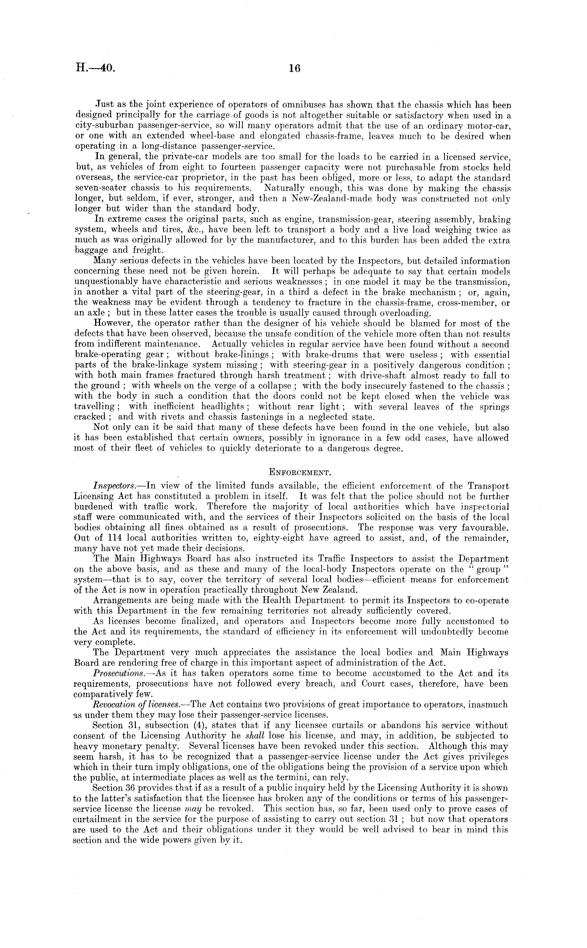 Just as the joint experience of operators of omnibuses has shown that the chassis which has been designed principally for the carriage of goods is not altogether suitable or satisfactory when used in a city-suburban passenger-service, so will many operators admit that the use of an ordinary motor-car, or one with an extended wheel-base and elongated chassis-frame, leaves much to be desired when operating in a long-distance passenger-service. In general, the private-car models are too small for the loads to be carried in a licensed service, but, as vehicles of from eight to fourteen passenger capacity were not purchasable from stocks held overseas, the service-car proprietor, in the past has been obliged, more or less, to adapt the standard seven-seater chassis to his requirements. Naturally enough, this was done by making the chassis longer, but seldom, if ever, stronger, and then a New-Zealand-made body was constructed not only longer but wider than the standard body. In extreme cases the original parts, such as engine, transmission-gear, steering assembly, braking system, wheels and tires, &c., have been left to transport a body and a live load weighing twice as much as was originally allowed for by the manufacturer, and to this burden has been added the extra baggage and freight. Many serious defects in the vehicles have been located by the Inspectors, but detailed information concerning these need not be given herein. It will perhaps be adequate to say that certain models unquestionably have characteristic and serious weaknesses ; in one model it may be the transmission, in another a vital part of the steering-gear, in a third a defect in the brake mechanism ; or, again, the weakness may be evident through a tendency to fracture in the chassis-frame, cross-member, or an axle ; but in these latter cases the trouble is usually caused through overloading. However, the operator rather than the designer of his vehicle should be blamed for most of the defects that have been observed, because the unsafe condition of the vehicle more often than not results from indifferent maintenance. Actually vehicles in regular service have been found without a second brake-operating gear ; without brake-linings ; with brake-drums that were useless ; with essential parts of the brake-linkage system missing ; with steering-gear in a positively dangerous condition ; with both main frames fractured through harsh treatment; with drive-shaft almost ready to fall to the ground ; with wheels on the verge of a collapse ; with the body insecurely fastened to the chassis ; with the body in such a condition that the doors could not be kept closed when the vehicle was travelling ; with inefficient headlights ; without rear light; with several leaves of the springs cracked ; and with rivets and chassis fastenings in a neglected state. Not only can it be said that many of these defects have been found in the one vehicle, but also it has been established that certain owners, possibly in ignorance in a few odd cases, have allowed most of their fleet of vehicles to quickly deteriorate to a dangerous degree. Enforcement. Inspectors.—ln view of the limited funds available, the efficient enforcement of the Transport Licensing Act has constituted a problem in itself. It was felt that the police should not be further burdened with traffic work. Therefore the majority of local authorities which have inspectorial staff were communicated with, and the services of their Inspectors solicited on the basis of the local bodies obtaining all fines obtained as a result of prosecutions. The response was very favourable. Out of 114 local authorities written to, eighty-eight have agreed to assist, and, of the remainder, many have not yet made their decisions. The Main Highways Board has also instructed its Traffic Inspectors to assist the Department on the above basis, and as these and many of the local-body Inspectors operate on the " group " system —that is to say, cover the territory of several local bodies —efficient means for enforcement of the Act is now in operation practically throughout New Zealand. Arrangements are being made with the Health Department to permit its Inspectors to co-operate with this Department in the few remaining territories not already sufficiently covered. As licenses become finalized, and operators and Inspectors become more fully accustomed to the Act and its requirements, the standard of efficiency in its enforcement will undoubtedly become very complete. The Department very much appreciates the assistance the local bodies and Main Highways Board are rendering free of charge in this important aspect of administration of the Act. Prosecutions. —As it has taken operators some time to become accustomed to the Act and its requirements, prosecutions have not followed every breach, and Court cases, therefore, have been comparatively few. Revocation of licenses. —The Act contains two provisions of great importance to operators, inasmuch as under them they may lose their passenger-service licenses. Section 31, subsection (4), states that if any licensee curtails or abandons his service without consent of the Licensing Authority he shall lose his license, and may, in addition, be subjected to heavy monetary penalty. Several licenses have been revoked under this section. Although this may seem harsh, it has to be recognized that a passenger-service license under the Act gives privileges which in their turn imply obligations, one of the obligations being the provision of a service upon which the public, at intermediate places as well as the termini, can rely. Section 36 provides that if as a result of a public inquiry held by the Licensing Authority it is shown to the latter's satisfaction that the licensee has broken any of the conditions or terms of his passengerservice license the license may be revoked. This section has, so far, been used only to prove cases of curtailment in the service for the purpose