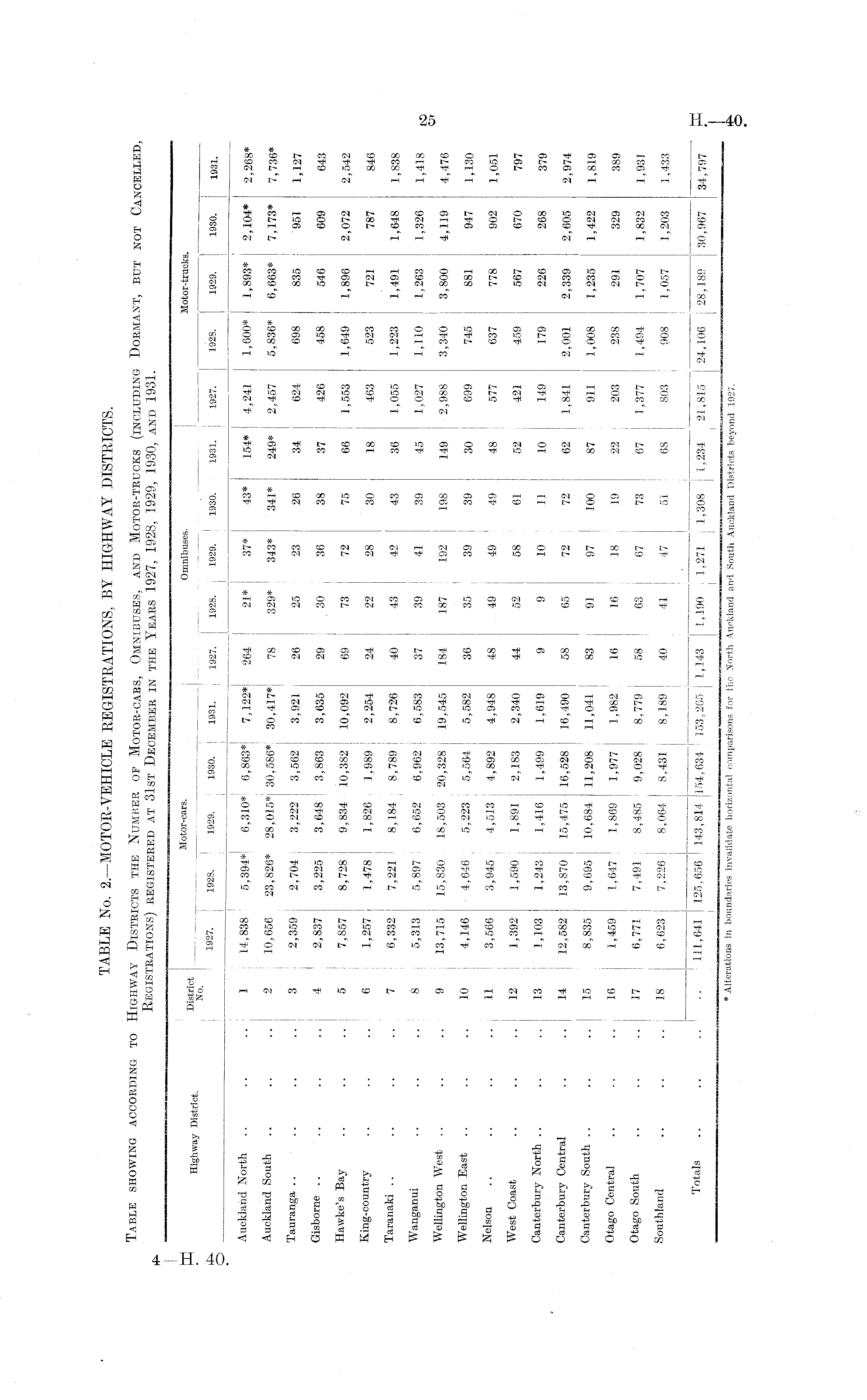 TABLE No. 2.—MOTOR-VEHICLE REGISTRATIONS, BY HIGHWAY DISTRICTS. Table showing according to Highway Districts the Number of Motor-cars, Omnibuses, and Motor-trucks (including Dormant, but not Cancelled, Registrations) registered at 31st December in the Years 1927, 1928, 1929, 1930, and 1931.