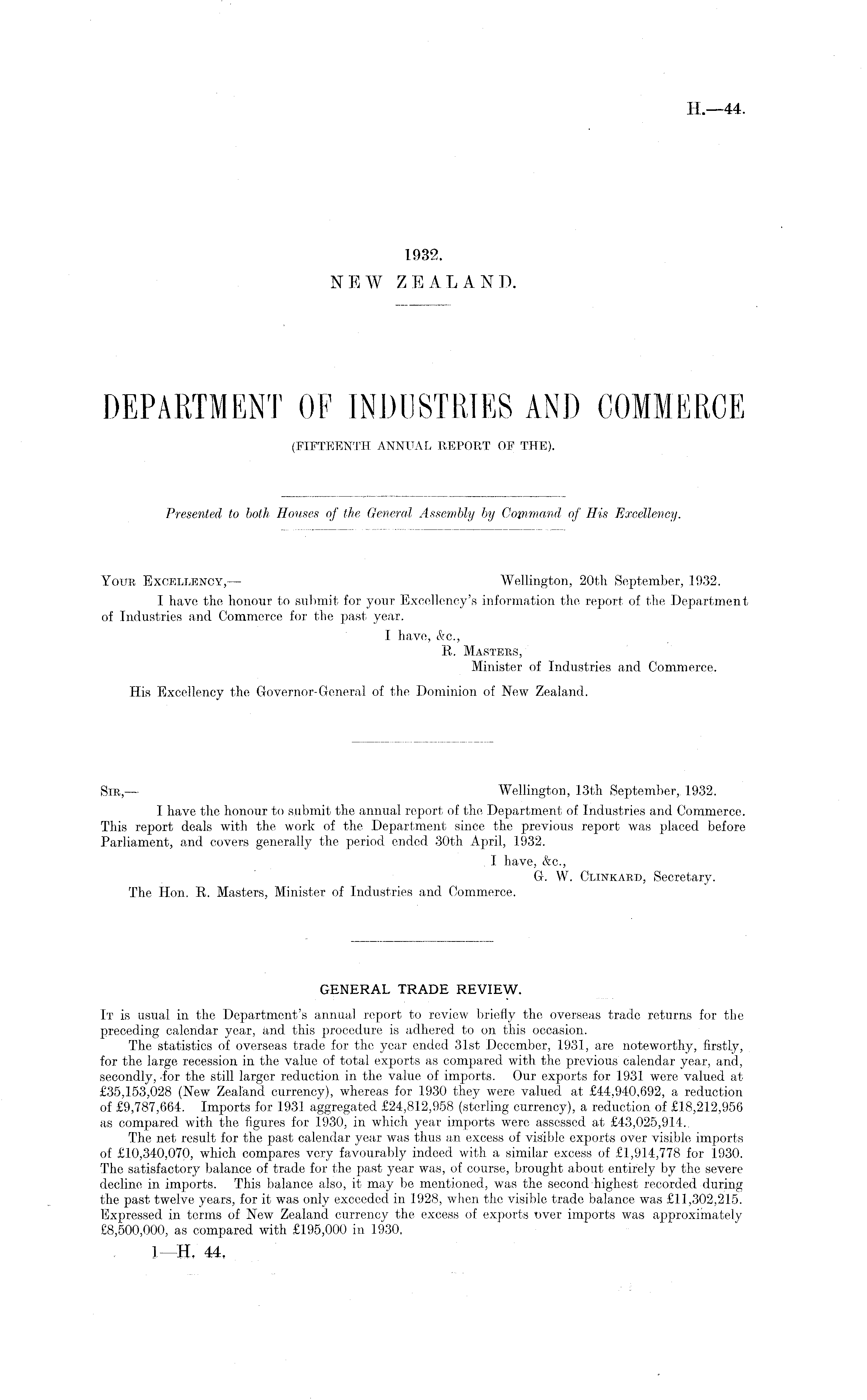 Youb Excellency,— Wellington, 20th September, 1932. I have the honour to submit for your Excellency's information the report of the Department of Industries and Commerce for the past year. I have, &c, R. Masters, Minister of Industries and Commerce. His Excellency the Governor-General of the Dominion of New Zealand.