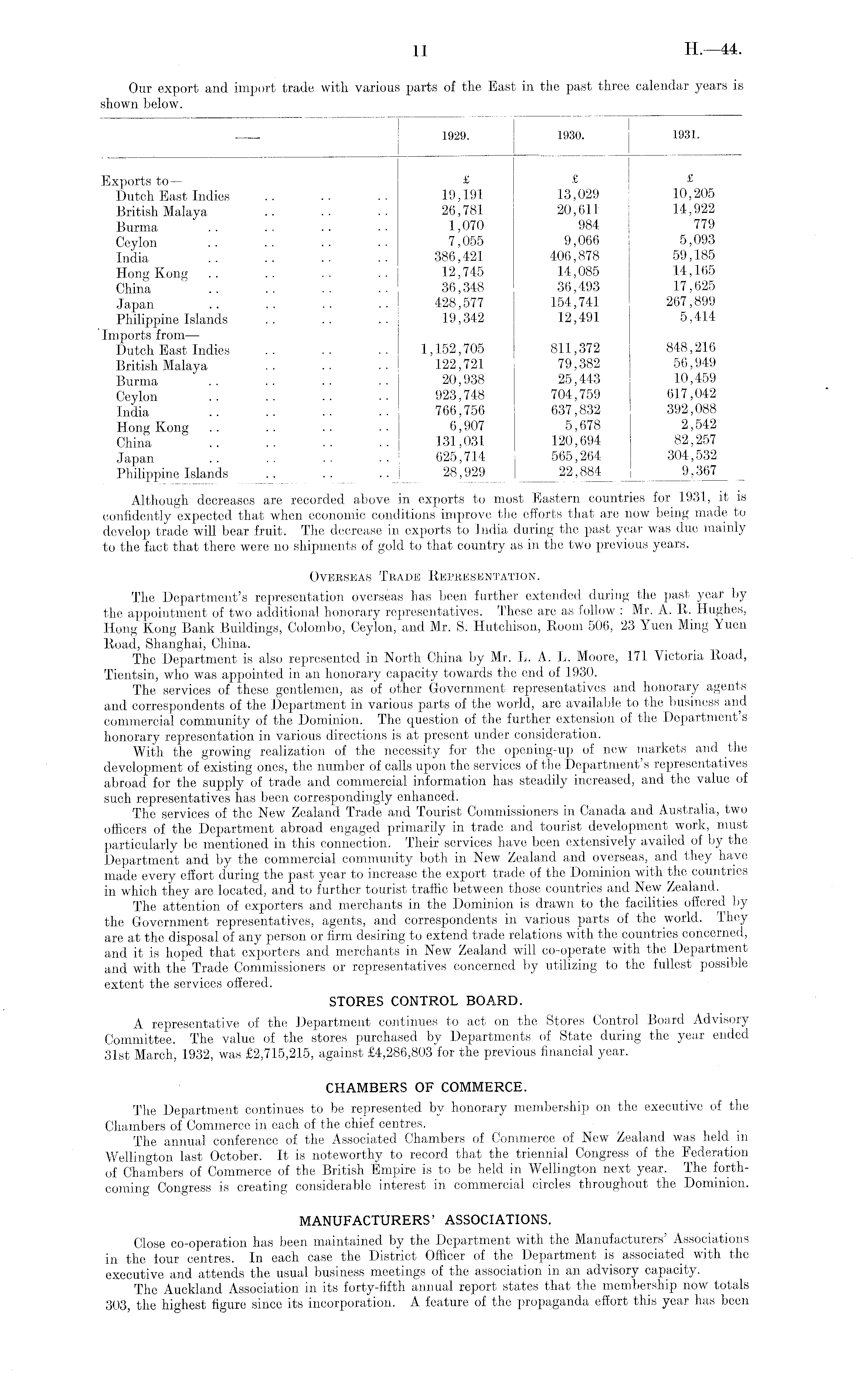 Although decreases are recorded above in exports to most Eastern countries for 1931, it is confidently expected that when economic conditions improve the efforts that are now being made to develop trade will bear fruit. The decrease in exports to India during the past year was due mainly to the fact that there were no shipments of gold to that country as in the two previous years. Oveeseas Trade Representation. The Department's representation overseas has been further extended during the past year by the appointment of two additional honorary representatives. These are as follow : Mr. A. R. Hughes, Hong Kong Bank Buildings, Colombo, Ceylon, and Mr. S. Hutchison, Room 506, 23 Yuen Ming Yuen Road, Shanghai, China. The Department is also represented in North China by Mr. L. A. L. Moore, 171 Victoria Road, Tientsin, who was appointed in an honorary capacity towards the end of 1930. The services of these gentlemen, as of other Government representatives and honorary agents and correspondents of the Department in various parts of the world, are available to the business and commercial community of the Dominion. The question of the further extension of the Department's honorary representation in various directions is at present under consideration. With the growing realization of the necessity for the opening-up of new markets and the development of existing ones, the number of calls upon the services of the Department's representatives abroad for the supply of trade and commercial information has steadily increased, and the value of such representatives has been correspondingly enhanced. The services of the New Zealand Trade and Tourist Commissioners in Canada and Australia, two officers of the Department abroad engaged primarily in trade and tourist development work, must particularly be mentioned in this connection. Their services have been extensively availed of by the Department and by the commercial community both in New Zealand and overseas, and they have made every effort during the past year to increase the export trade of the Dominion with the countries in which they are located, and to further tourist traffic between those countries and New Zealand. The attention of exporters and merchants in the Dominion is drawn to the facilities offered by the Government representatives, agents, and correspondents in various parts of the world. They are at the disposal of any person or firm desiring to extend trade relations with the countries concerned, and it is hoped that exporters and merchants in New Zealand will co-operate with the Department and with the Trade Commissioners or representatives concerned by utilizing to the fullest possible extent the services offered. STORES CONTROL BOARD. A representative of the Department continues to act on the Stores Control Board Advisory Committee. The value of the stores purchased by Departments of State during the year ended 31st March, 1932, was £2,715,215, against £4,286,803 for the previous financial year. CHAMBERS OF COMMERCE. The Department continues to be represented by honorary membership on the executive of the Chambers of Commerce in each of the chief centres. The annual conference of the Associated Chambers of Commerce of New Zealand was held in Wellington last October. It is noteworthy to record that the triennial Congress of the Federation of Chambers of Commerce of the British Empire is to be held in Wellington next year. The forthcoming Congress is creating considerable interest in commercial circles throughout the Dominion. MANUFACTURERS' ASSOCIATIONS. Close co-operation has been maintained by the Department with the Manufacturers' Associations in the tour centres. In each case the District Officer of the Department is associated with the executive and attends the usual business meetings of the association in an advisory capacity. The Auckland Association in its forty-fifth annual report states that the membership now totals 303, the highest figure since its incorporation. A feature of the propaganda effort this year has been