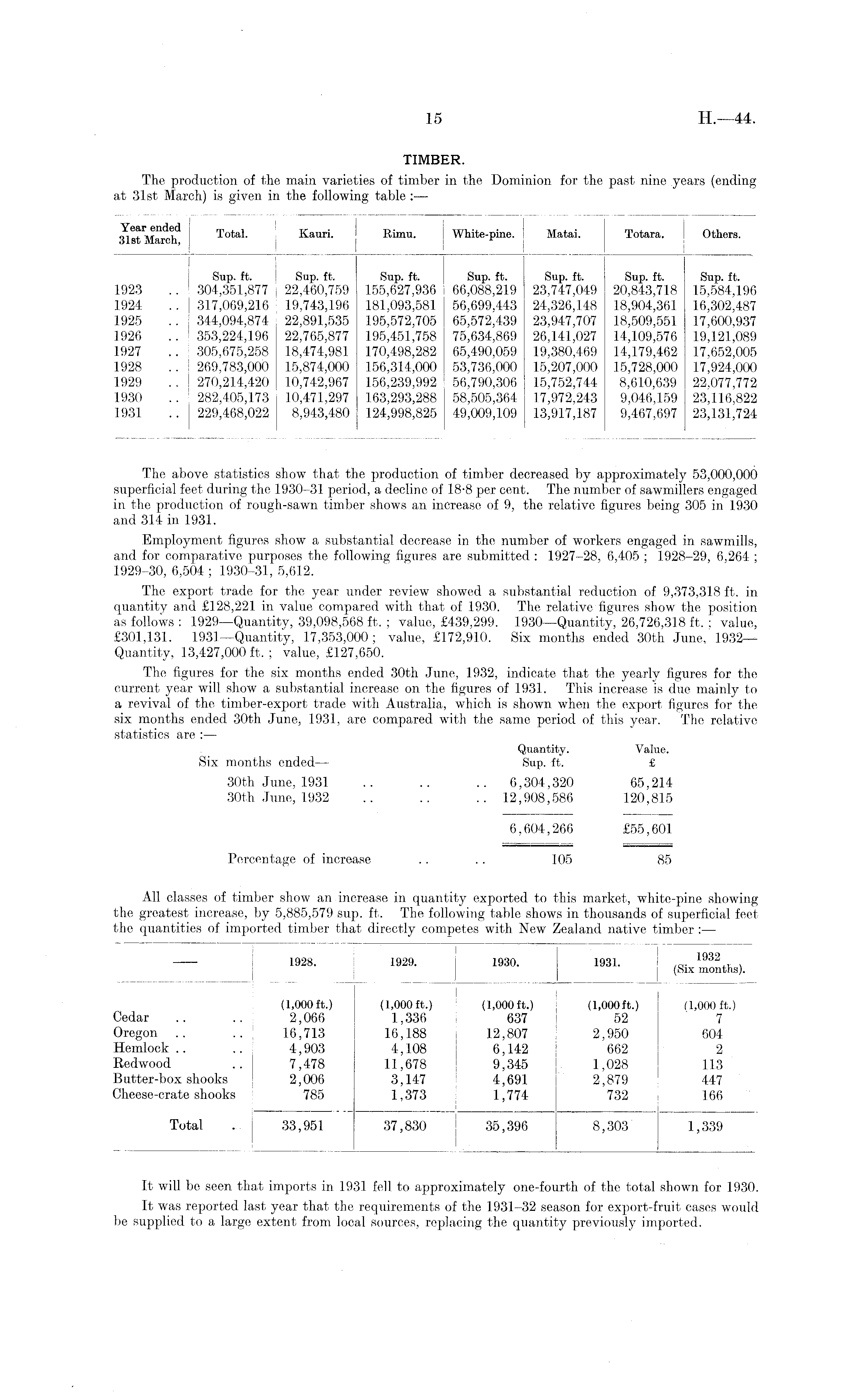 Total. Kauri. Rimu. White-pine. Matai. Totara. Others. ' Sup. ft. Sup. ft. Sup. ft. Sup. ft. Sup. ft. Sup. ft. Sup. ft. 1923 .. ! 304,351,877 22,460,759 155,627,936 66,088,219 23,747,049 20,843,718 15,584,196 1924 .. 317,069,216 19,743,196 181,093,581 56,699.443 24,326,148 18,904,361 16,302,487 1925 .. 344,094,874 22,891,535 195,572,705 65,572,439 23,94-7,707 18,509,551 17,600,937 1926 .. 353,224,196 22,765,877 195,451,758 75,634,869 26,141,027 14,109,576 19,121,089 1927 .. 305,675,258 18,474,981 170,498,282 65,490,059 19,380,469 14,179,462 17,652,005 1928 .. 269,783,000 15,874,000 156,314,000 53,736,000 15,207,000 15,728,000 17,924,000 1929 .. 270,214,420 10,742,967 156,239,992 56,790,306 15,752,744 8,610,639 22.077,772 1930 .. 282,405,173 10,471,297 163,293,288 58,505,364 17,972,243 9,046,159 23,116,822 1931 .. 229,468,022 8,943,480 124,998,825 49,009,109 13,917,187 9,467,697 23,131,724