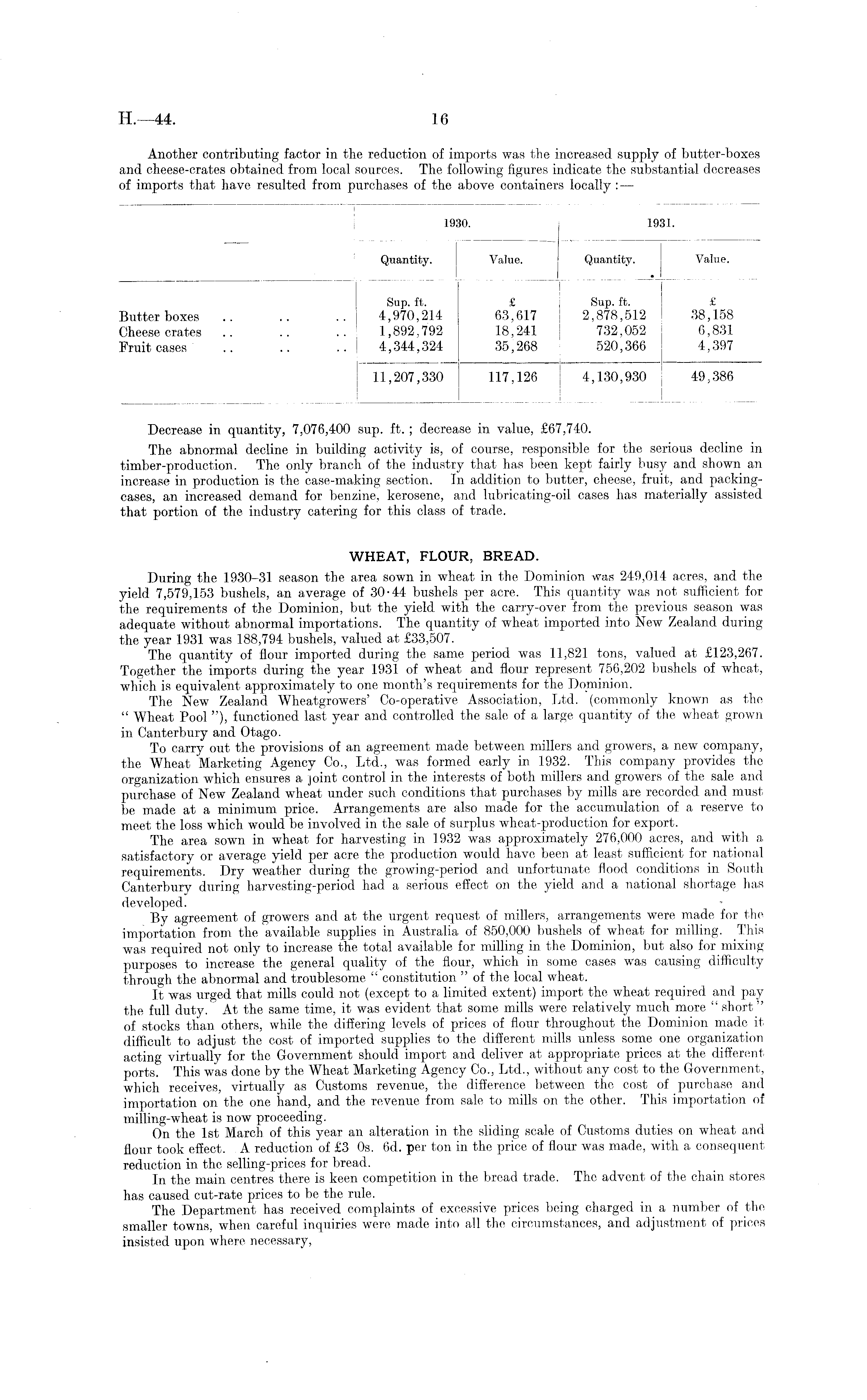 Decrease in quantity, 7,076,400 sup. ft. ; decrease in value, £67,740. The abnormal decline in building activity is, of course, responsible for the serious decline in timber-production. The only branch of the industry that has been kept fairly busy and shown an increase in production is the case-making section. In addition to butter, cheese, fruit, and packingcases, an increased demand for benzine, kerosene, and lubricating-oil cases has materially assisted that portion of the industry catering for this class of trade. WHEAT, FLOUR, BREAD. During the 1930-31 season the area sown in wheat in the Dominion was 249,014 acres, and the yield 7,579,153 bushels, an average of 30-44 bushels per acre. This quantity was not sufficient for the requirements of the Dominion, but the yield with the carry-over from the previous season was adequate without abnormal importations. The quantity of wheat imported into New Zealand during the year 1931 was 188,794 bushels, valued at £33,507. The quantity of flour imported during the same period was 11,821 tons, valued at £123,267. Together the imports during the year 1931 of wheat and flour represent 756,202 bushels of wheat, which is equivalent approximately to one month's requirements for the Dominion. The New Zealand Wheatgrowers' Co-operative Association, Ltd. (commonly known as the " Wheat Pool "), functioned last year and controlled the sale of a large quantity of the wheat grown in Canterbury and Otago. To carry out the provisions of an agreement made between millers and growers, a new company, the Wheat Marketing Agency Co., Ltd., was formed early in 1932. This company provides the organization which ensures a joint control in the interests of both millers and growers of the sale and purchase of New Zealand wheat under such conditions that purchases by mills are recorded and must be made at a minimum price. Arrangements are also made for the accumulation of a reserve to meet the loss which would be involved in the sale of surplus wheat-production for export. The area sown in wheat for harvesting in 1932 was approximately 276,000 acres, and with a satisfactory or average yield per acre the production would have been at least sufficient for national requirements. Dry weather during the growing-period and unfortunate flood conditions in South Canterbury during harvesting-period had a serious effect on the yield and a national shortage has developed. • By agreement of growers and at the urgent request of millers, arrangements were made for the importation from the available supplies in Australia of 850,000 bushels of wheat for milling. This was required not only to increase the total available for milling in the Dominion, but also for mixing purposes to increase the general quality of the flour, which in some cases was causing difficulty through the abnormal and troublesome " constitution " of the local wheat. It was urged that mills could not (except to a limited extent) import the wheat required and pay the full duty. At the same time, it was evident that some mills were relatively much more " short" of stocks than others, while the differing levels of prices of flour throughout the Dominion made it difficult to adjust the cost of imported supplies to the different mills unless some one organization acting virtually for the Government should import and deliver at appropriate prices at the different ports. This was done by the Wheat Marketing Agency Co., Ltd., without any cost to the Government, which receives, virtually as Customs revenue, the difference between the cost of purchase and importation on the one hand, and the revenue from sale to mills on the other. This importation of milling-wheat is now proceeding. On the Ist March of this year an alteration in the sliding scale of Customs duties on wheat and flour took effect. A reduction of £3 os. 6d. per ton in the price of flour was made, with a consequent reduction in the selling-prices for bread. In the main centres there is keen competition in the bread trade. The advent of the chain stores has caused cut-rate prices to be the rule. The Department has received complaints of excessive prices being charged in a number of the smaller towns, when careful inquiries were made into all the circumstances, and adjustment of prices insisted upon where necessary,