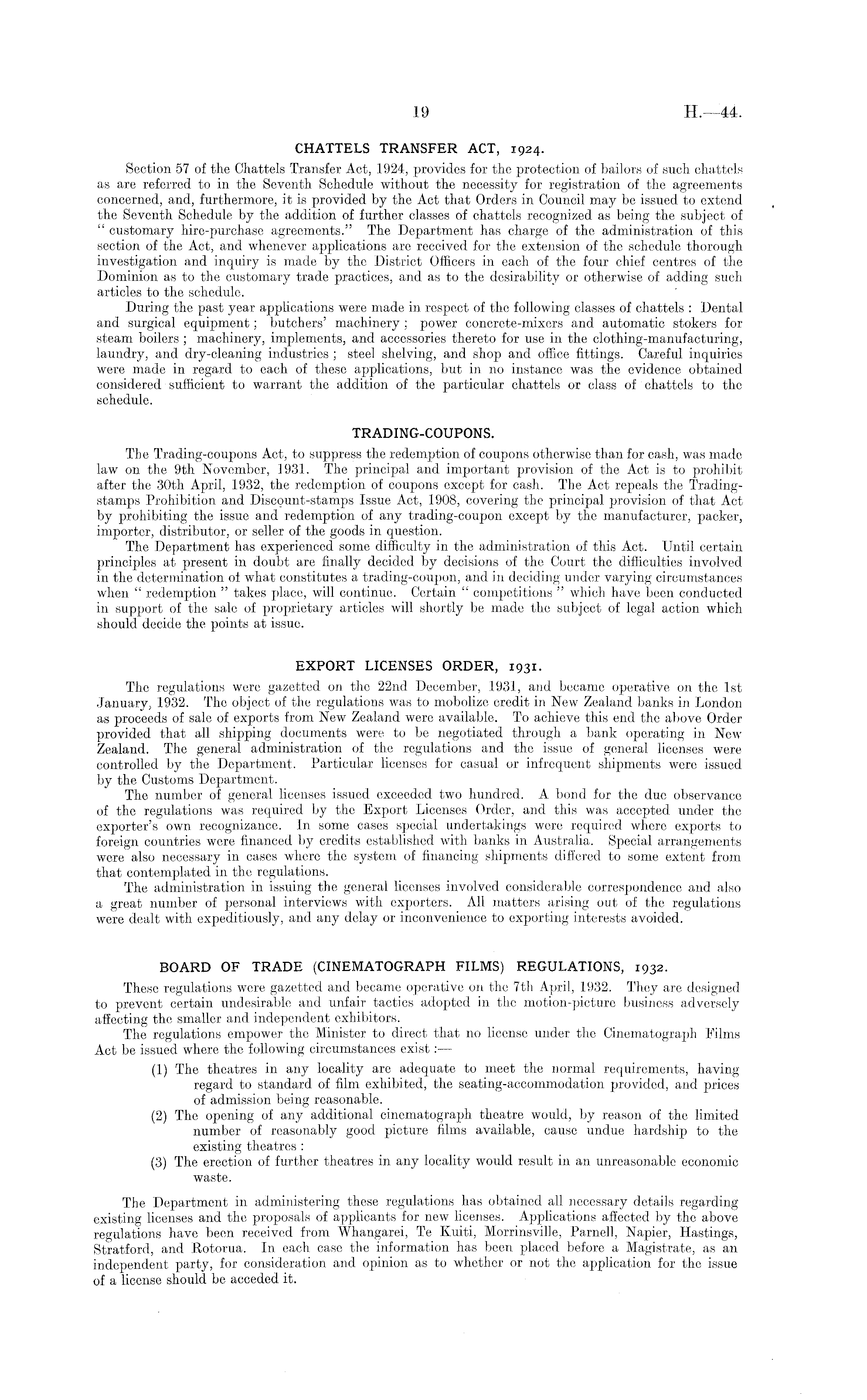 CHATTELS TRANSFER ACT, 1924. Section 57 of the Chattels Transfer Act, 1924, provides for the protection of bailors of such chattels as are referred to in the Seventh Schedule without the necessity for registration of the agreements concerned, and, furthermore, it is provided by the Act that Orders in Council may be issued to extend the Seventh Schedule by the addition of further classes of chattels recognized as being the subject of " customary hire-purchase agreements." The Department has charge of the administration of this section of the Act, and whenever applications are received for the extension of the schedule thorough investigation and inquiry is made by the District Officers in each of the four chief centres of the Dominion as to the customary trade practices, and as to the desirability or otherwise of adding such articles to the schedule. During the past year applications were made in respect of the following classes of chattels : Dental and surgical equipment; butchers' machinery ; power concrete-mixers and automatic stokers for steam boilers ; machinery, implements, and accessories thereto for use in the clothing-manufacturing, laundry, and dry-cleaning industries ; steel shelving, and shop and office fittings. Careful inquiries were made in regard to each of these applications, but in no instance was the evidence obtained considered sufficient to warrant the addition of the particular chattels or class of chattels to the schedule. TRADING-COUPONS. The Trading-coupons Act, to suppress the redemption of coupons otherwise than for cash, was made law on the 9th November, 1931. The principal and important provision of the Act is to prohibit after the 30th April, 1932, the redemption of coupons except for cash. The Act repeals the Tradingstamps Prohibition and Discount-stamps Issue Act, 1908, covering the principal provision of that Act by prohibiting the issue and redemption of any trading-coupon except by the manufacturer, packer, importer, distributor, or seller of the goods in question. The Department has experienced some difficulty in the administration of this Act. Until certain principles at present in doubt are finally decided by decisions of the Court the difficulties involved in the determination of what constitutes a trading-coupon, and in deciding under varying circumstances when " redemption " takes place, will continue. Certain " competitions " which have been conducted in support of the sale of proprietary articles will shortly be made the subject of legal action which should decide the points at issue. EXPORT LICENSES ORDER, 1931. The regulations were gazetted on the 22nd December, 1931, and became operative on the Ist Januarv, 1932. The object of the regulations was to mobolize credit in New Zealand banks in London as proceeds of sale of exports from New Zealand were available. To achieve this end the above Order provided that all shipping documents were to be negotiated through a bank operating in New Zealand. The general administration of the regulations and the issue of general licenses were controlled by the Department. Particular licenses for casual or infrequent shipments were issued by the Customs Department. The number of general licenses issued exceeded two hundred. A bond for the due observance of the regulations was required by the Export Licenses Order, and this was accepted, under the exporter's own recognizance. In some cases special undertakings were required where exports to foreign countries were financed by credits established with banks in Australia. Special arrangements were also necessary in cases where the system of financing shipments differed to some extent from that contemplated in the regulations. The administration in issuing the general licenses involved considerable correspondence and also a great number of personal interviews with exporters. AH matters arising out of the regulations were dealt with expeditiously, and any delay or inconvenience to exporting interests avoided. BOARD OF TRADE (CINEMATOGRAPH FILMS) REGULATIONS, 1932. These regulations were gazetted and became operative on the 7th April, 1932. They are designed to prevent certain undesirable and unfair tactics adopted in the motion-picture business adversely affecting the smaller and independent exhibitors. The regulations empower the Minister to direct that no license under the Cinematograph Kims Act be issued where the following circumstances exist: — (1) The theatres in any locality are adequate to meet the normal requirements, having regard to standard of film exhibited, the seating-accommodation provided, and prices of admission being reasonable. (2) The opening of any additional cinematograph theatre would, by reason of the limited number of reasonably good picture films available, cause undue hardship to the existing theatres : (3) The erection of further theatres in any locality would result in an unreasonable economic waste. The Department in administering these regulations has obtained all necessary details regarding existing licenses and the proposals of applicants for new licenses. Applications affected by the above regulations have been received from Whangarei, Te Kuiti, Morrinsville, Parnell, Napier, Hastings, Stratford, and Eotorua. In each case the information has been placed before a Magistrate, as an independent party, for consideration and opinion as to whether or not the application for the issue of a license should be acceded it.