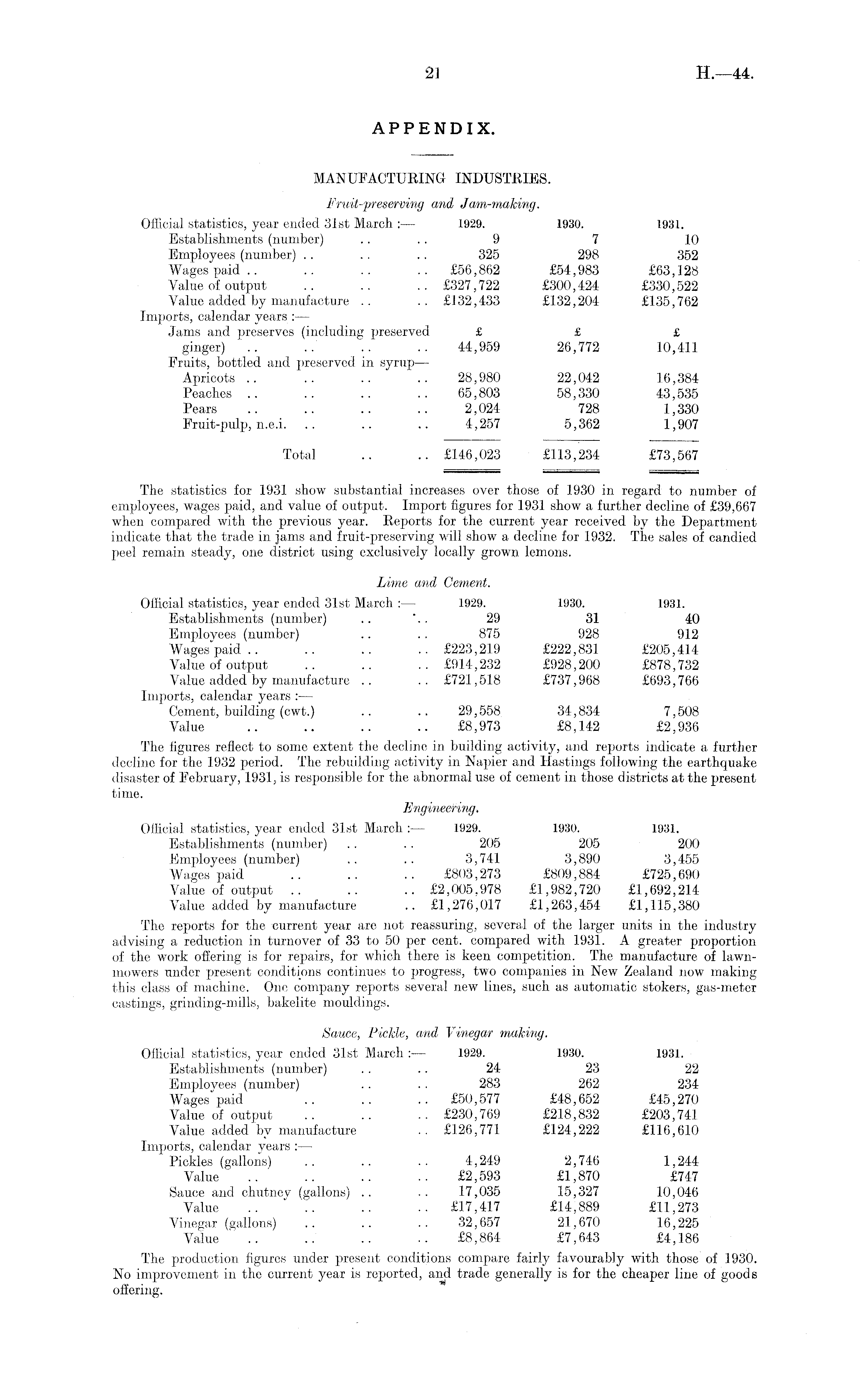 MANUFACTURING INDUSTRIES. Fmil-f reserving and Jam-making. Official statistics, year ended 31st March : — 1929. 1930. 1931. Establishments (number) .... 9 7 10 Employees (number) . . .. .. 325 298 352 Wages paid.. .. .. .. £56,862 £54,983 £63,128 Value of output .. .. .. £327,722 £300,424 £330,522 Value added by manufacture .. .. £132,433 £132,204 £135,762 Imports, calendar years : — Jams and preserves (including preserved £ £ £ ginger) .. .. .. .. 44,959 26,772 10,411 Fruits, bottled and preserved in syrup — Apricots .. .. .. .. 28,980 22,042 16,384 Peaches .. .. .. .. 65,803 58,330 43,535 Pears .. .. .. .. 2,024 728 1,330 Fruit-pulp, n.e.i. .. .. .. 4,257 5,362 1,907 Total .. .. £146,023 £113,234 £73,567 The statistics for 1931 show substantial increases over those of 1930 in regard to number of employees, wages paid, and value of output. Import figures for 1931 show a further decline of £39,667 when compared with the previous year. Reports for the current year received by the Department indicate that the trade in jams and fruit-preserving will show a decline for 1932. The sales of candied peel remain steady, one district using exclusively locally grown lemons. Lime and Cement. Official statistics, year ended 31st March : — 1929. 1930. 1931. Establishments (number) .. ".. 29 31 40 Employees (number) .. . . 875 928 912 Wages'paid .. .. .. .. £223,219 £222,831 £205,414 Value of output .. .. .. £914,232 £928,200 £878,732 Value added by manufacture .. .. £721,518 £737,968 £693,766 Imports, calendar years :— Cement, building (cwt.) .. .. 29,558 34,834 7,508 Value .. .. .. .. £8,973 £8,142 £2,936 The figures reflect to some extent the decline in building activity, and reports indicate a further decline for the 1932 period. The rebuilding activity in Napier and Hastings following the earthquake disaster of February, 1931, is responsible for the abnormal use of cement in those districts at the present time. Engineering. Official statistics, year ended 31st March : — 1929. 1930. 1931. Establishments (number) .. .. 205 205 200 Employees (number) .. .. 3,741 3,890 3,455 Wages paid .. .. .. £803,273 £809,884 £725,690 Value of output .. .. .. £2,005,978 £1,982,720 £1,692,214 Value added by manufacture .. £1,276,017 £1,263,454 £1,115,380 The reports for the current year are not reassuring, several of the larger units in the industry advising a reduction in turnover of 33 to 50 per cent, compared with 1931. A greater proportion of the work offering is for repairs, for which there is keen competition. The manufacture of lawnmowers under present conditions continues to progress, two companies in New Zealand now making this class of machine. One company reports several new lines, such as automatic stokers, gas-meter castings, grinding-mills, bakelite mouldings. Sauce, Pickle, and Vinegar making. Official statistics, year ended 31st March :— 1929. 1930. 1931. Establishments (number) .... 24 23 22 Employees (number) .. . . 283 262 234 Wages" paid .. .. .. £50,577 £48,652 £45,270 Value of output .. .. .. £230,769 £218,832 £203,741 Value added by manufacture .. £126,771 £124,222 £116,610 Imports, calendar years : — Pickles (gallons) .. .. .. 4,249 2,746 1,244 Value .. £2,593 £1,870 £747 Sauce and chutney (gallons) .. .. 17,035 15,327 10,046 Value £17,417 £14,889 £11,273 Vinegar (gallons) .. .. .. 32,657 21,670 16,225 Value .. .. .. .. £8,864 £7,643 £4,186 The production figures under present conditions compare fairly favourably with those of 1930. No improvement in the current year is reported, and trade generally is for the cheaper line of goods offering.
