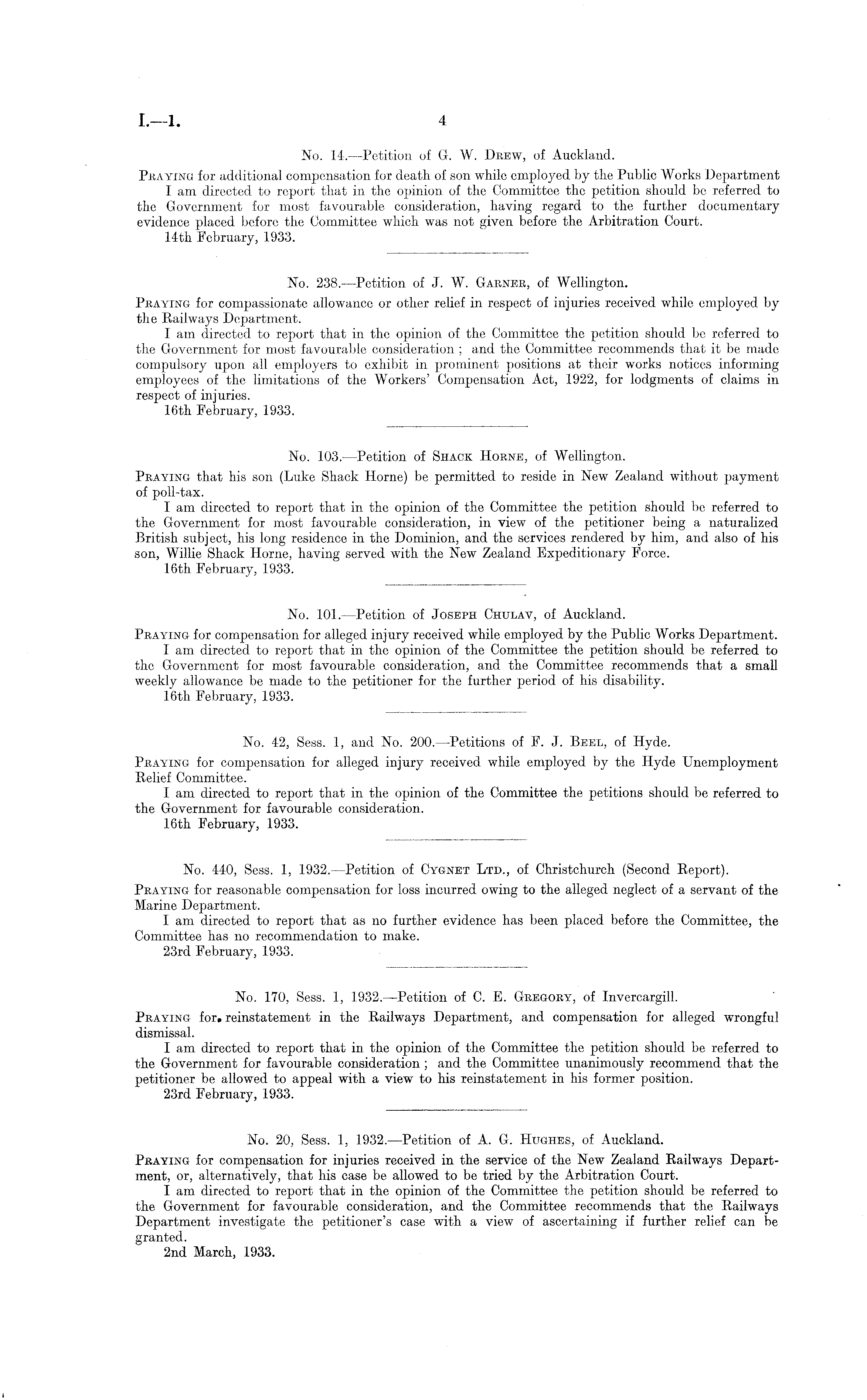No. 238. —Petition of J. W. Garner, of Wellington. Praying for compassionate allowance or other relief in respect of injuries received while employed by the Railways Department. I am directed to report that in the opinion of the Committee the petition should be referred to the Government for most favourable consideration ; and the Committee recommends that it be made compulsory upon all employers to exhibit in prominent positions at their works notices informing employees of the limitations of the Workers' Compensation Act, 1922, for lodgments of claims in respect of injuries. 16th February, 1933.