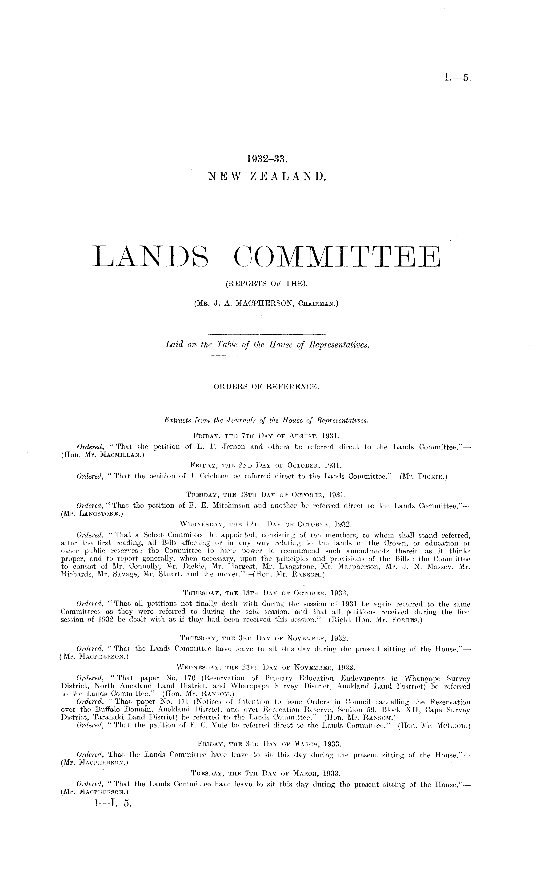 Extracts from the Journals of the House of Representatives. Friday, the 7th Day of Auoust, 1931. Ordered, " That the petition of L. P. Jensen and others be referred direct to the Lands Committee." — (Hon. Mr. Macmillan.) Friday, the 2nd Day oe October, 1931. Ordered, " That the petition of J. Criehton be referred direct to the Lands Committee." —(Mr. Dickie.) Tuesday, the 13th Day oe October, 1931. Ordered, " That the petition of F. E. Mitchinson and another be referred direct to the Lands Committee."— (Mr. Lanostone.) Wednesday, the 12th Day oe October, 1932. Ordered, " That a Select Committee be appointed, consisting of ten members, to whom shall stand referred, after the first reading, all Bills affecting or in any way relating to the lands of the Crown, or education or other public reserves; the Committee to have power to recommend such amendments therein as it thinks proper, and to report generally, when necessary, upon the principles and provisions of the Bills : the Committee to consist of Mr. Connolly, Mr. Dickie, Mr. H'argest, Mr. Langstone, Mr. Macpherson, Mr. J. N. Massey, Mr. Richards, Mr. Savage, Mr. Stuart, and the mover." —(Hon. Mr. Ransom.) Thursday, the 13th Day or October, 1932. Ordered, " That all petitions not finally dealt with during the session of 1931 be again referred to the same Committees as they were referred to during the said session, and that all petitions received during the first session of 1932 be dealt with as if they had been received this session." —(Right Hon. Mr. Forbes.) Thursday, the 3rd Day oe November, 1932. Ordered, " That the Lands Committee have leave to sit this day during the present sitting of the House."— (Mr. Macpherson.) Wednesday, the 23rd Day oe November, 1932. Ordered, " That paper No. 170 (Reservation of Primary Education Endowments in Whangape Survey District, North Auckland Land District, and Wharepapa Survey District-, Auckland Land District) be referred to the Lands Committee." —(Hon. Mr. Ransom.) Ordered, " That paper No. 171 (Notices of Intention to issue Orders in Council cancelling the Reservation over the Buffalo Domain, Auckland District, and over Recreation Reserve, Section 59, Block XII, Cape Survey District, Taranaki Land District) be referred to the Lands Committee." —(Hon. Mr. Ransom.) Ordered, "That the petition of F. C. Yule be referred direct to the Lands Committee." —(Hon. Mr. McLeod.) Friday, the 3rd Day oe March, 1933. Ordered, That the Lands Committee have leave to sit this day during the present sitting of the House."— (Mr. Macpherson.) Tuesday, the 7th Day oe March, 1933. Ordered, " That the Lands Committee have leave to sit this day during the present sitting of the House." — (Mr. Macpherson.)